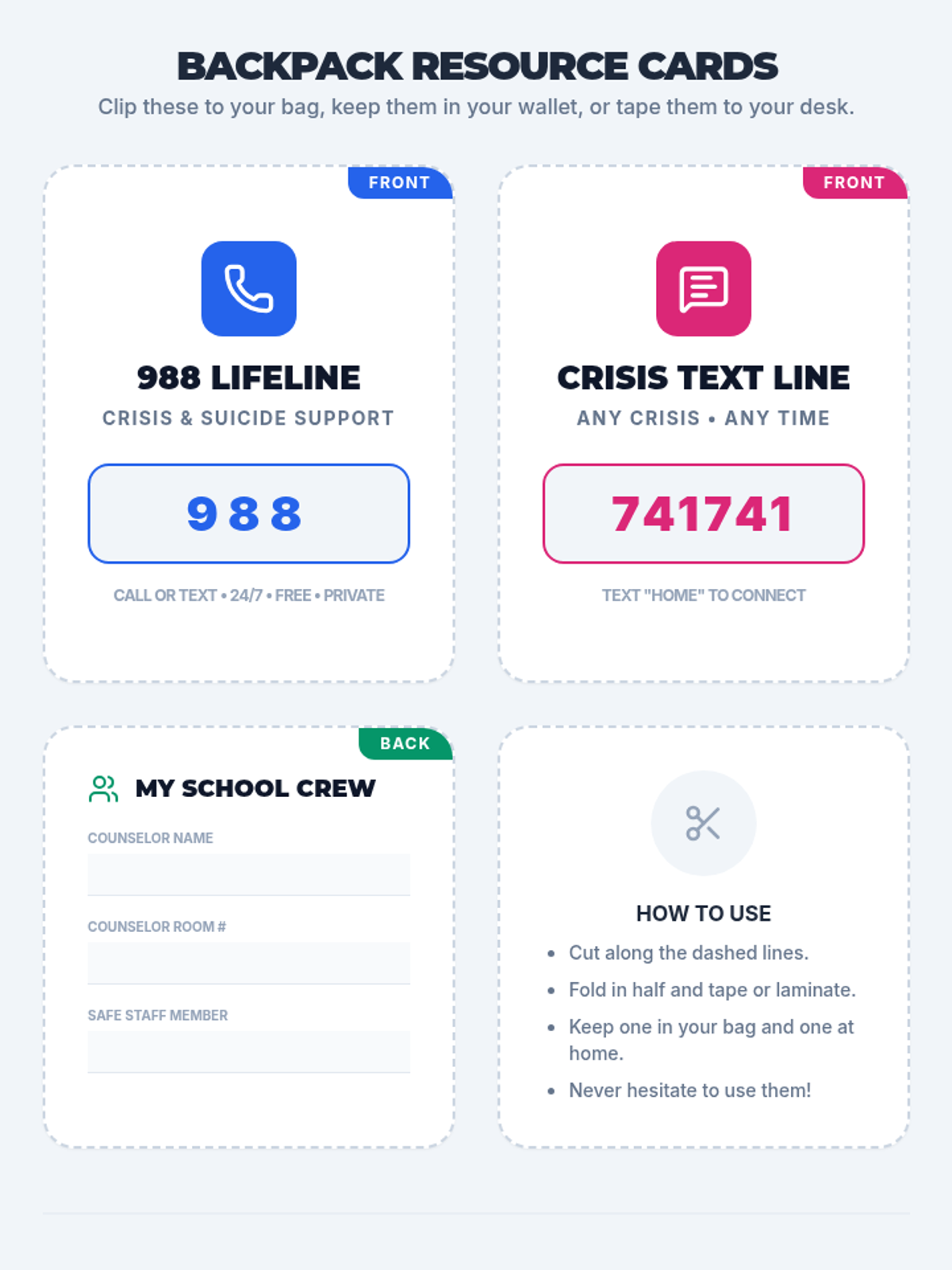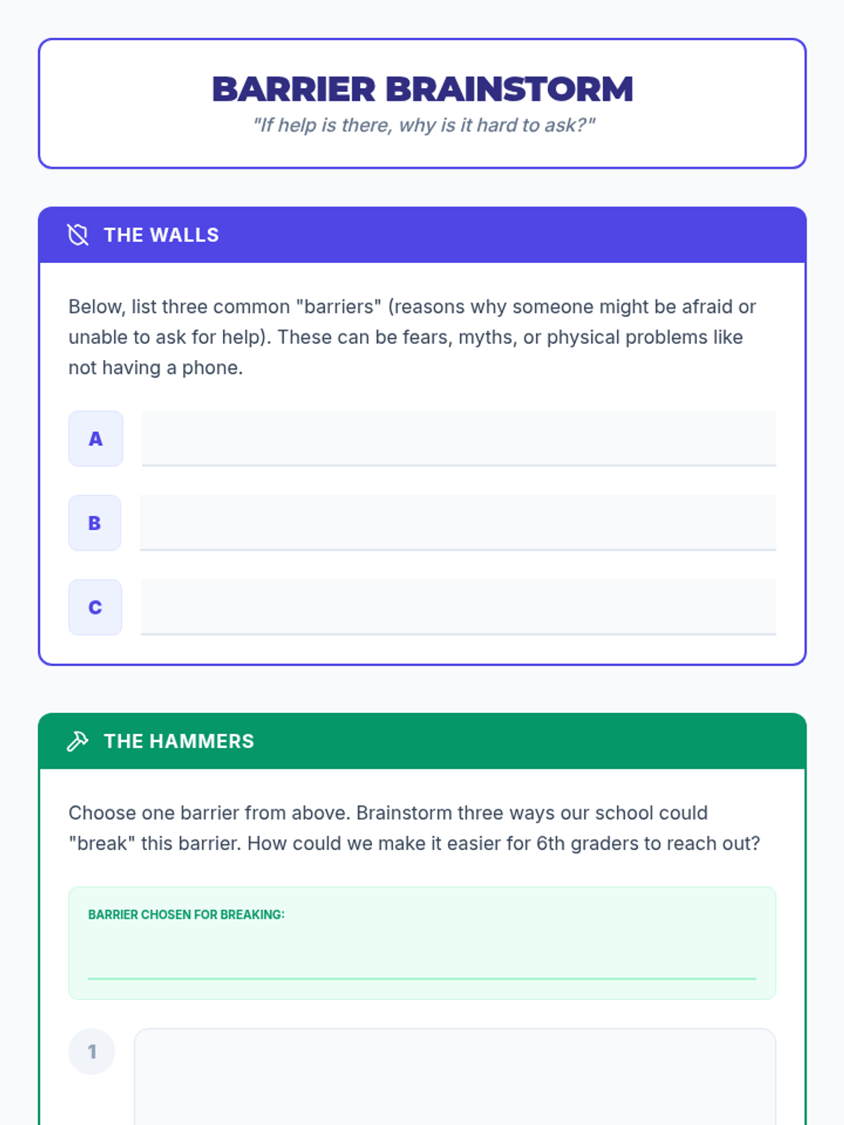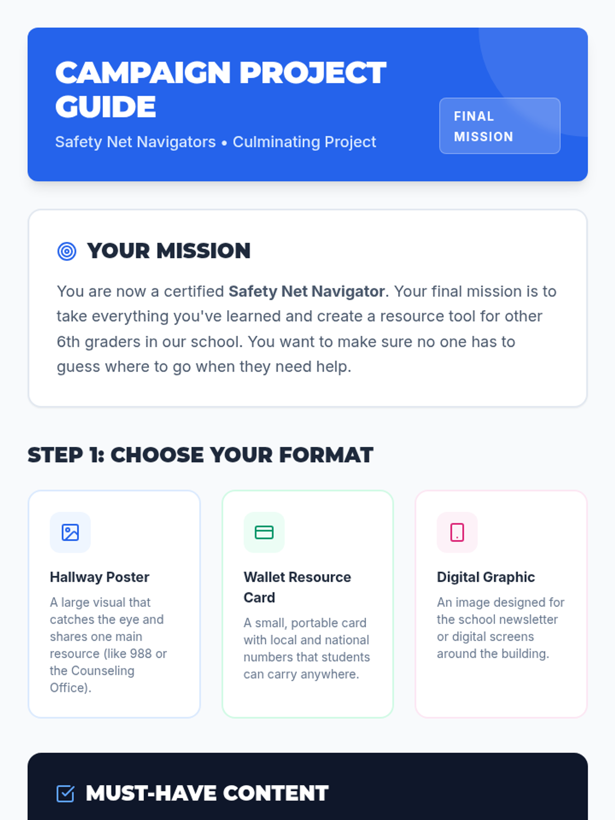 A project-based unit where 6th-grade students explore school, community, and national mental health resources. Students learn to navigate help-seeking pathways and conclude by creating resource materials for their school community.