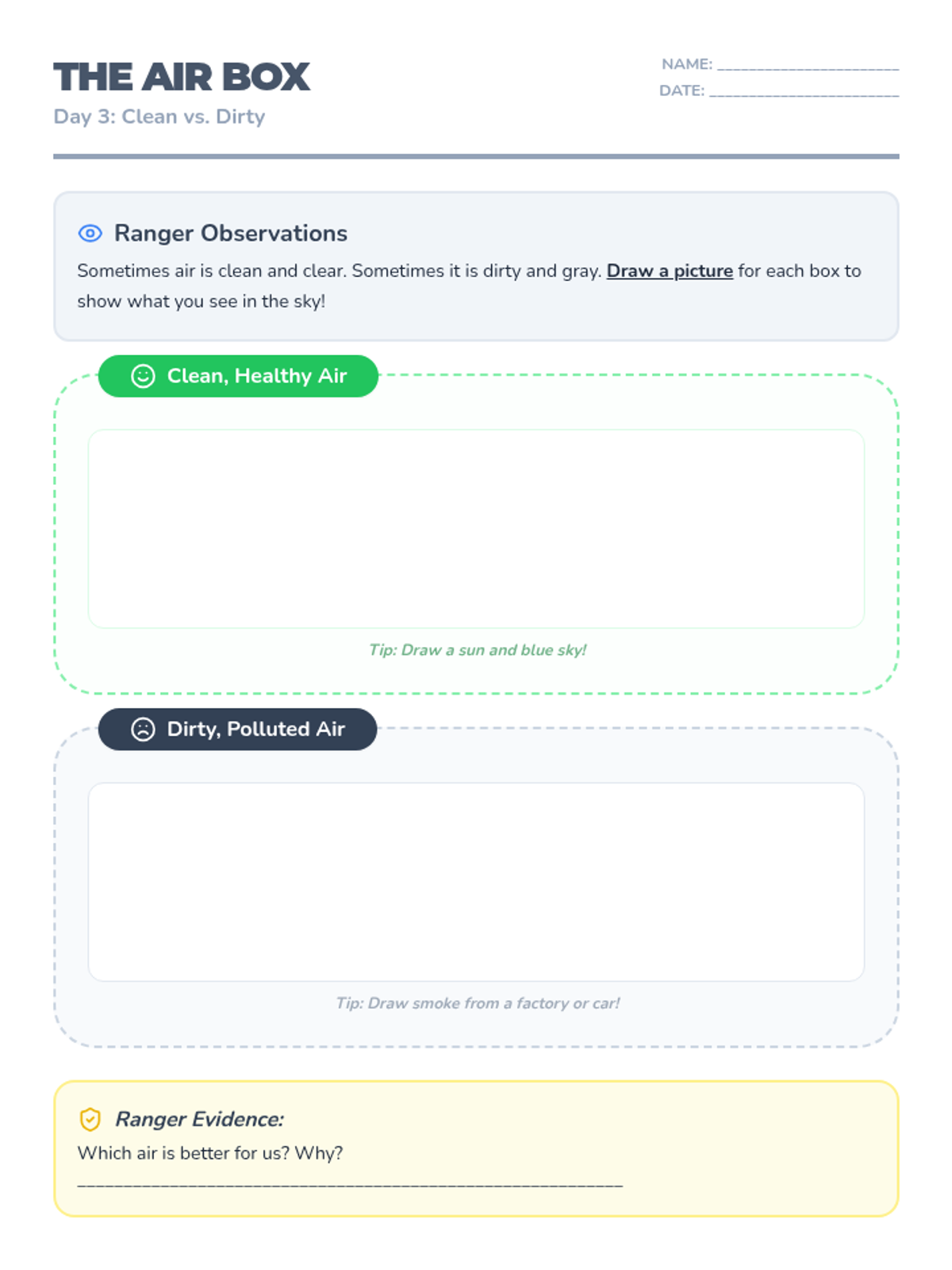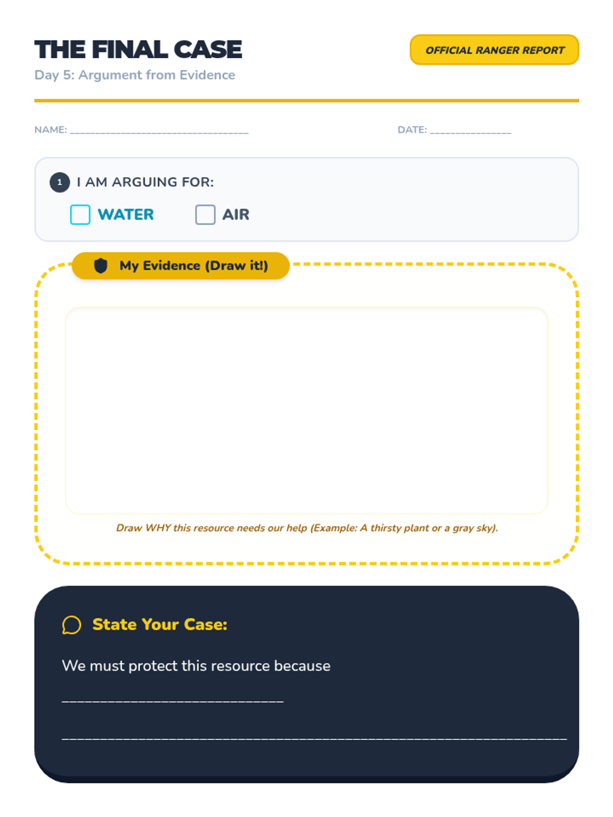 A comprehensive one-week unit for 1st grade students focused on identifying water and air as natural resources and learning how to protect them through evidence-based arguments. Students transform into 'Resource Rangers' to investigate, observe, and defend our planet's vital resources.
