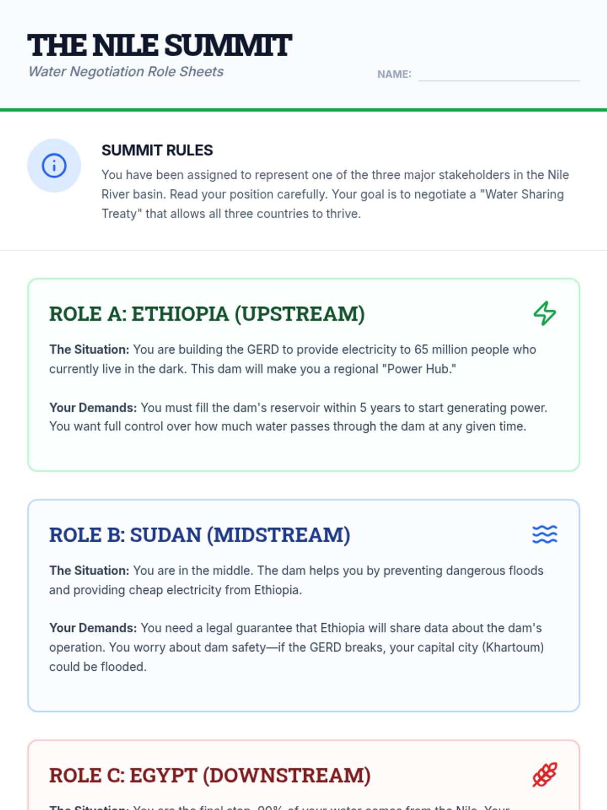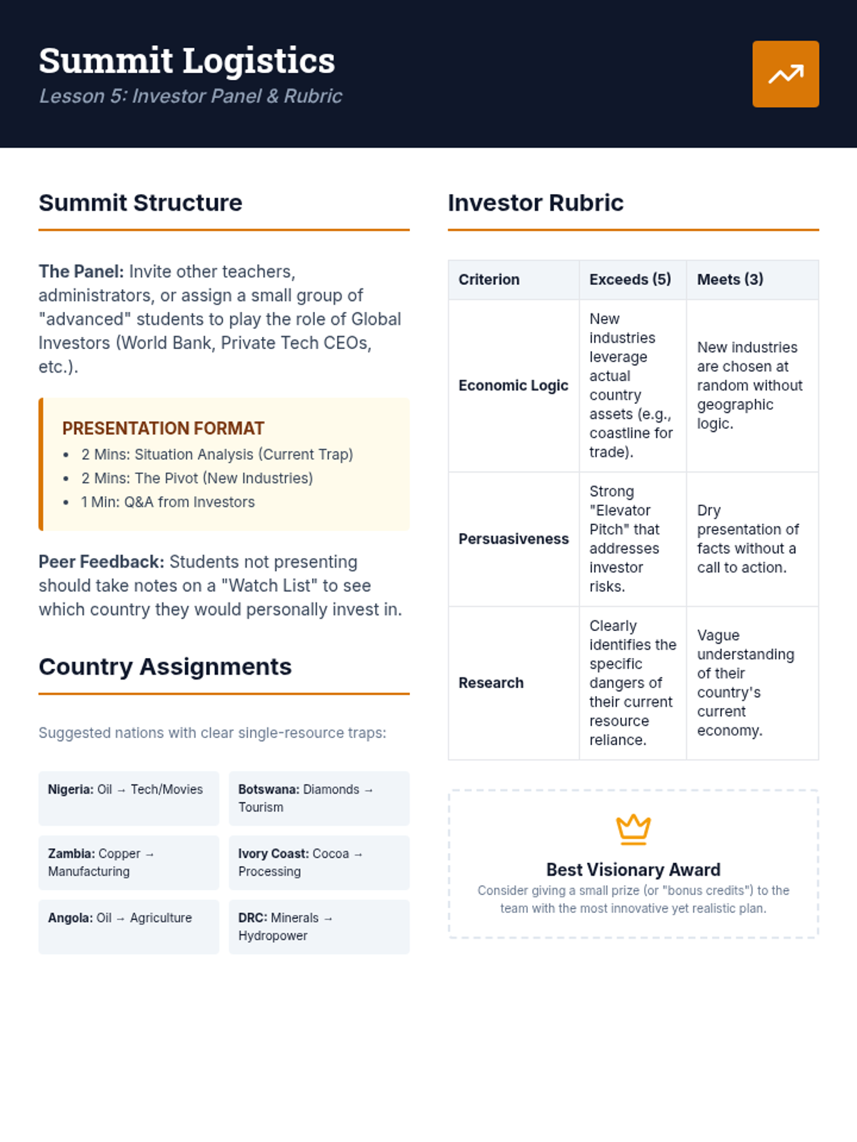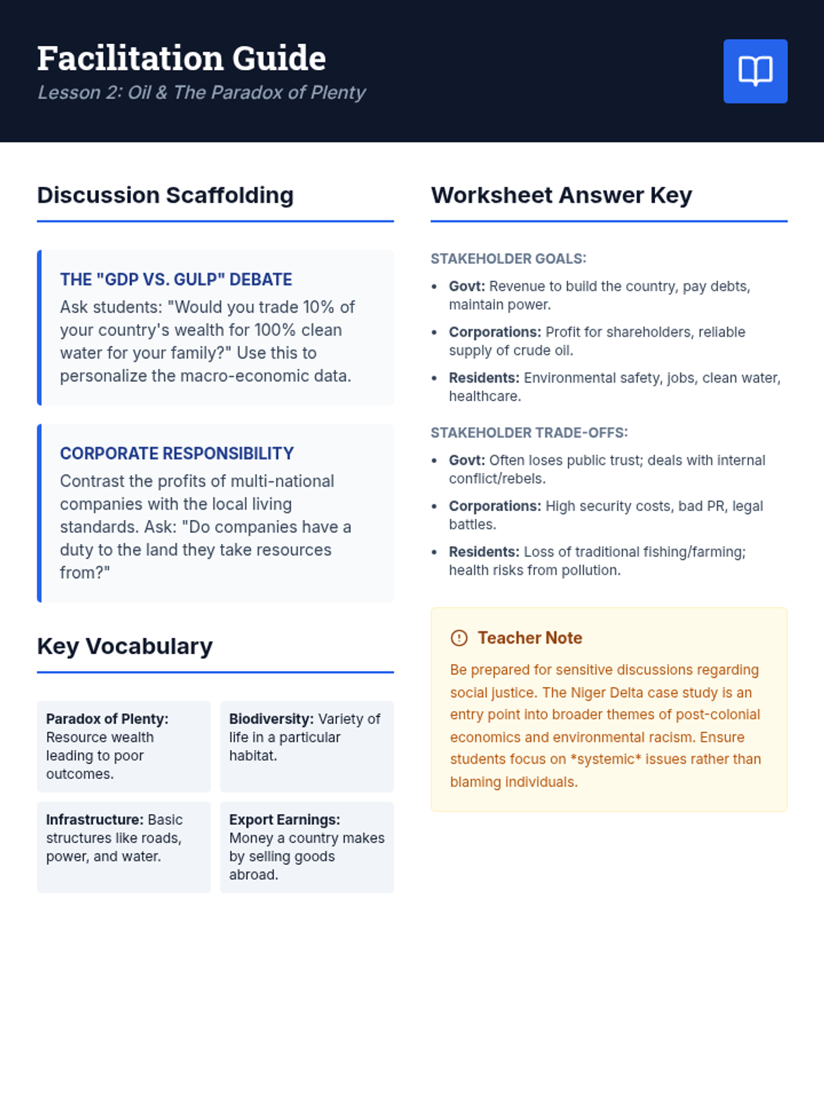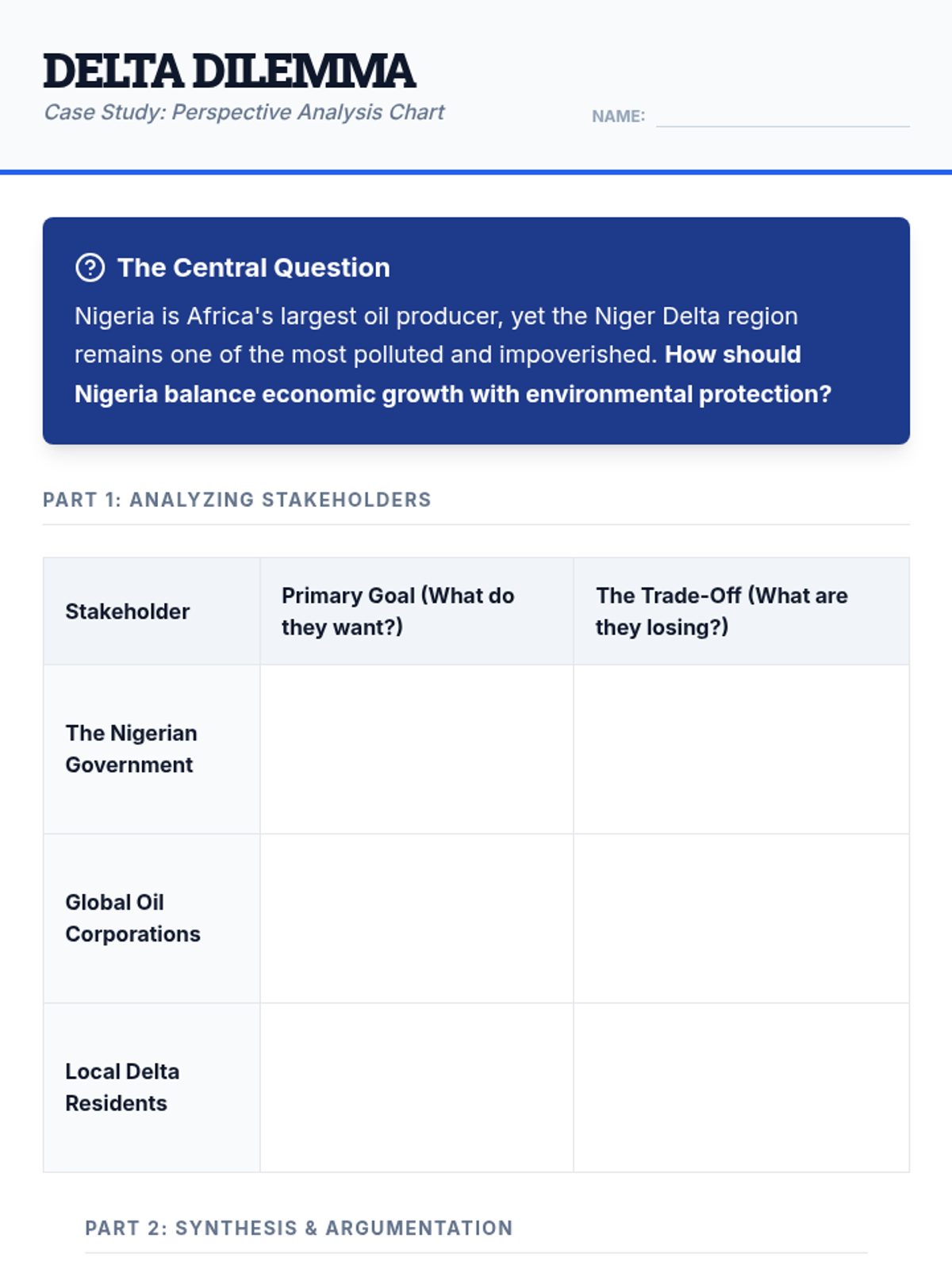 A project-based exploration of Africa's natural resources, economic development, and environmental impact. Students analyze thematic maps, investigate the 'resource curse' in the Niger Delta, simulate the diamond trade, debate Nile water rights, and propose economic diversification strategies.