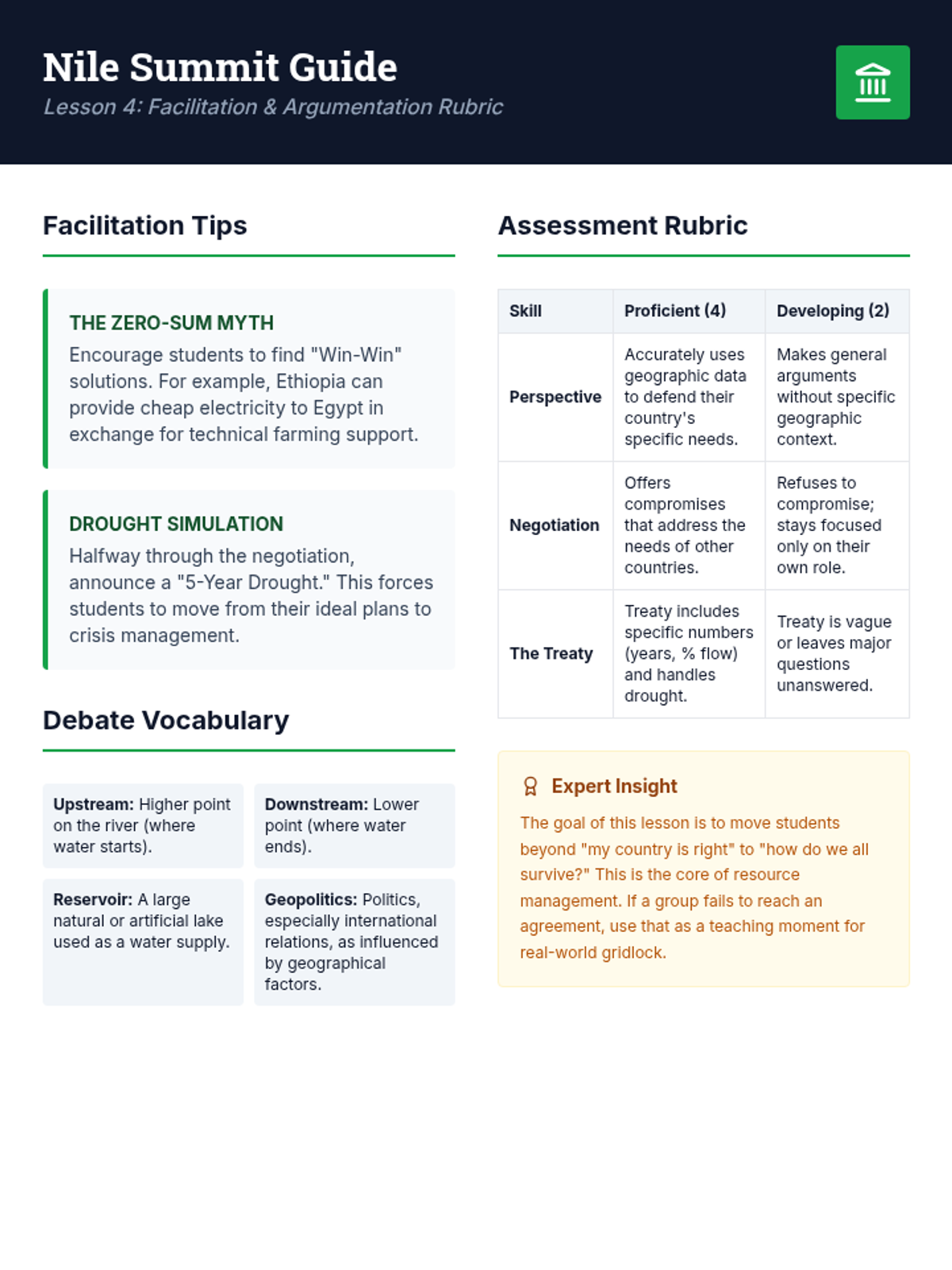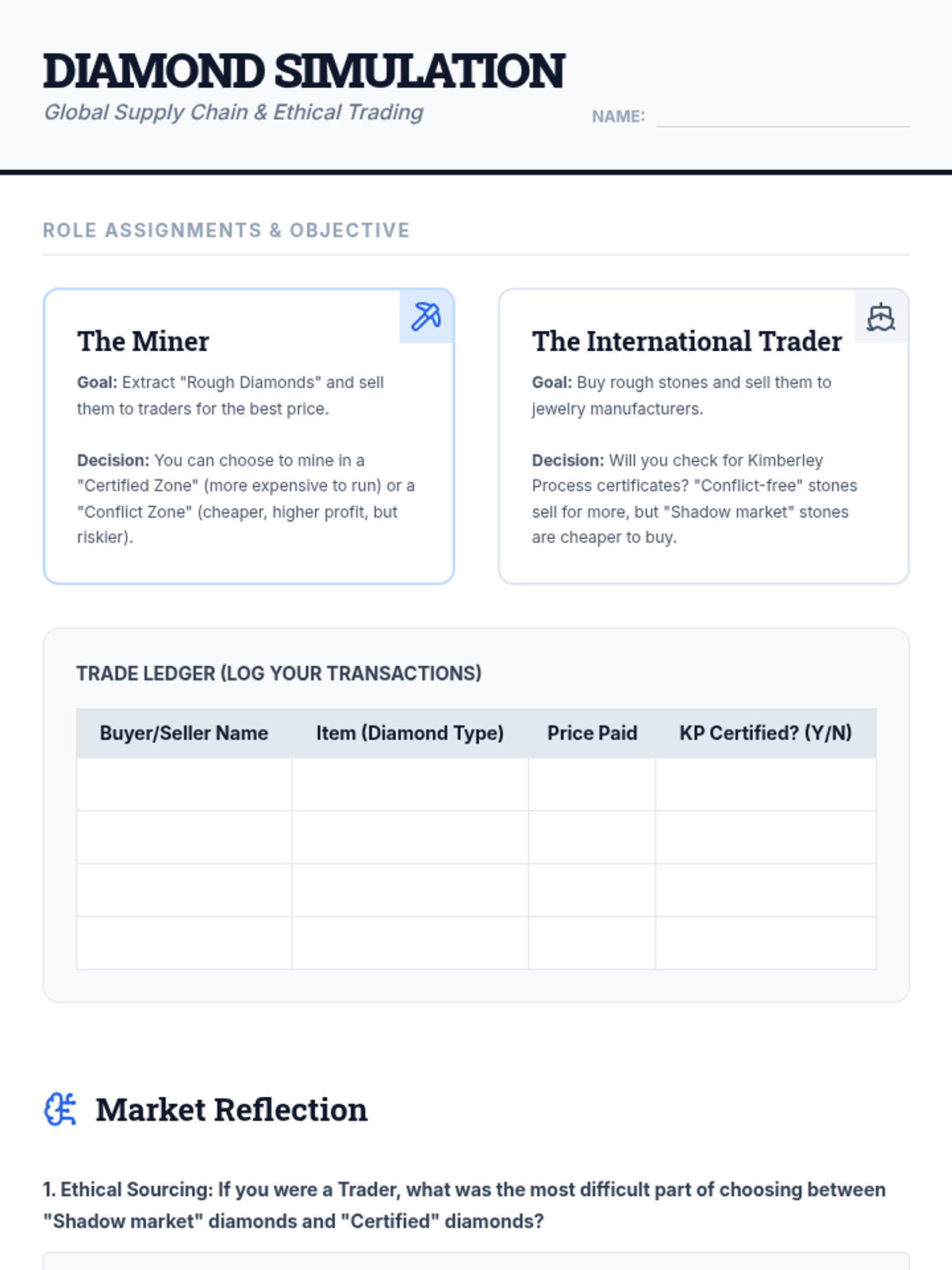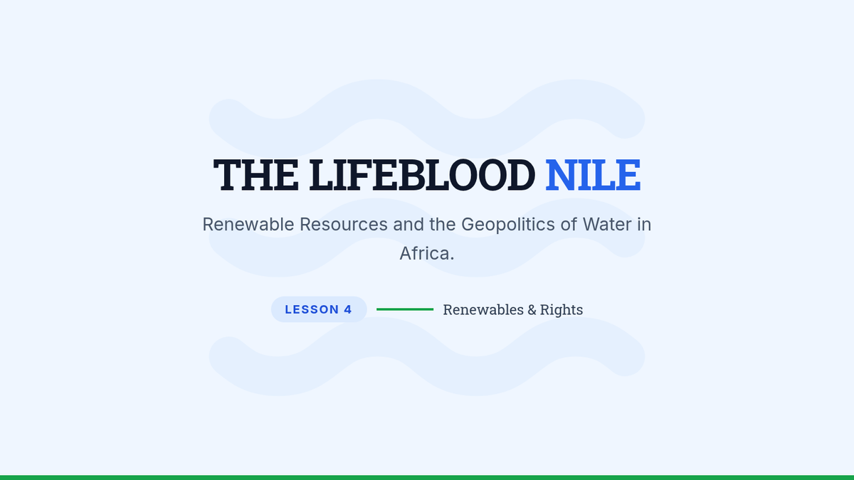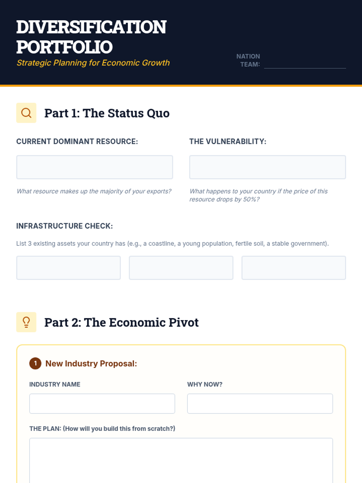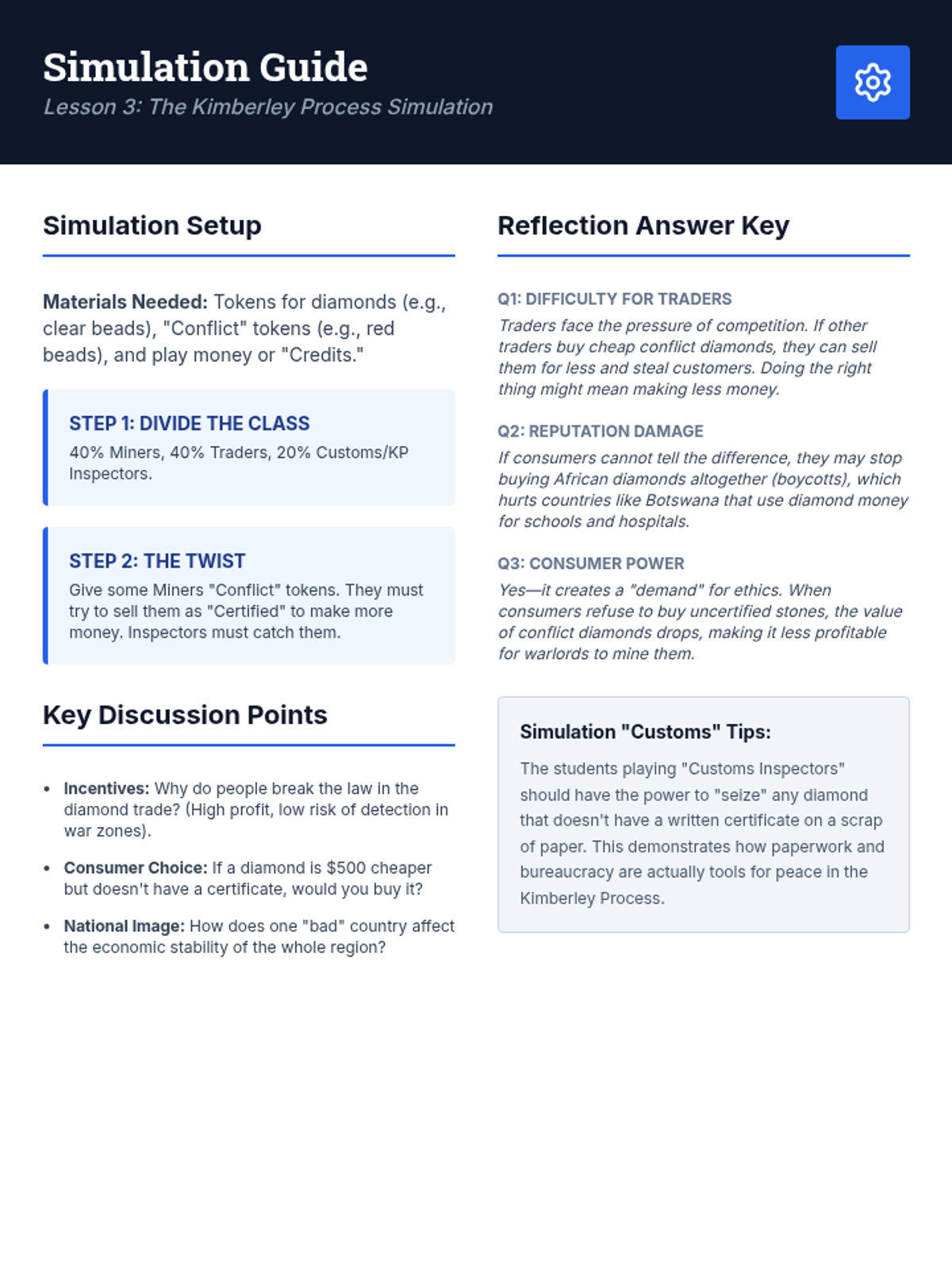 A project-based exploration of Africa's natural resources, economic development, and environmental impact. Students analyze thematic maps, investigate the 'resource curse' in the Niger Delta, simulate the diamond trade, debate Nile water rights, and propose economic diversification strategies.