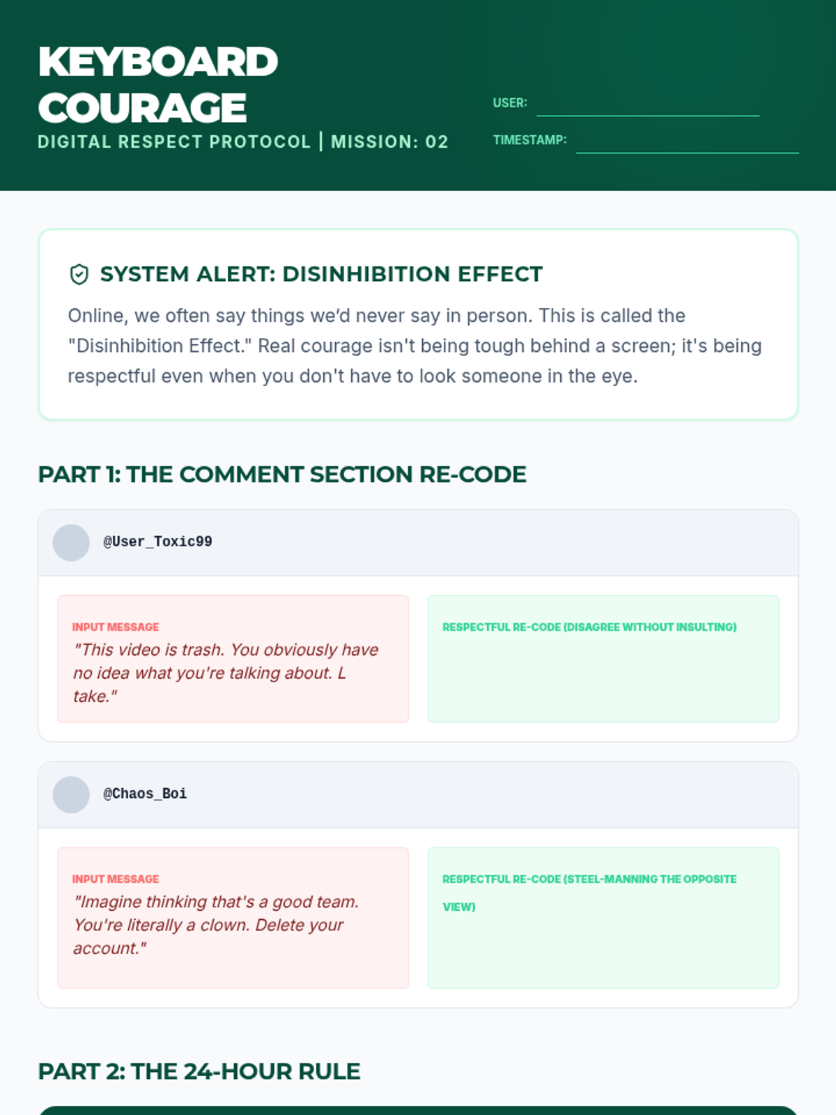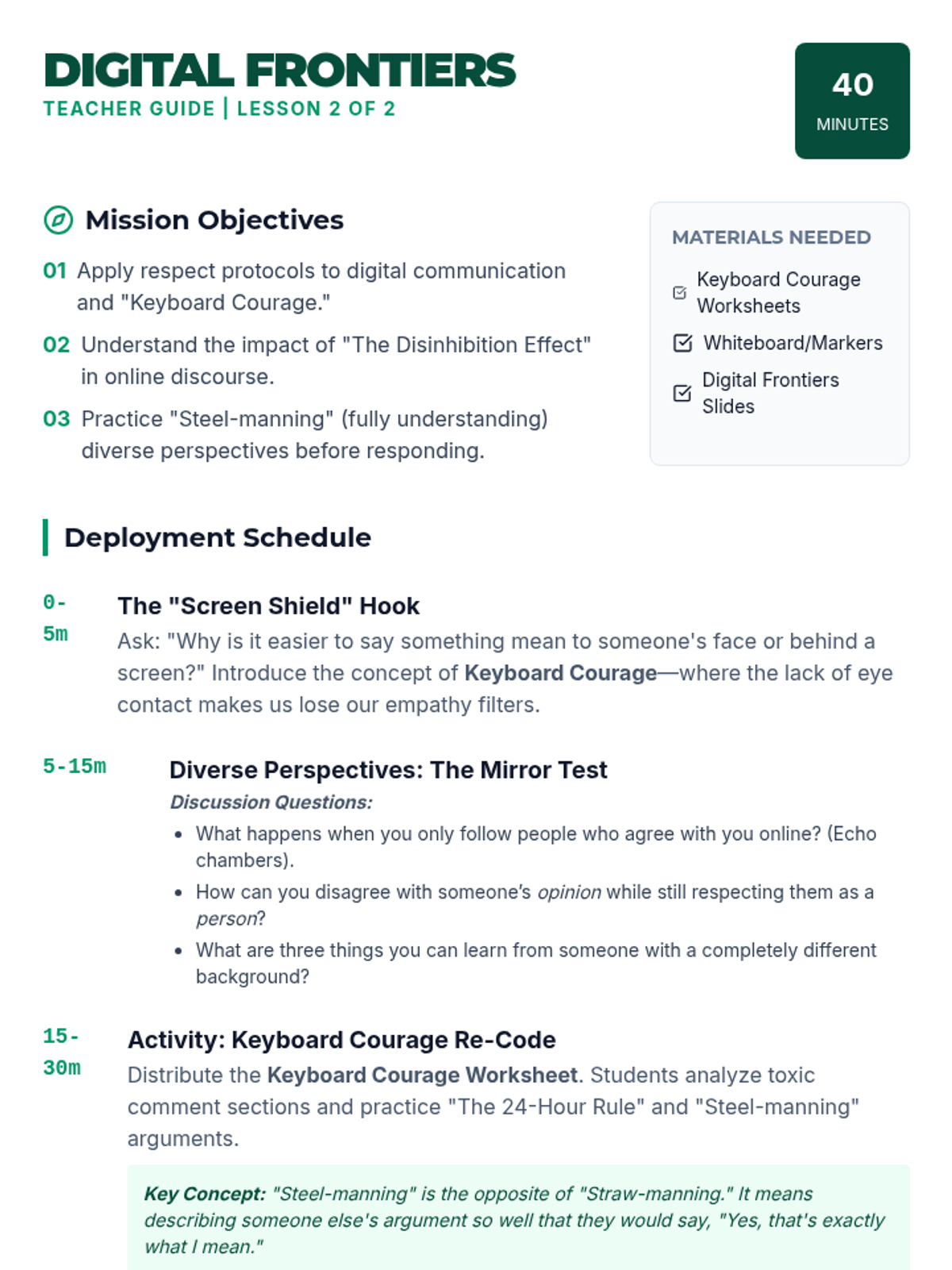 A two-part series designed for 8th-grade boys to master the art of respect through real-world scenarios, focusing on authority, communication, and digital citizenship.