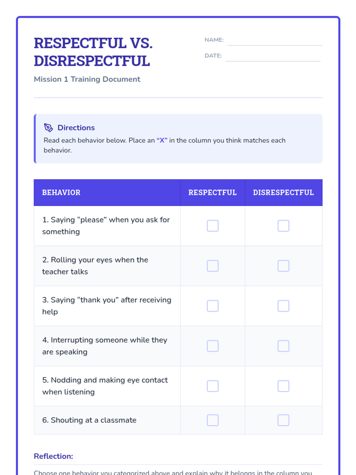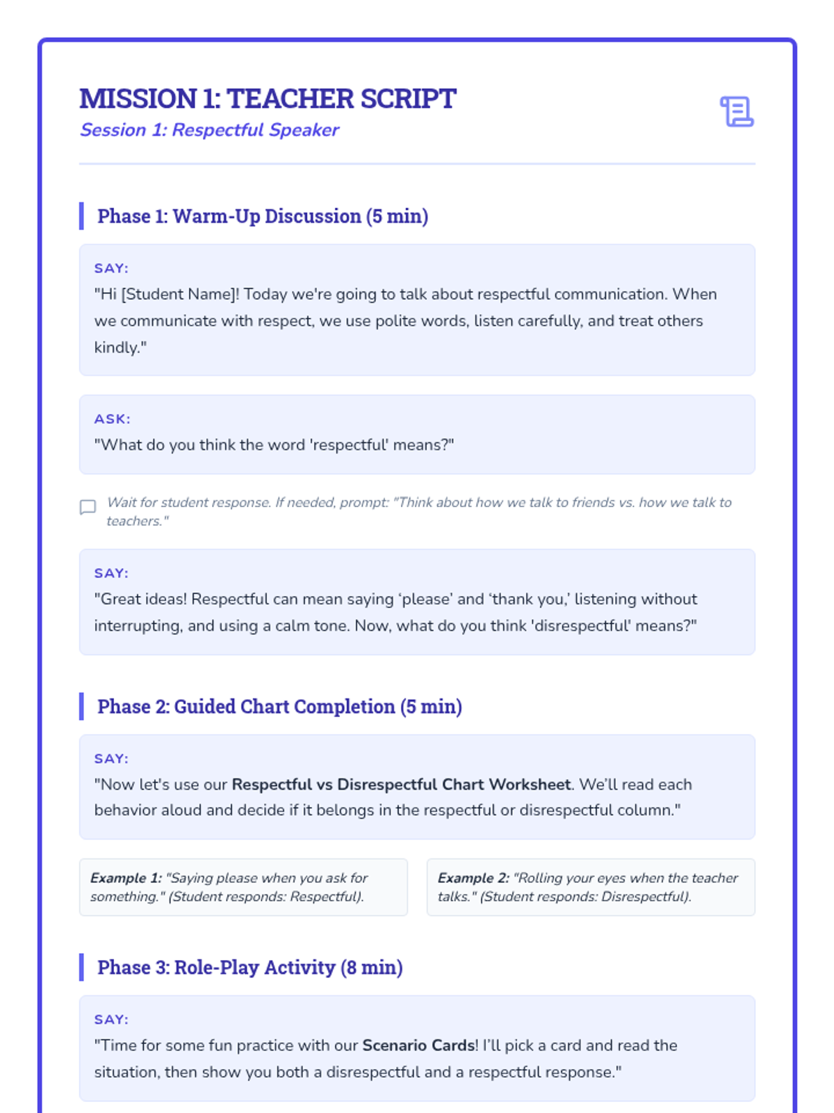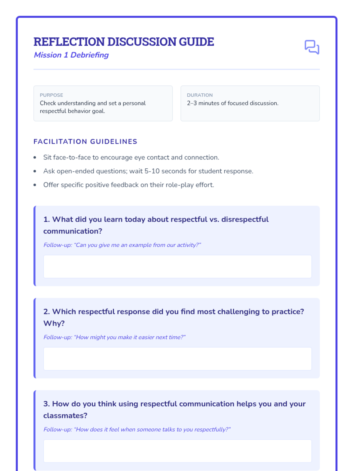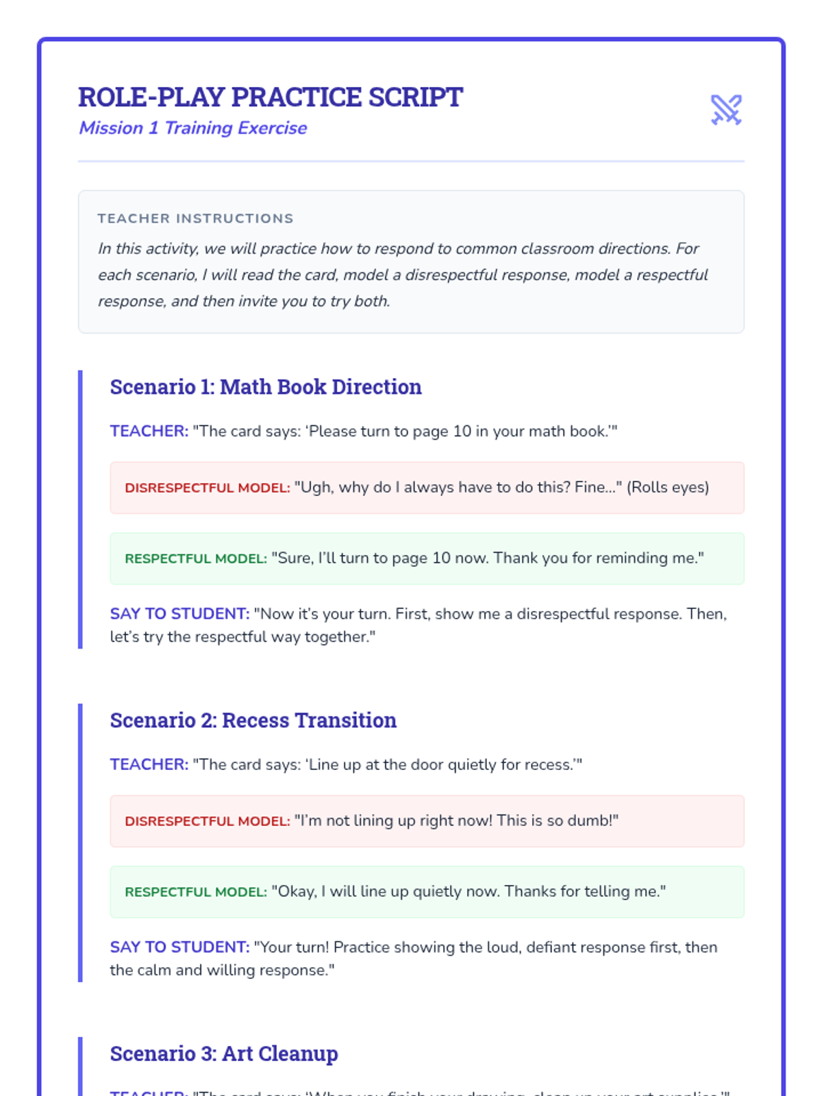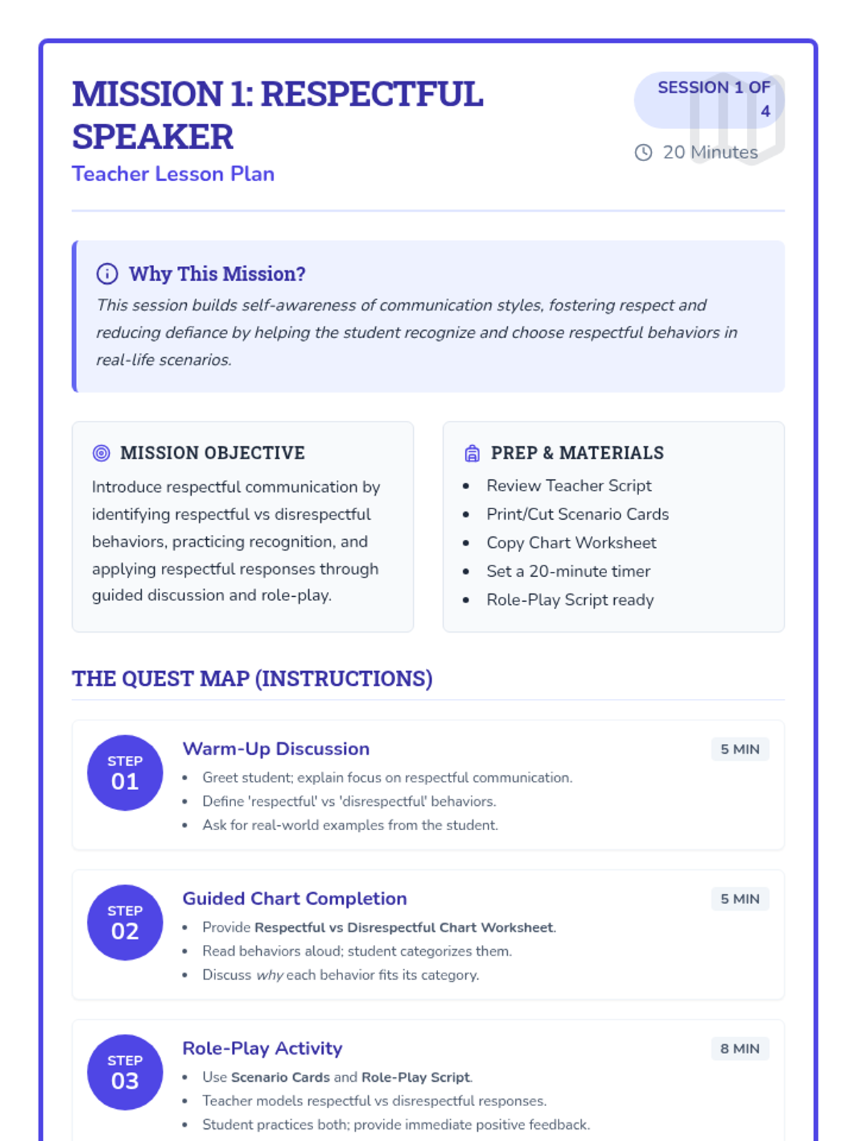 A four-session Tier 3 intervention for fourth-grade students focusing on respectful communication, following directions, and self-motivation through a quest-themed adventure.