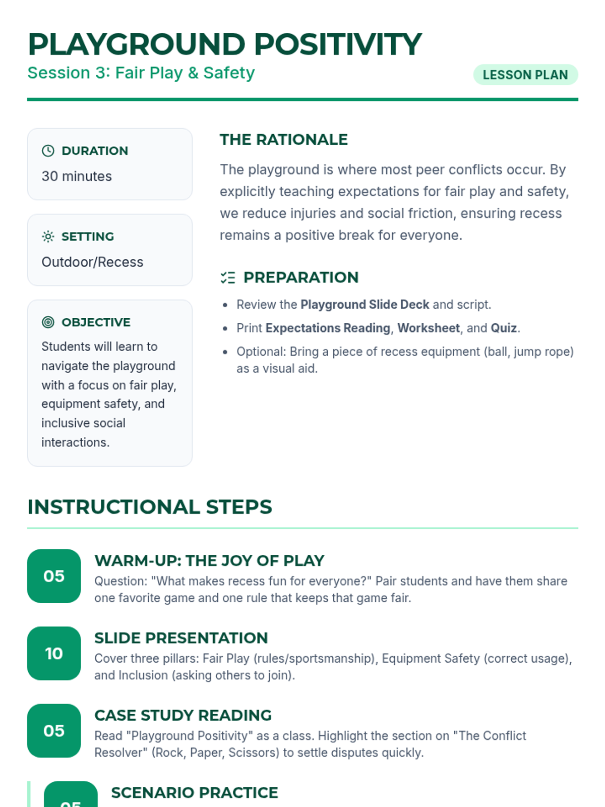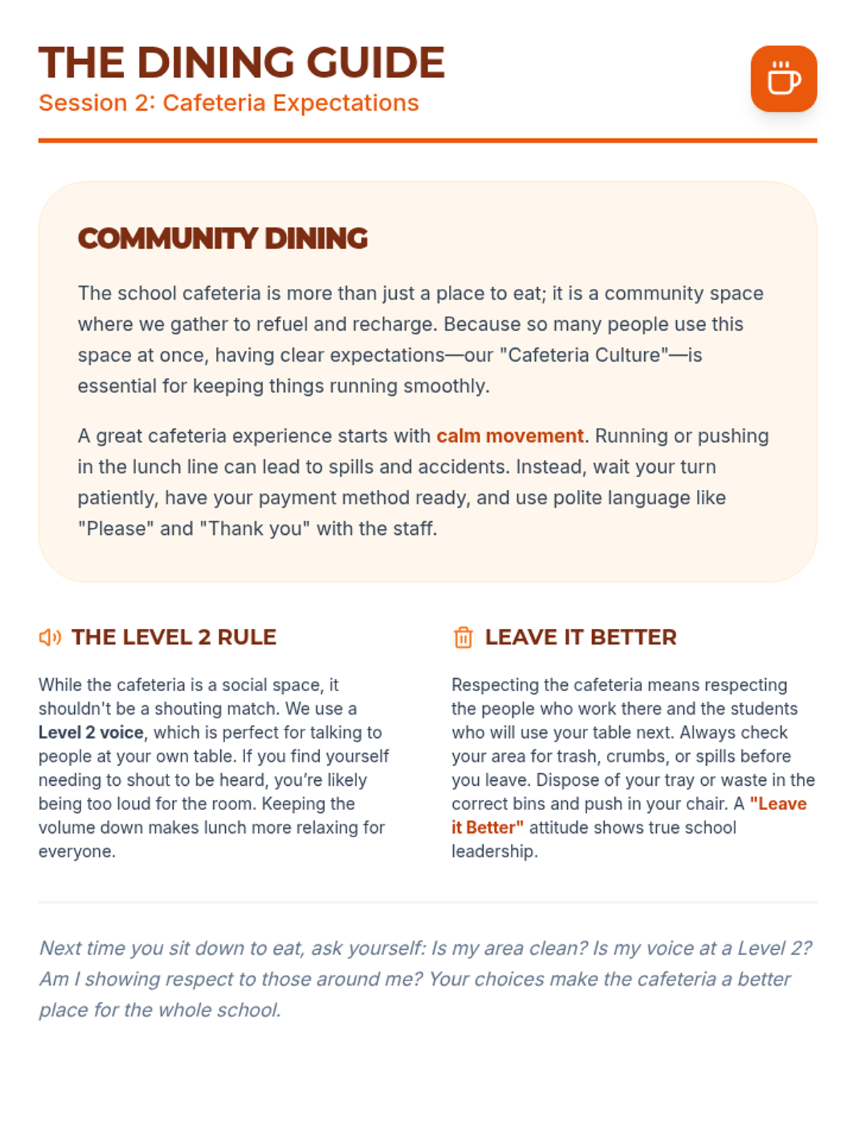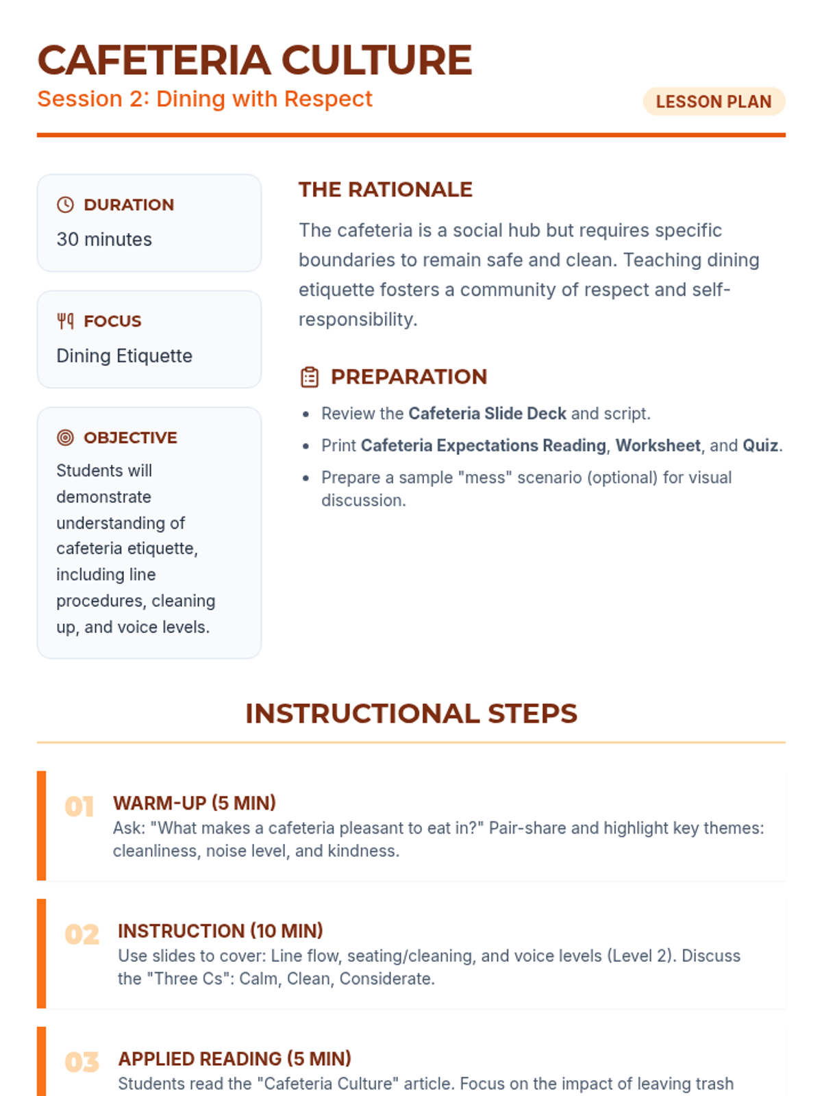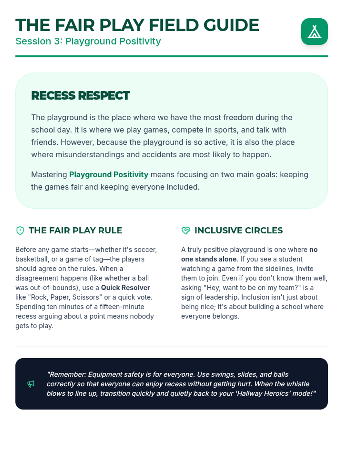 A three-session social-emotional learning series for middle schoolers focusing on school-wide behavior expectations in the hallway, cafeteria, and playground. Students learn to navigate common spaces with respect, safety, and responsibility through interactive discussions, reading, and practice.