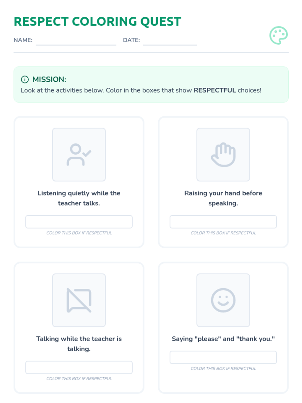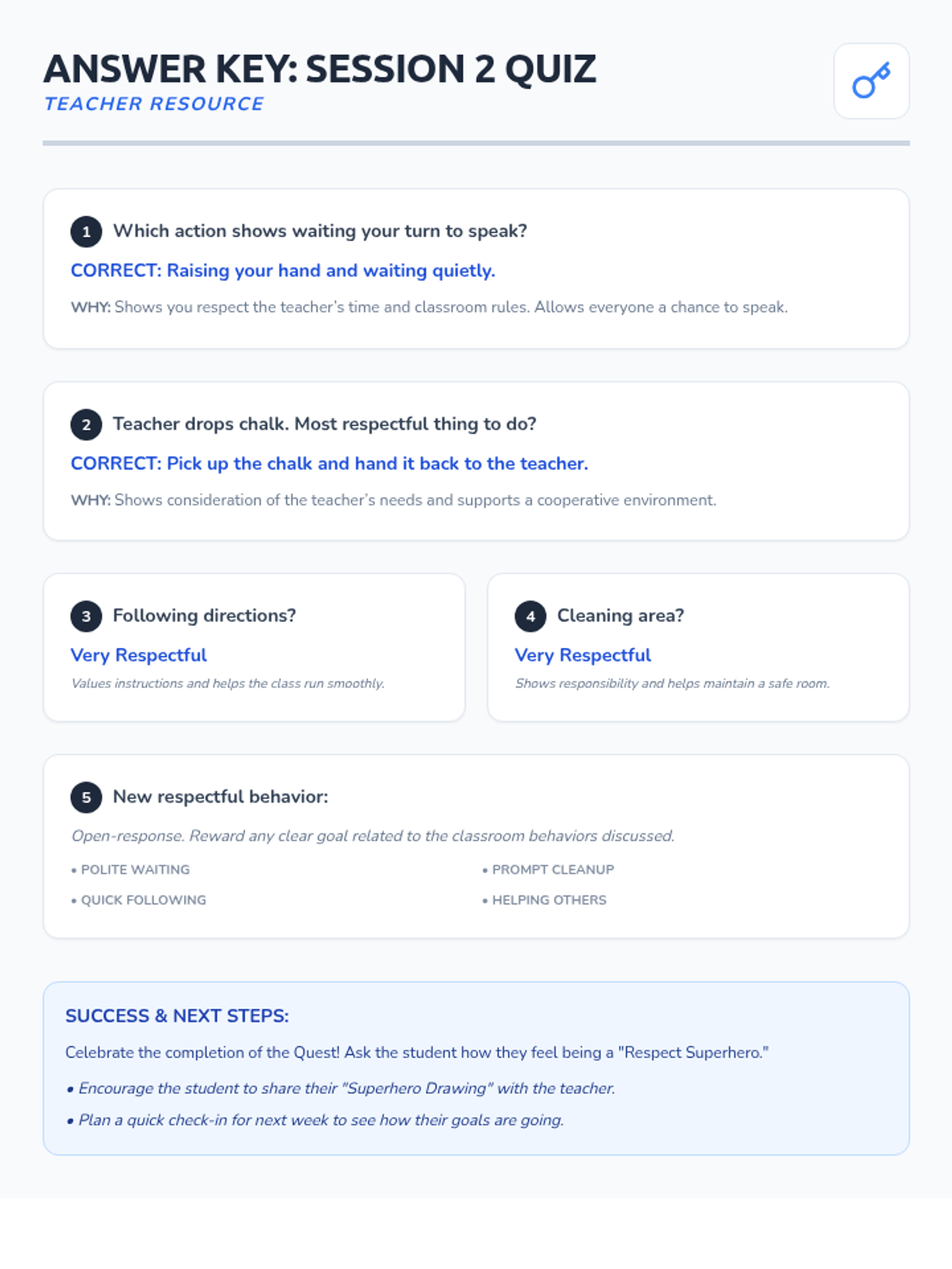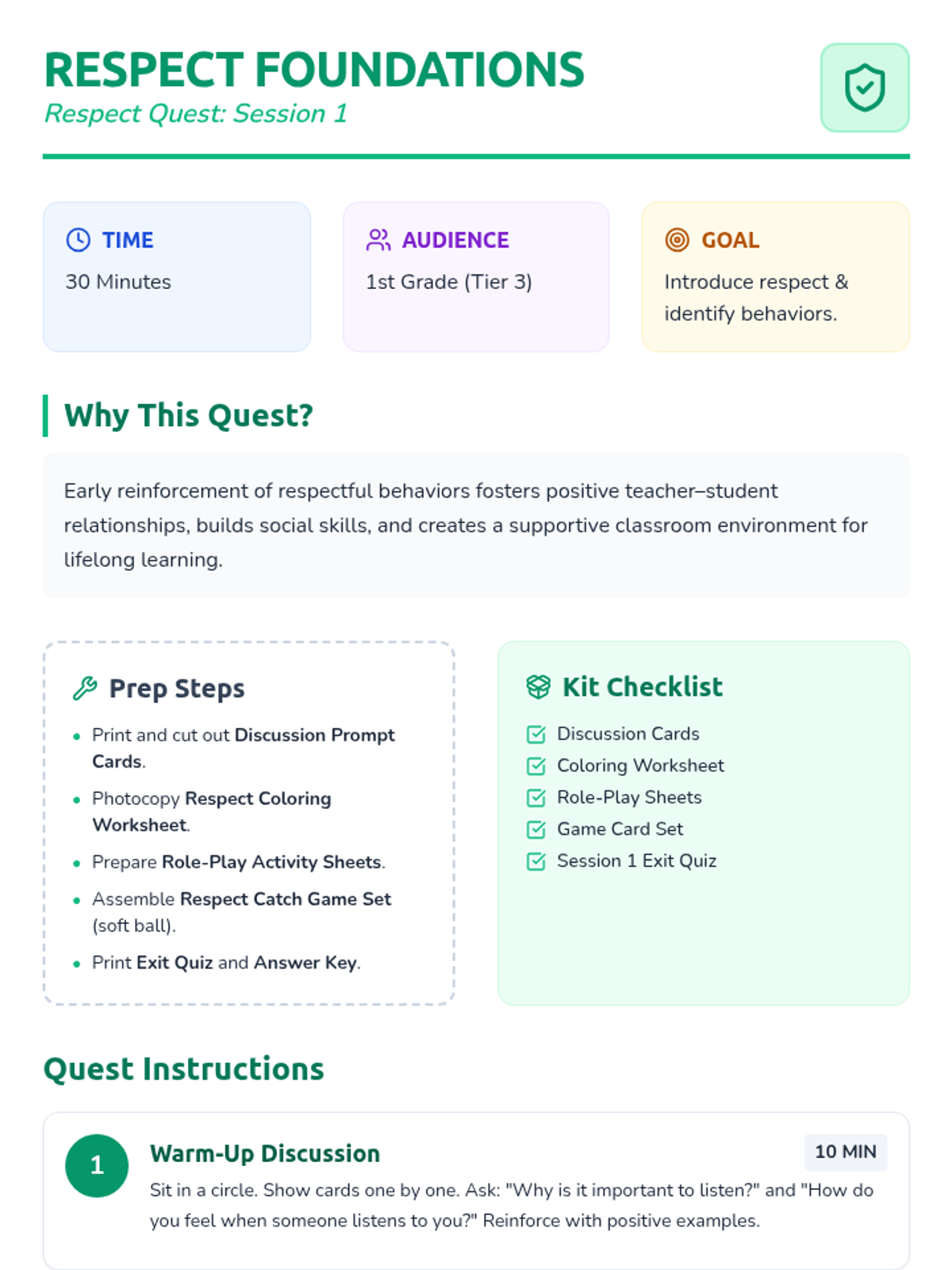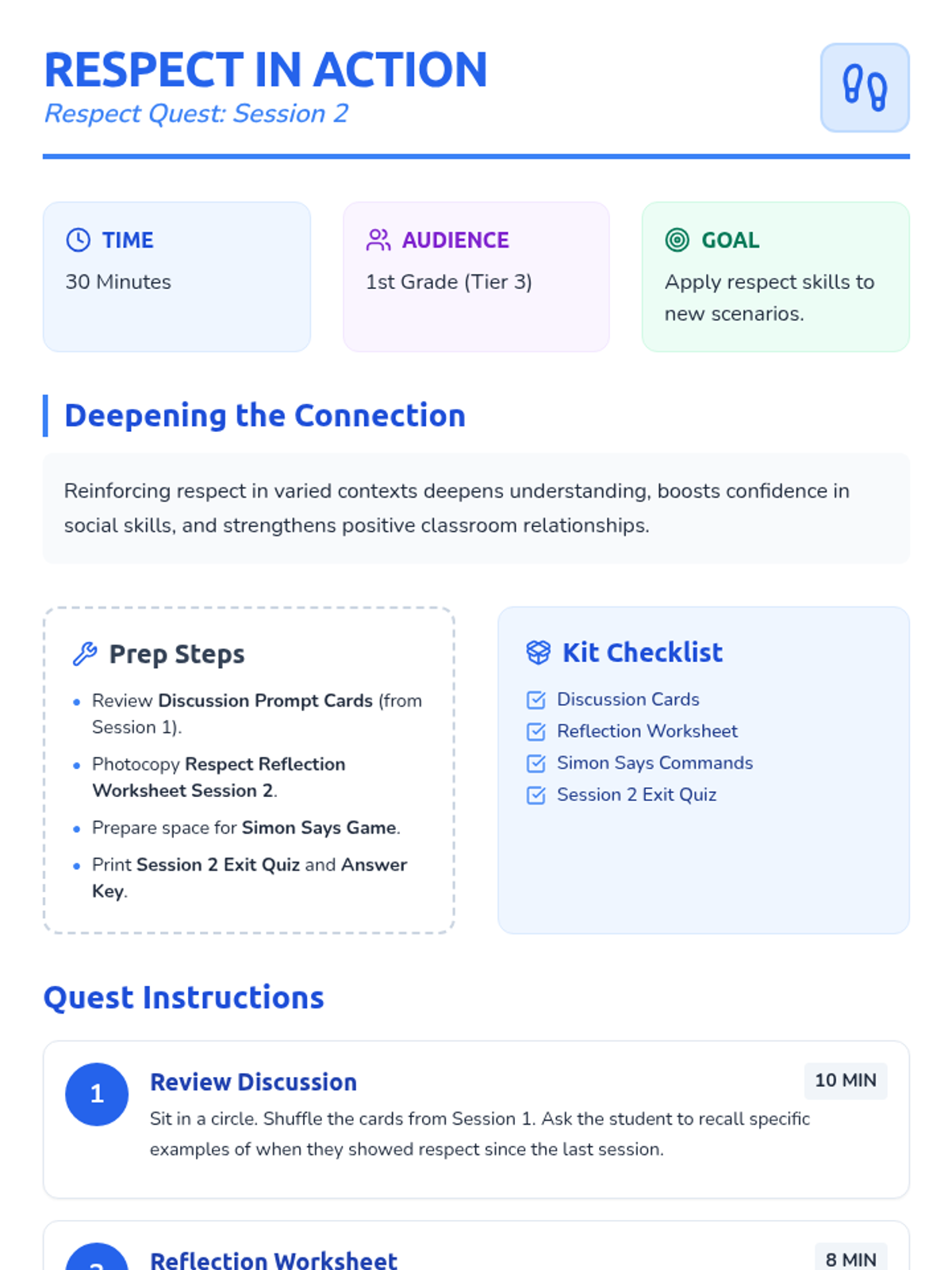A two-session individual intervention teaching 1st graders the foundational skills of showing respect to their teacher through interactive games, role-play, and creative reflection.
