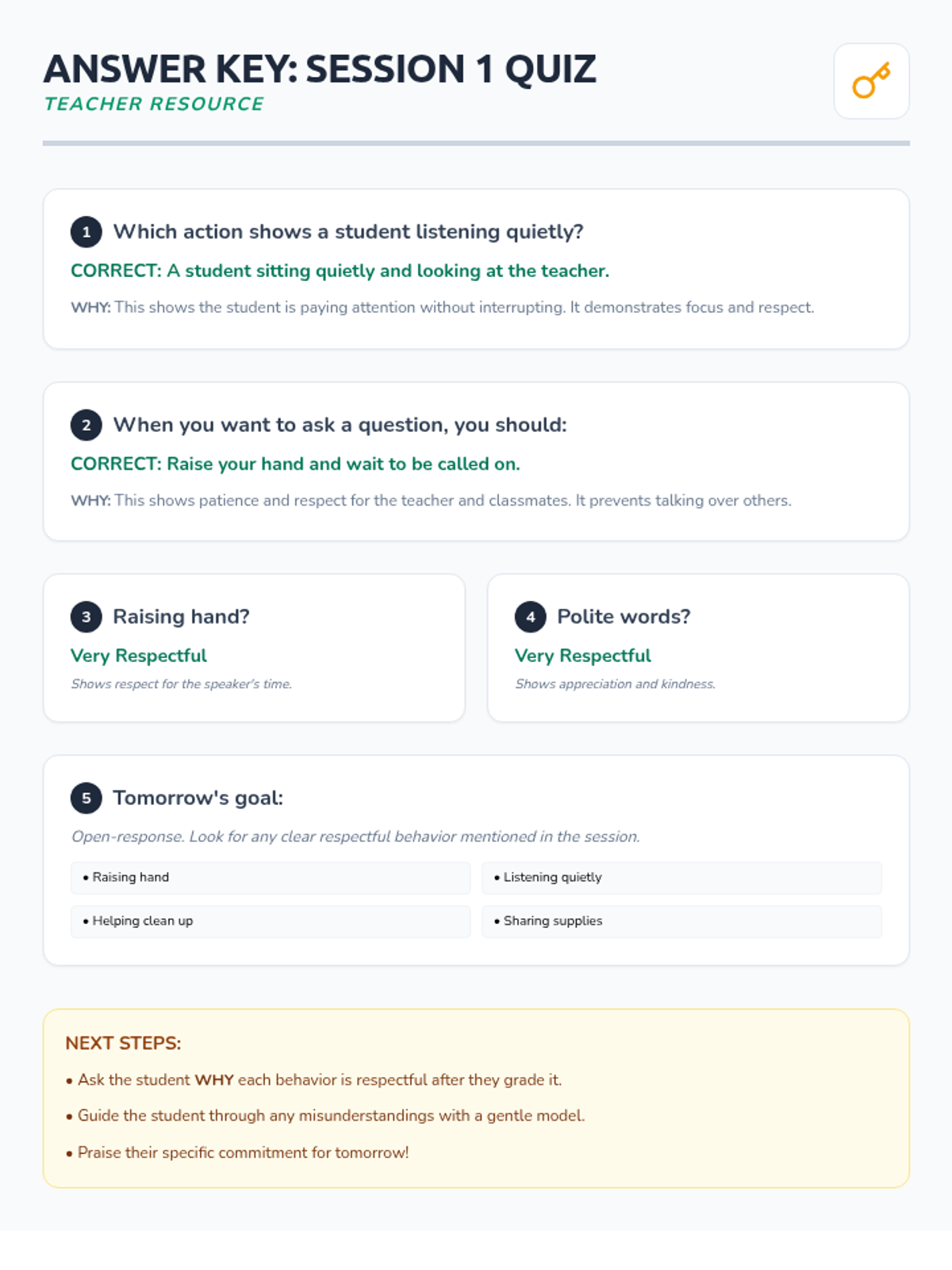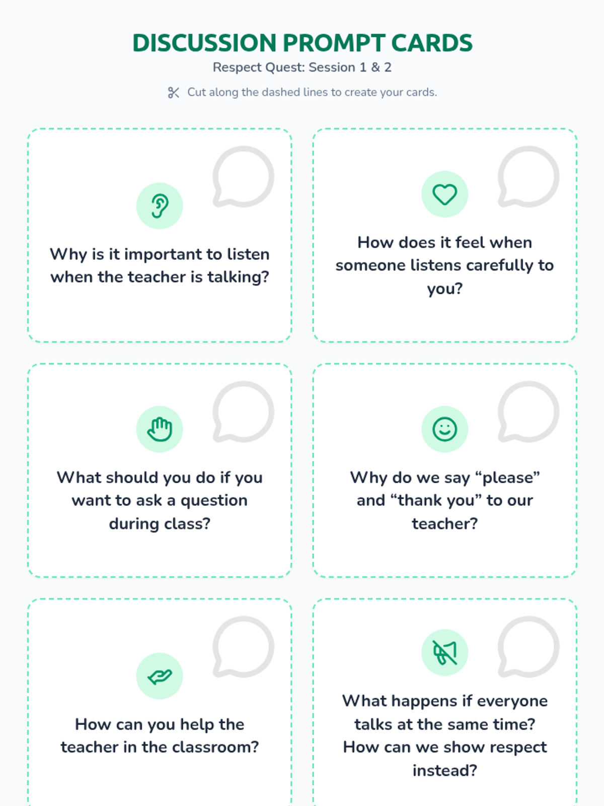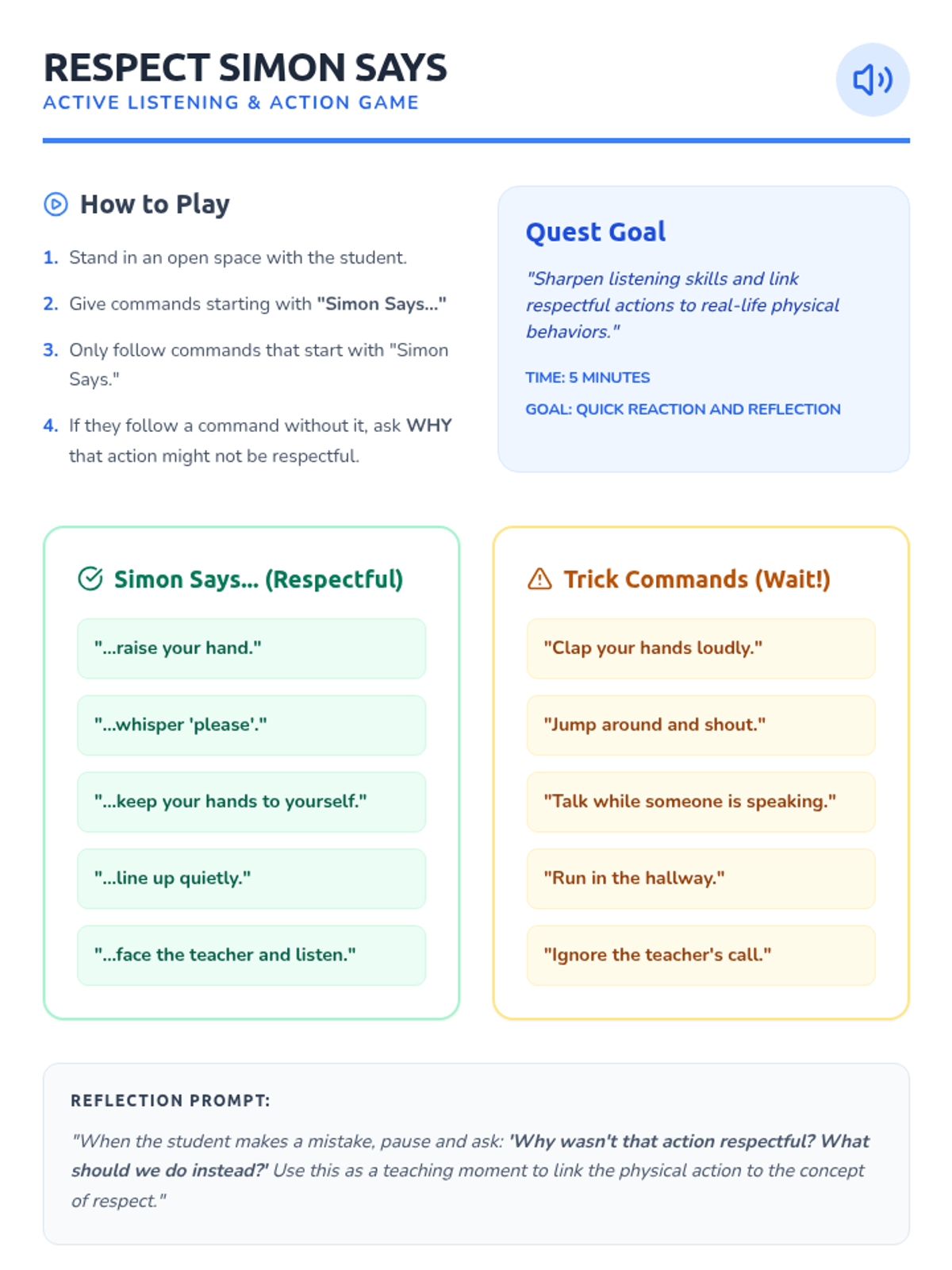 A two-session individual intervention teaching 1st graders the foundational skills of showing respect to their teacher through interactive games, role-play, and creative reflection.