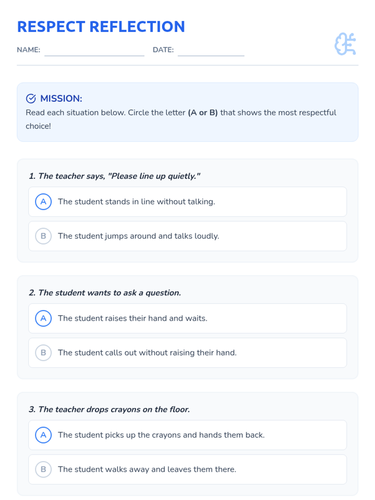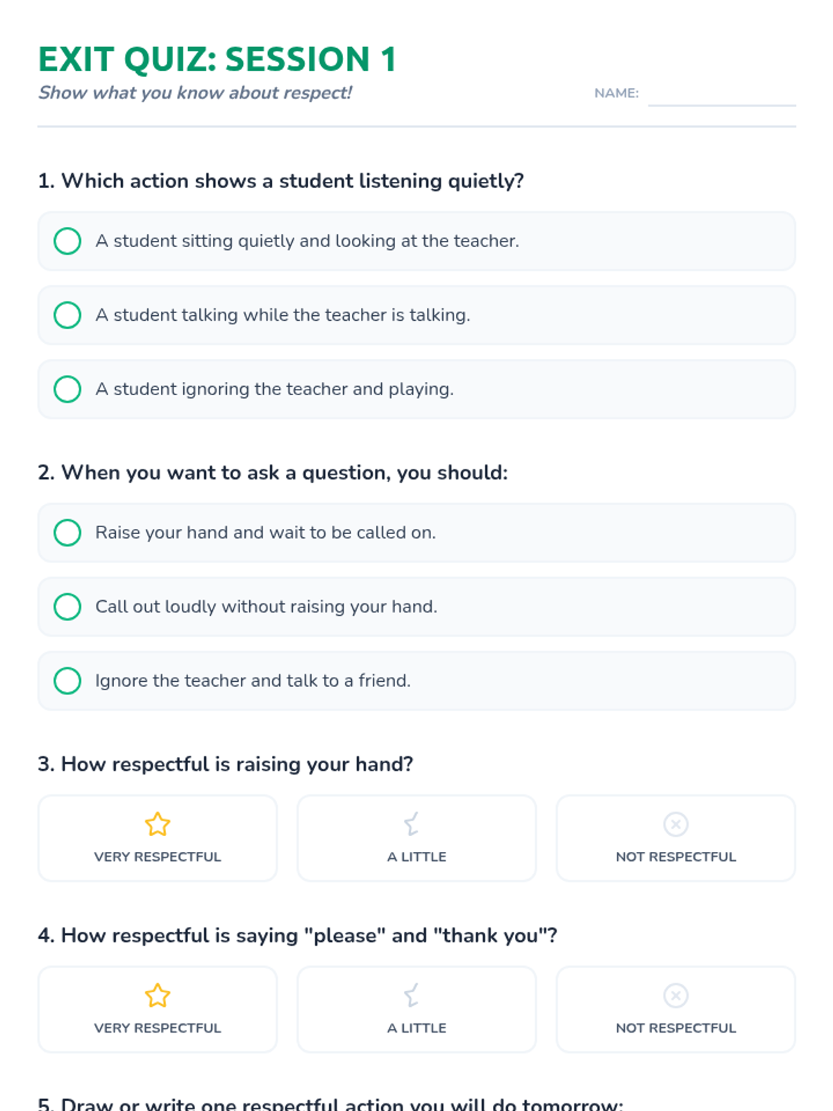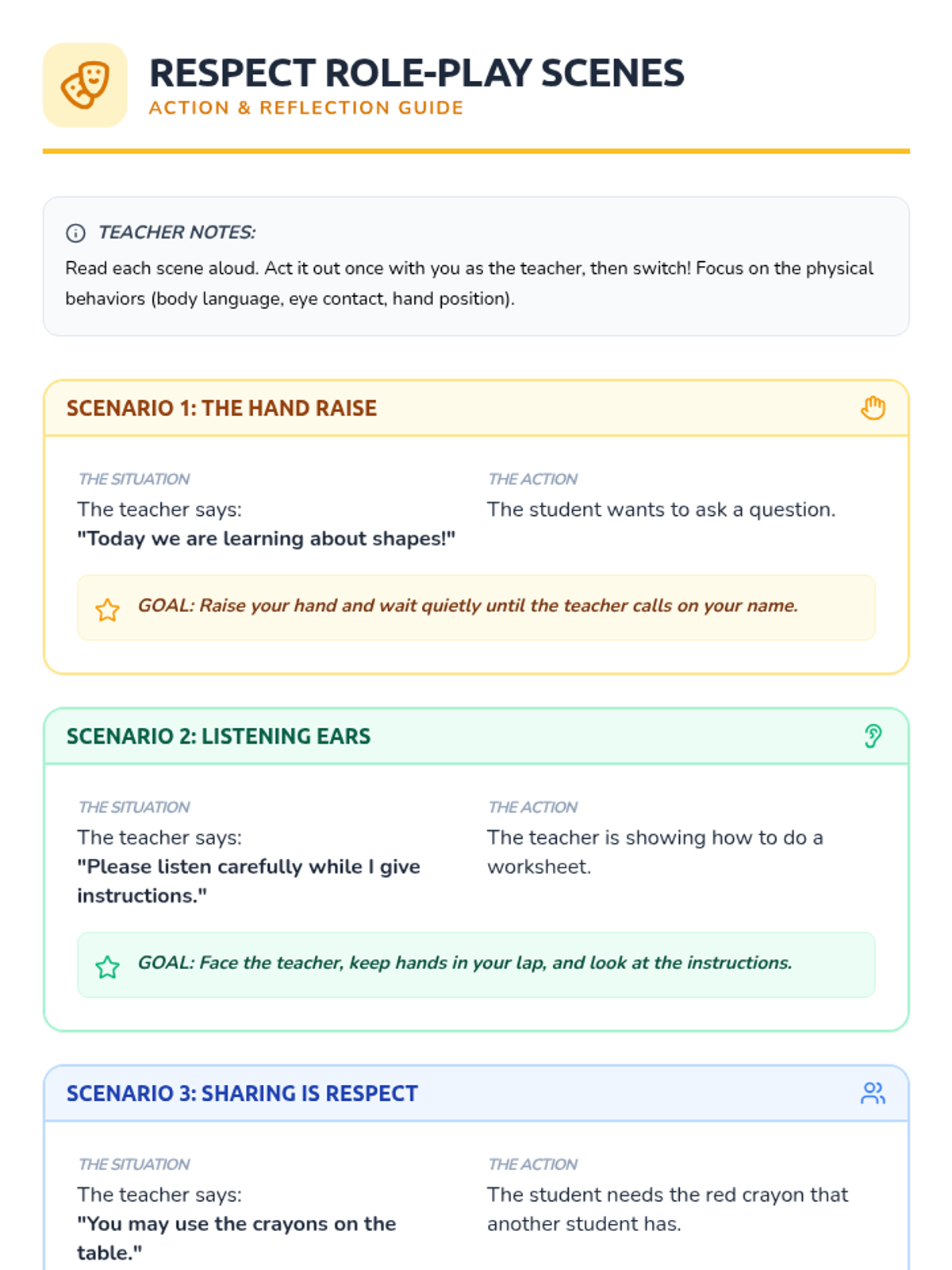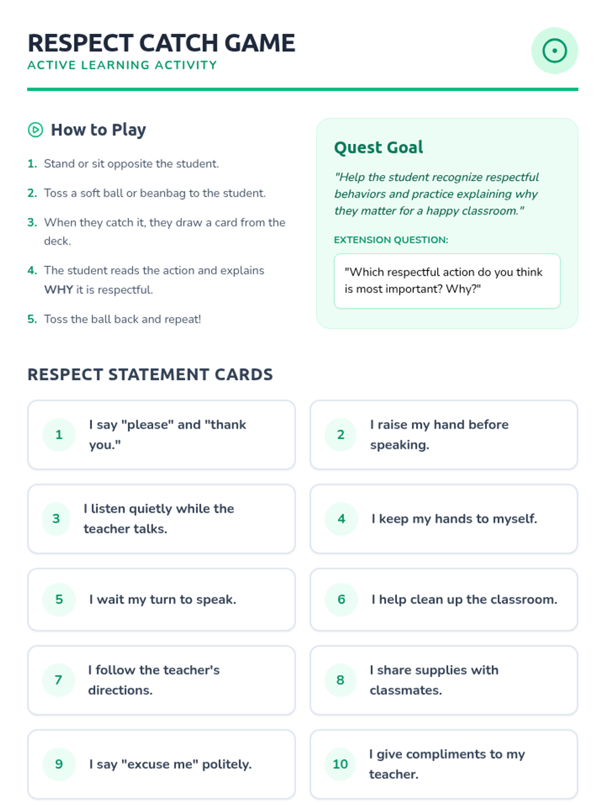 A two-session individual intervention teaching 1st graders the foundational skills of showing respect to their teacher through interactive games, role-play, and creative reflection.