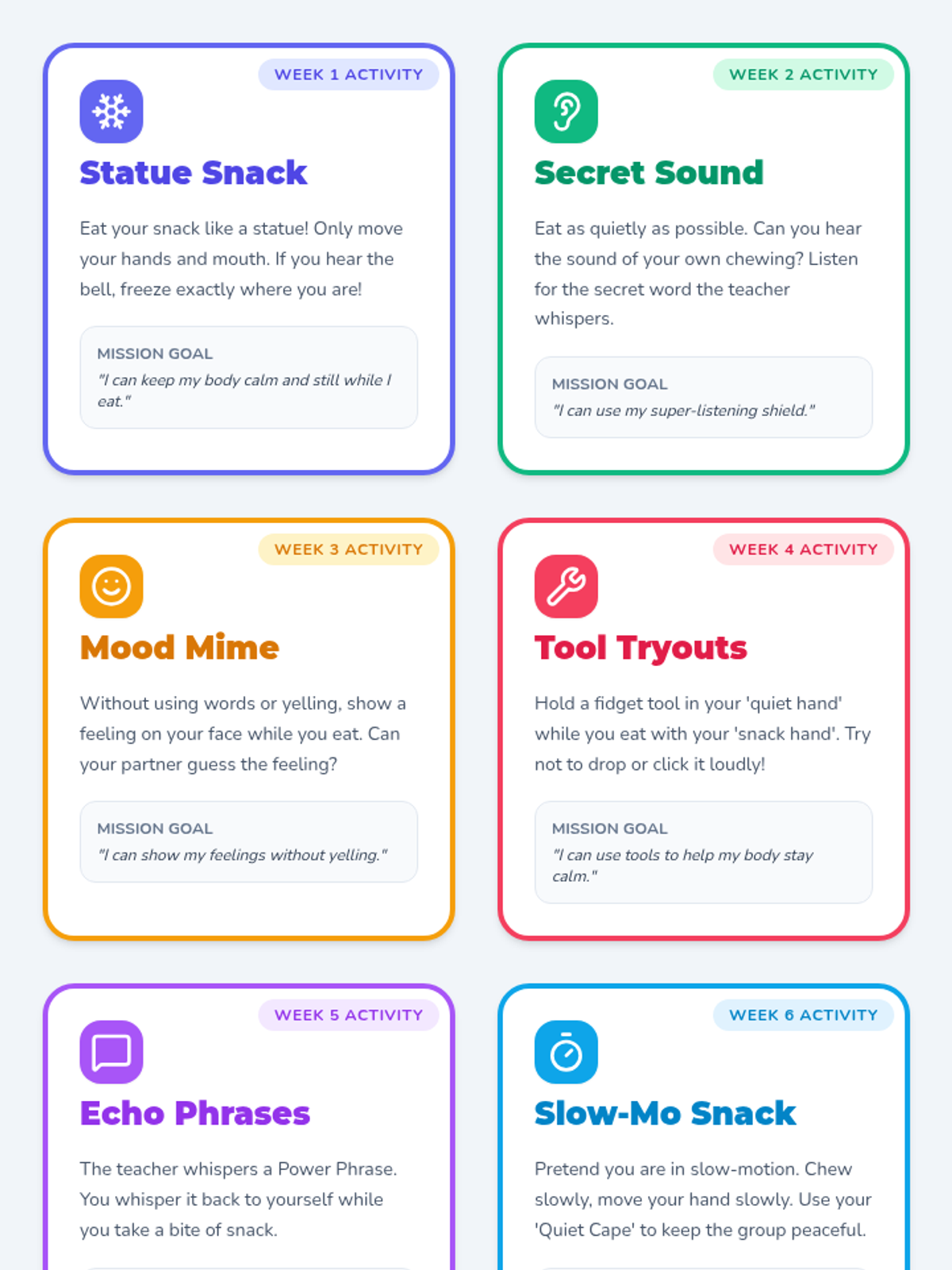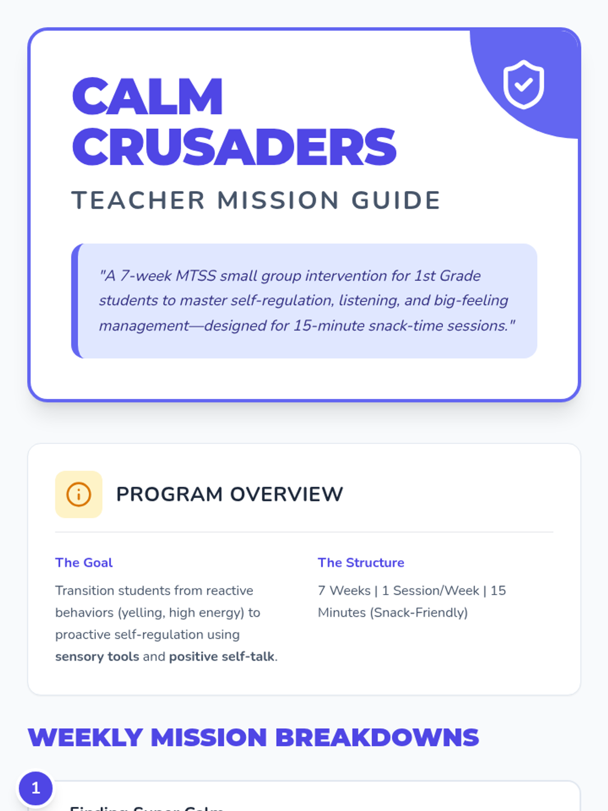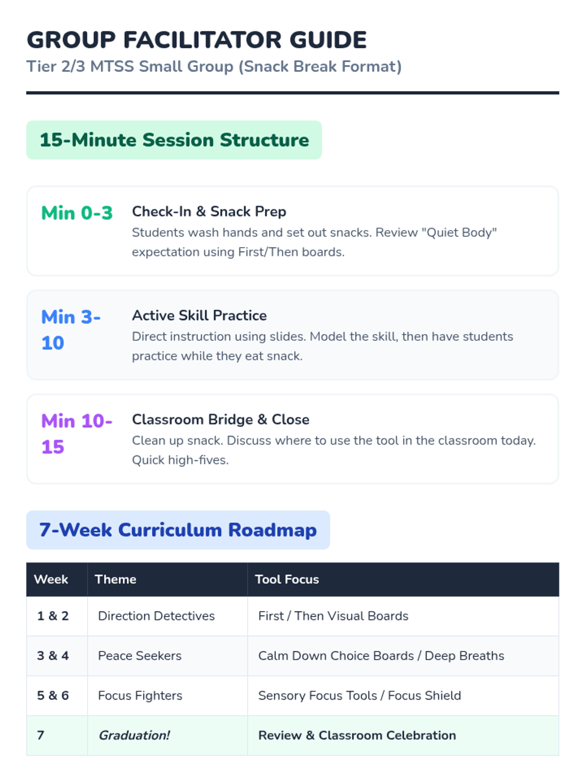 A 7-week MTSS small group intervention for 1st grade students focused on self-regulation, listening, and using sensory tools and positive self-talk to manage big feelings. Designed for 15-minute snack-time sessions.