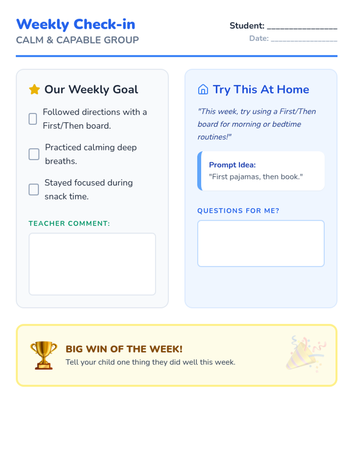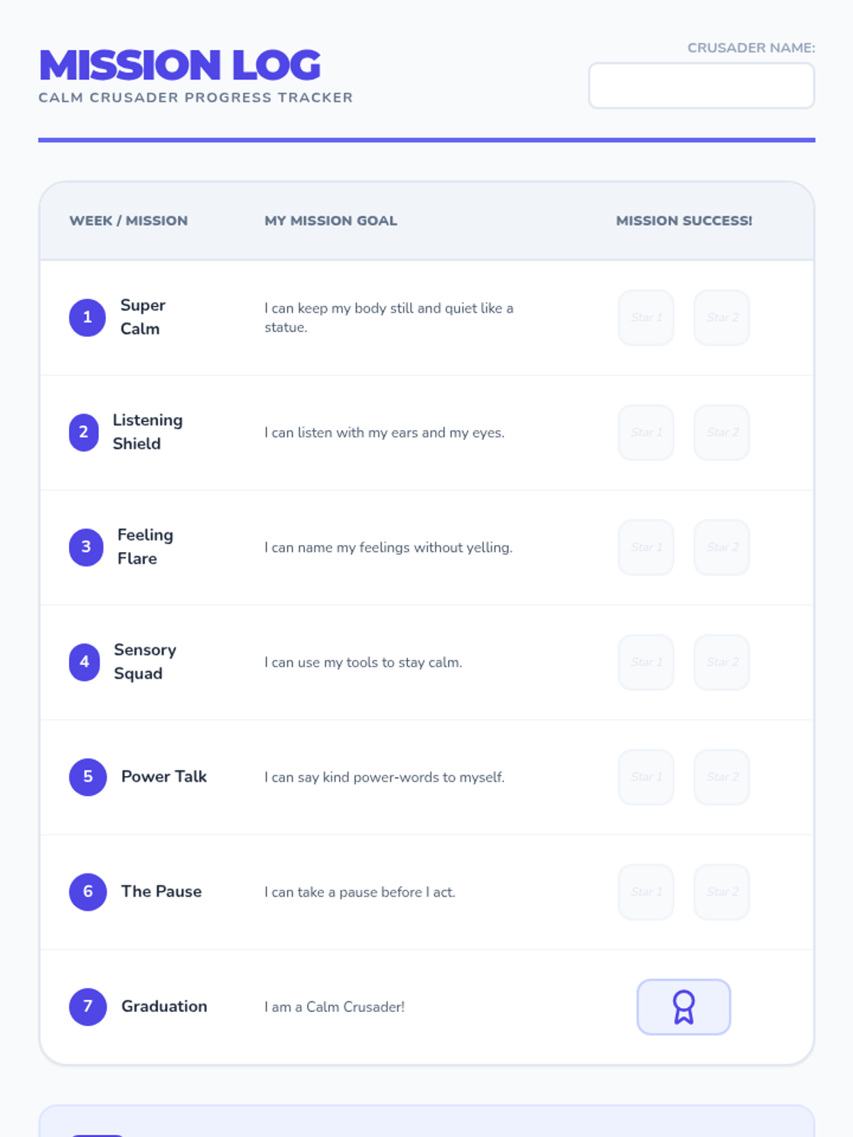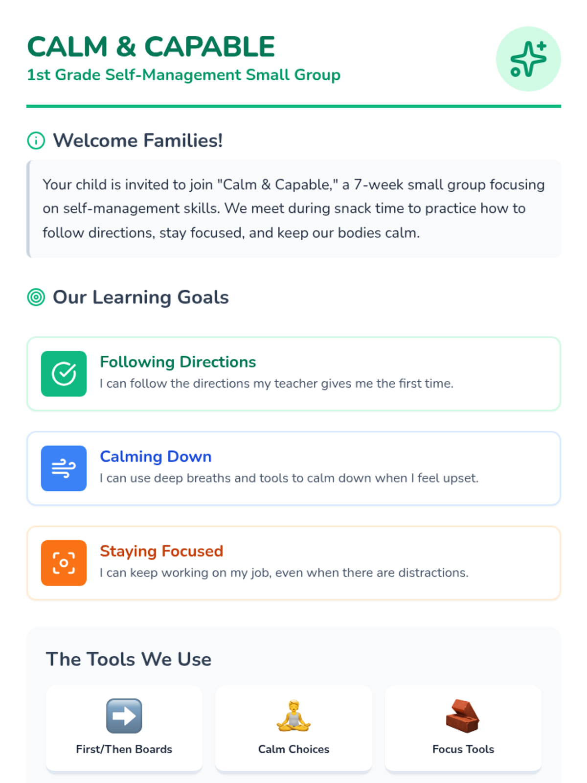 A 7-week MTSS self-management series for 1st grade multilingual learners, focusing on following directions, calming down, and staying focused using visual tools and sensory strategies.