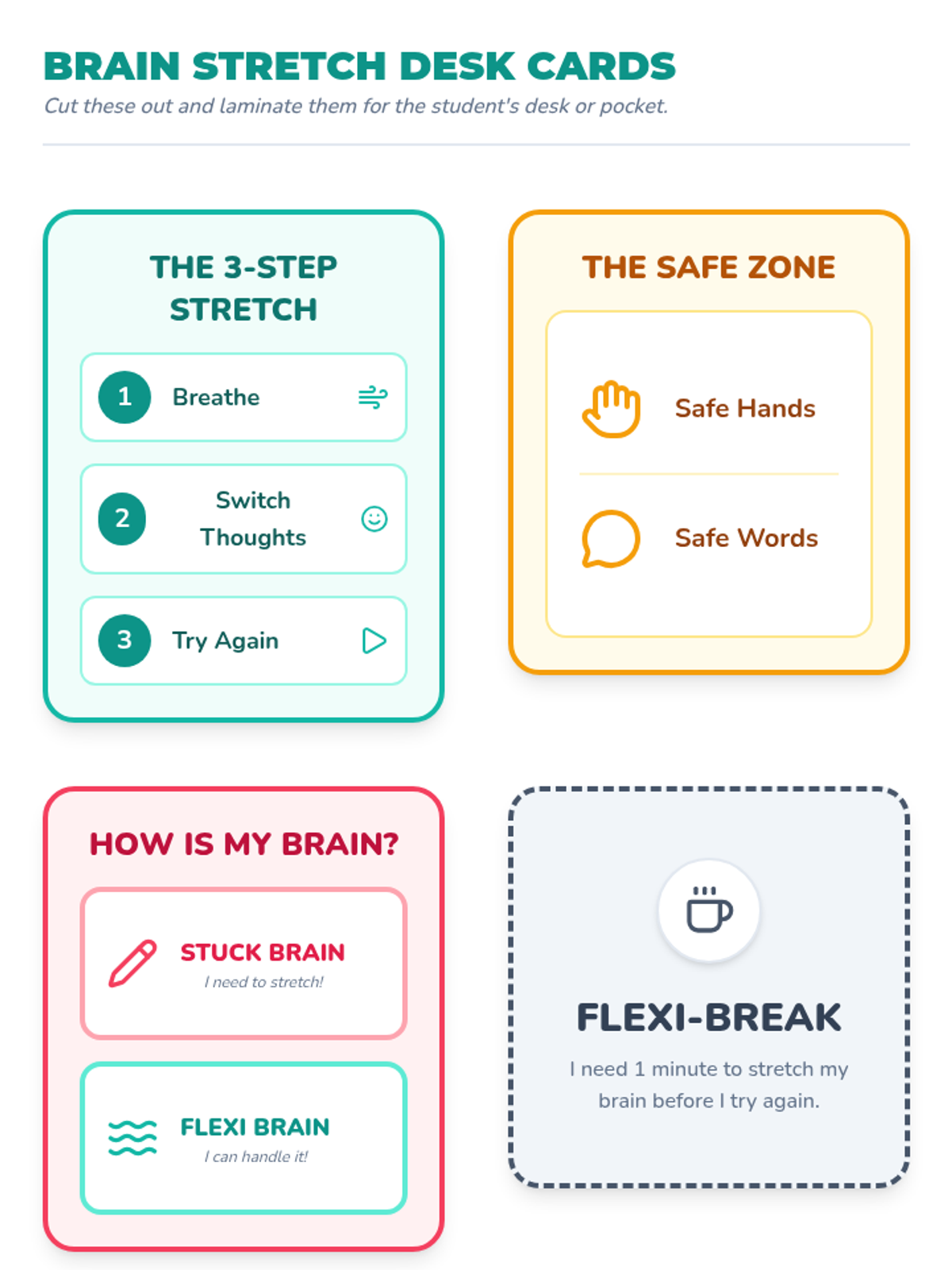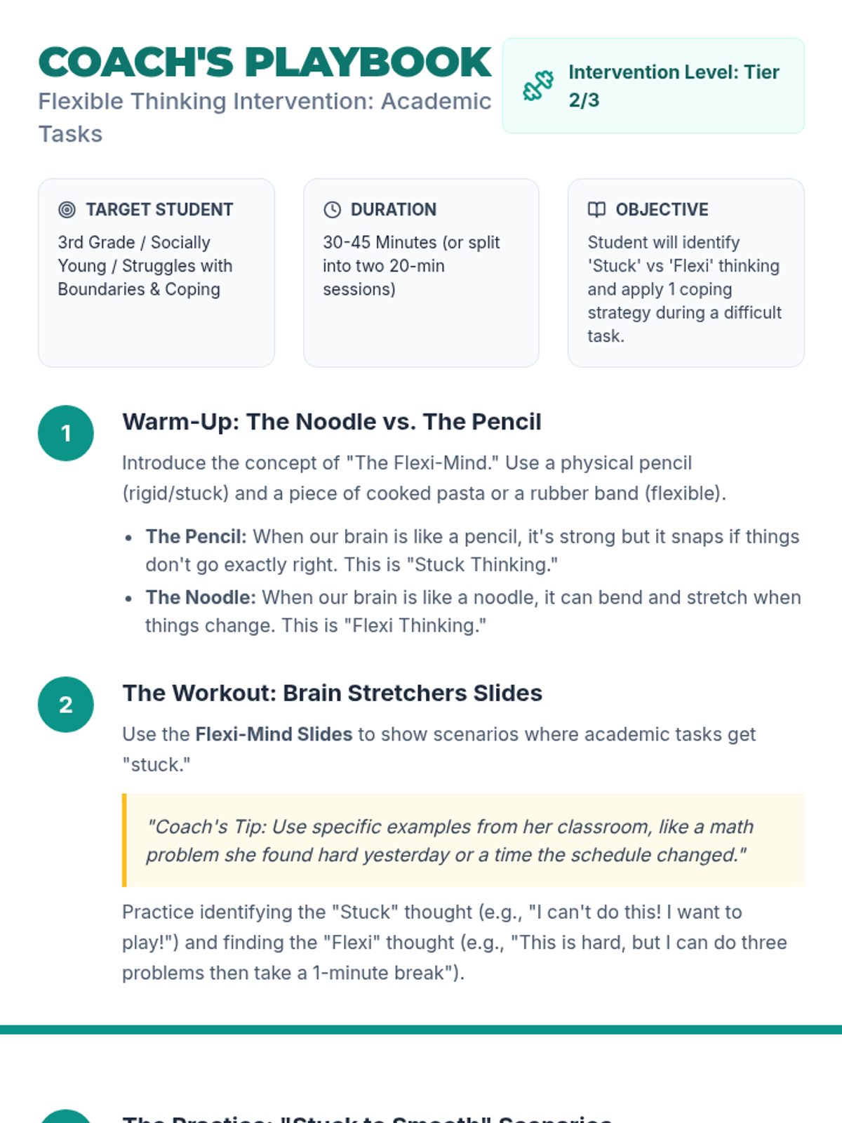 A 6-session intervention sequence designed to build flexible thinking, coping skills, and boundary awareness in elementary students. Each session uses the 'Flexi-Mind Gym' metaphor to tackle specific academic and social challenges through guided instruction and practice.