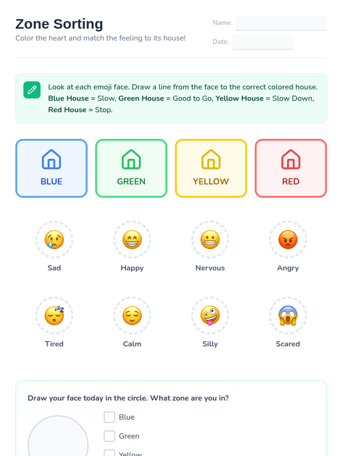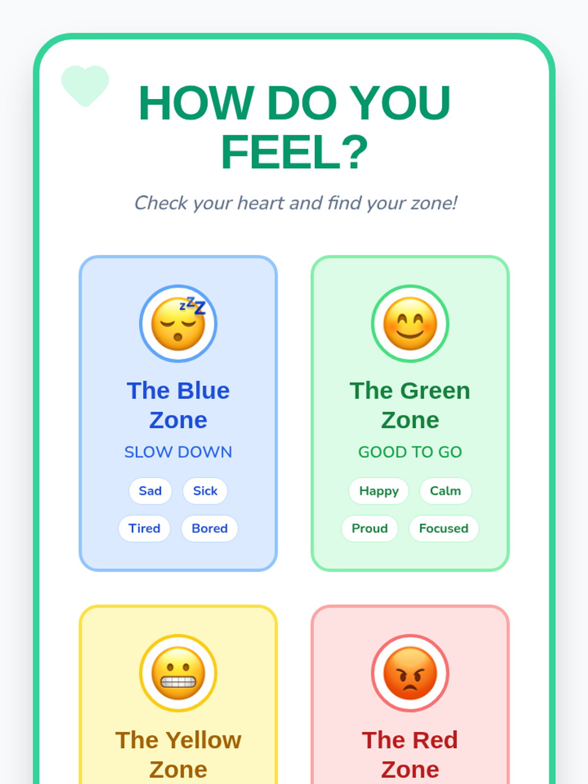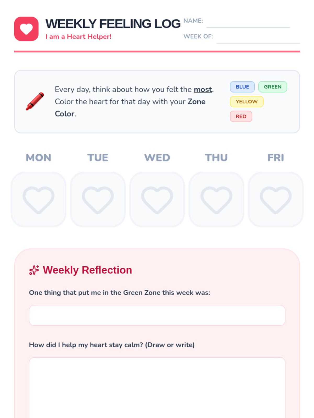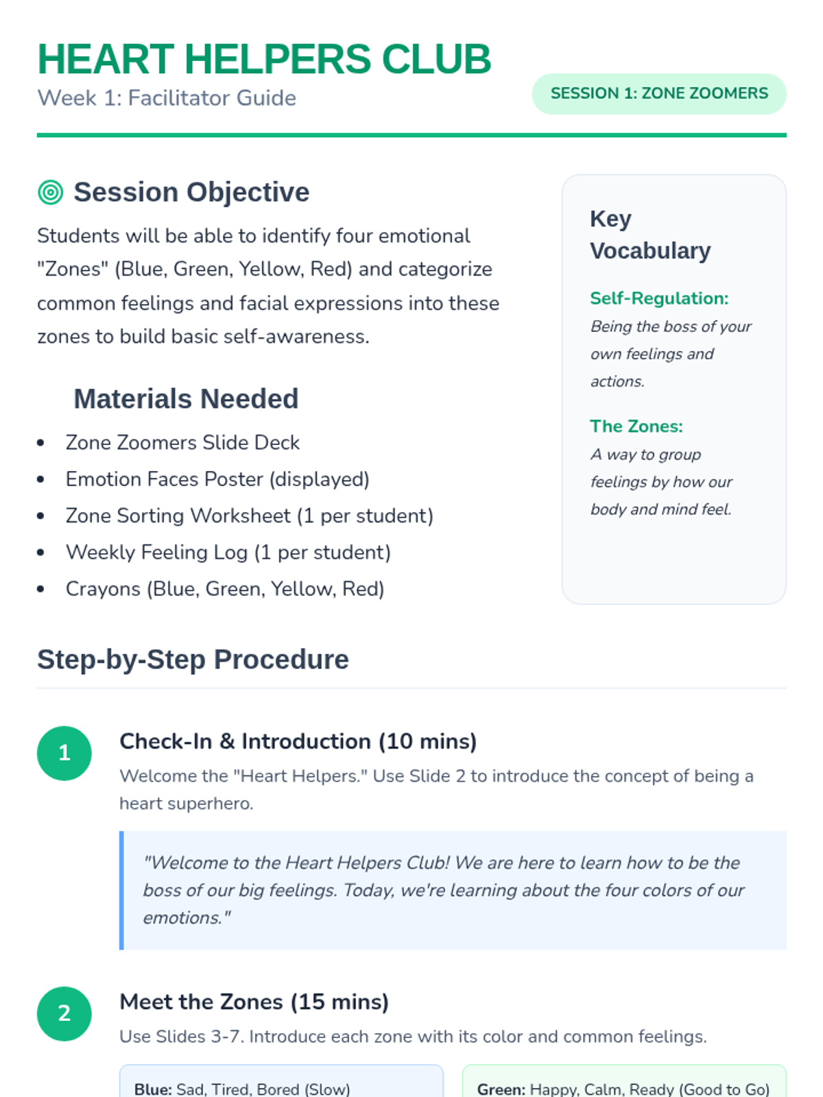 A comprehensive 4-week social-emotional learning curriculum for 1st and 2nd graders. Students learn to identify emotions using the Zones of Regulation, track triggers with a Feelings Thermometer, develop coping strategies, and build respectful friendships.