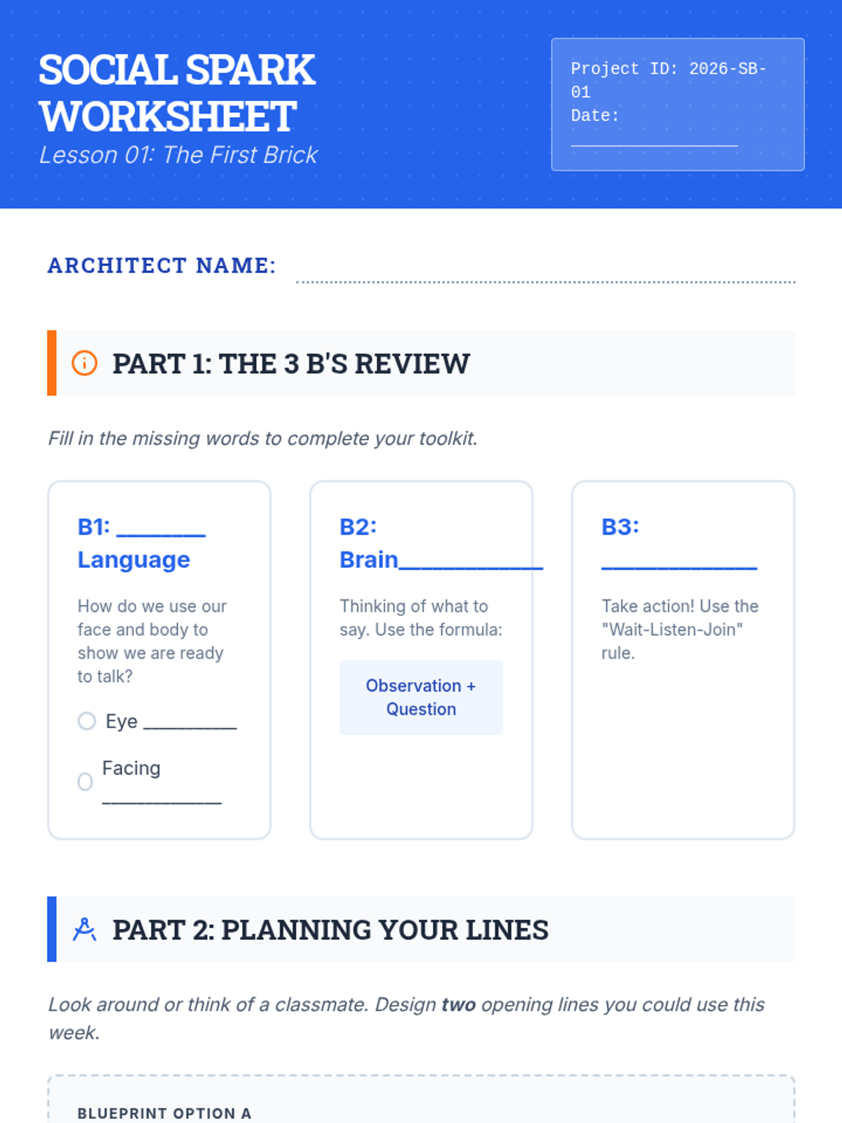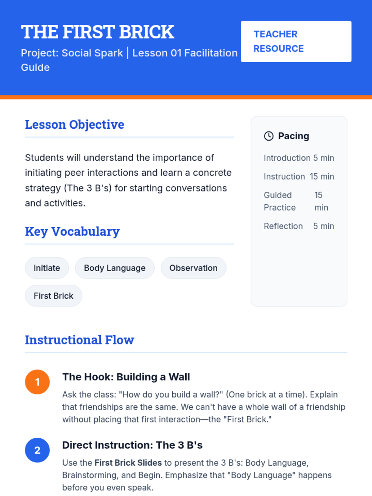 An 8-week curriculum designed to empower students with the tools to initiate positive peer interactions and resolve conflicts effectively. The unit uses a 'Social Architects' theme, framing social skills as building blocks for a strong community.