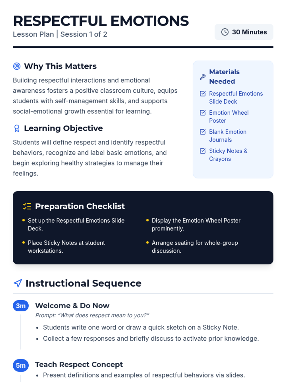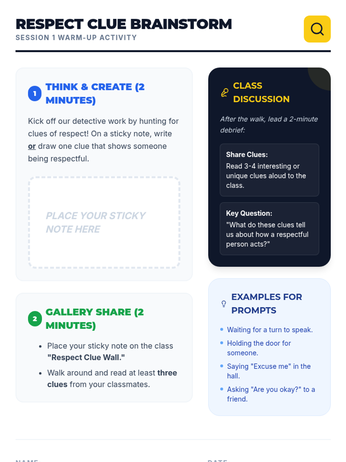 A social-emotional learning unit for 3rd graders focusing on respect and emotional self-regulation through a 'Respect Detective' theme. Students learn to identify social cues, label emotions, and apply management strategies.