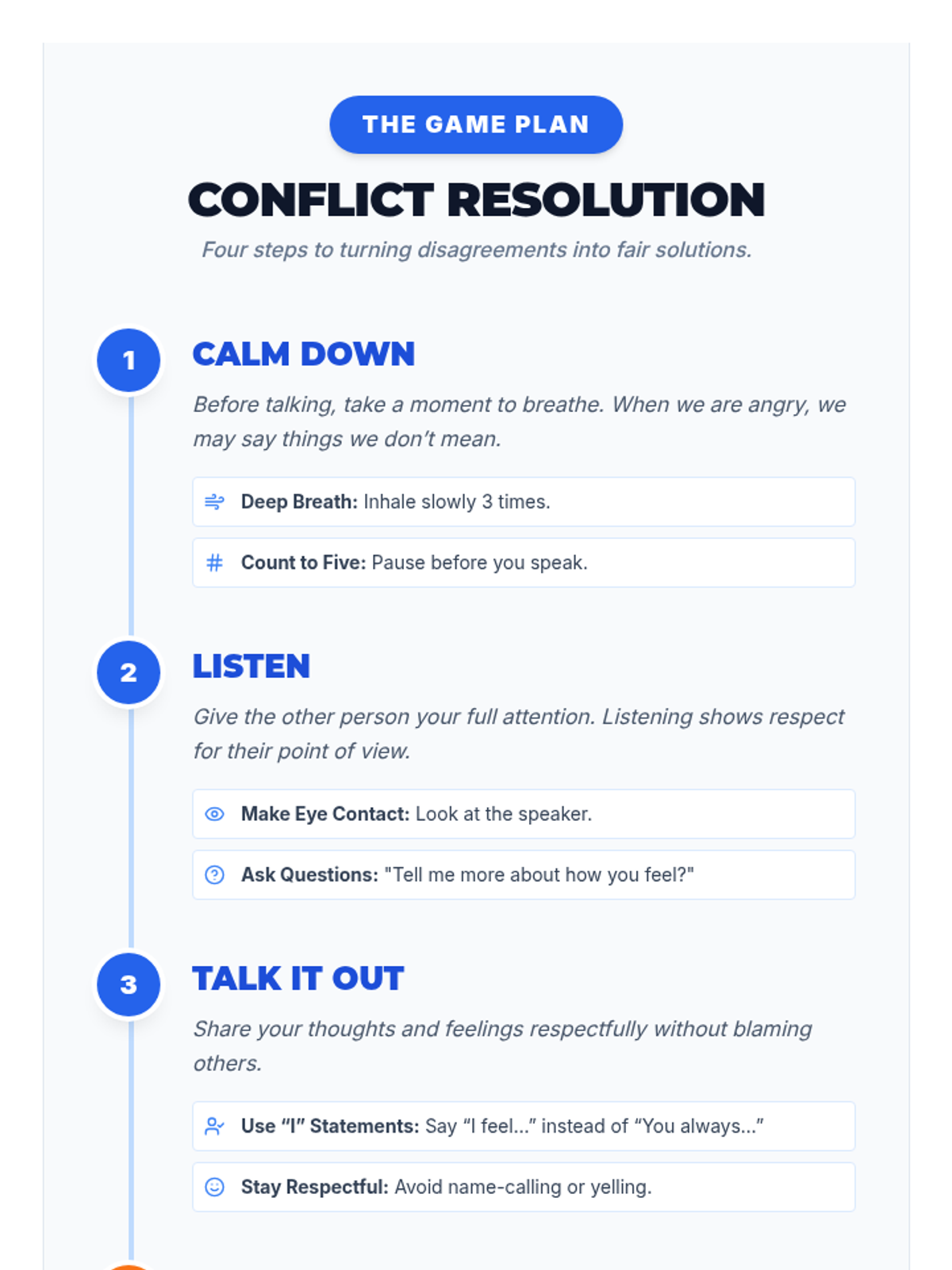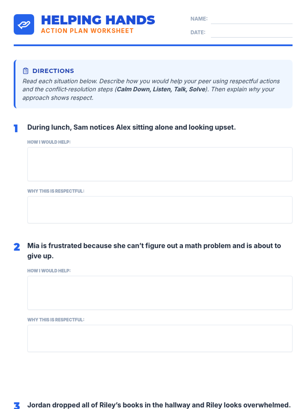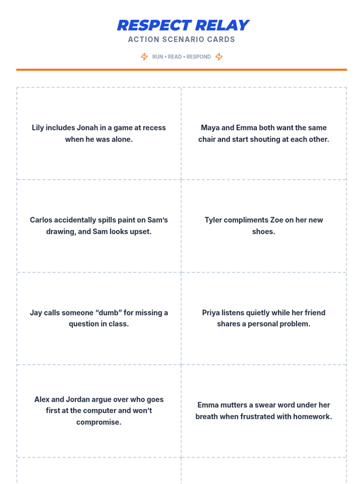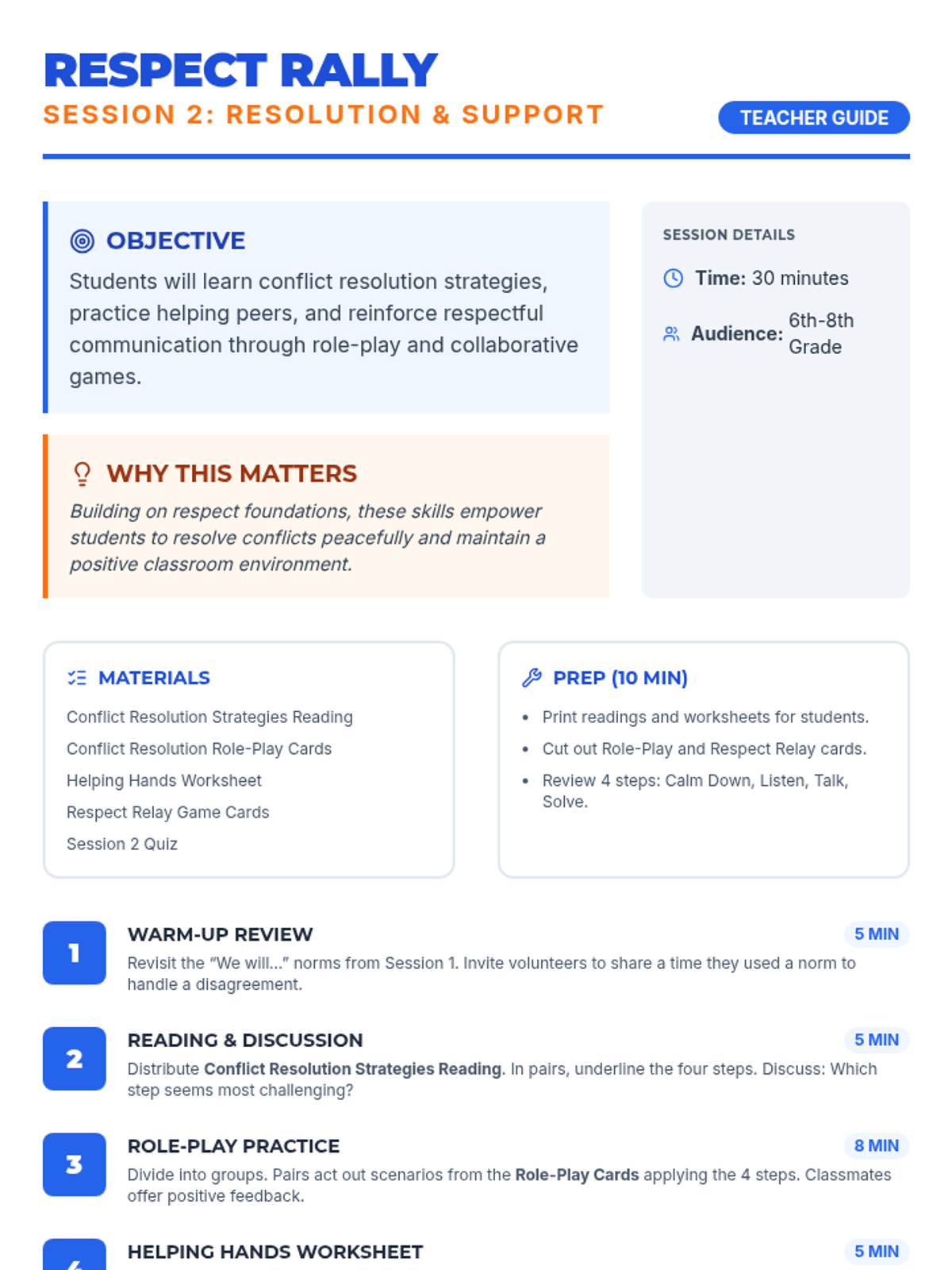 A two-session sequence for middle schoolers focused on defining respect, preventing bullying, and mastering conflict resolution through interactive games and role-play.