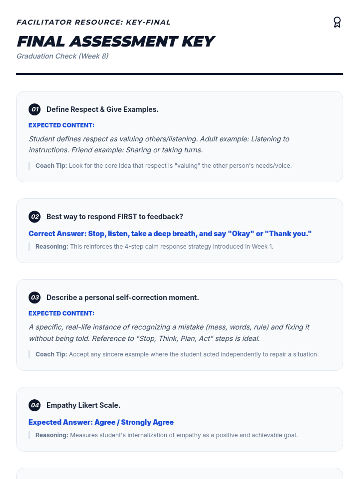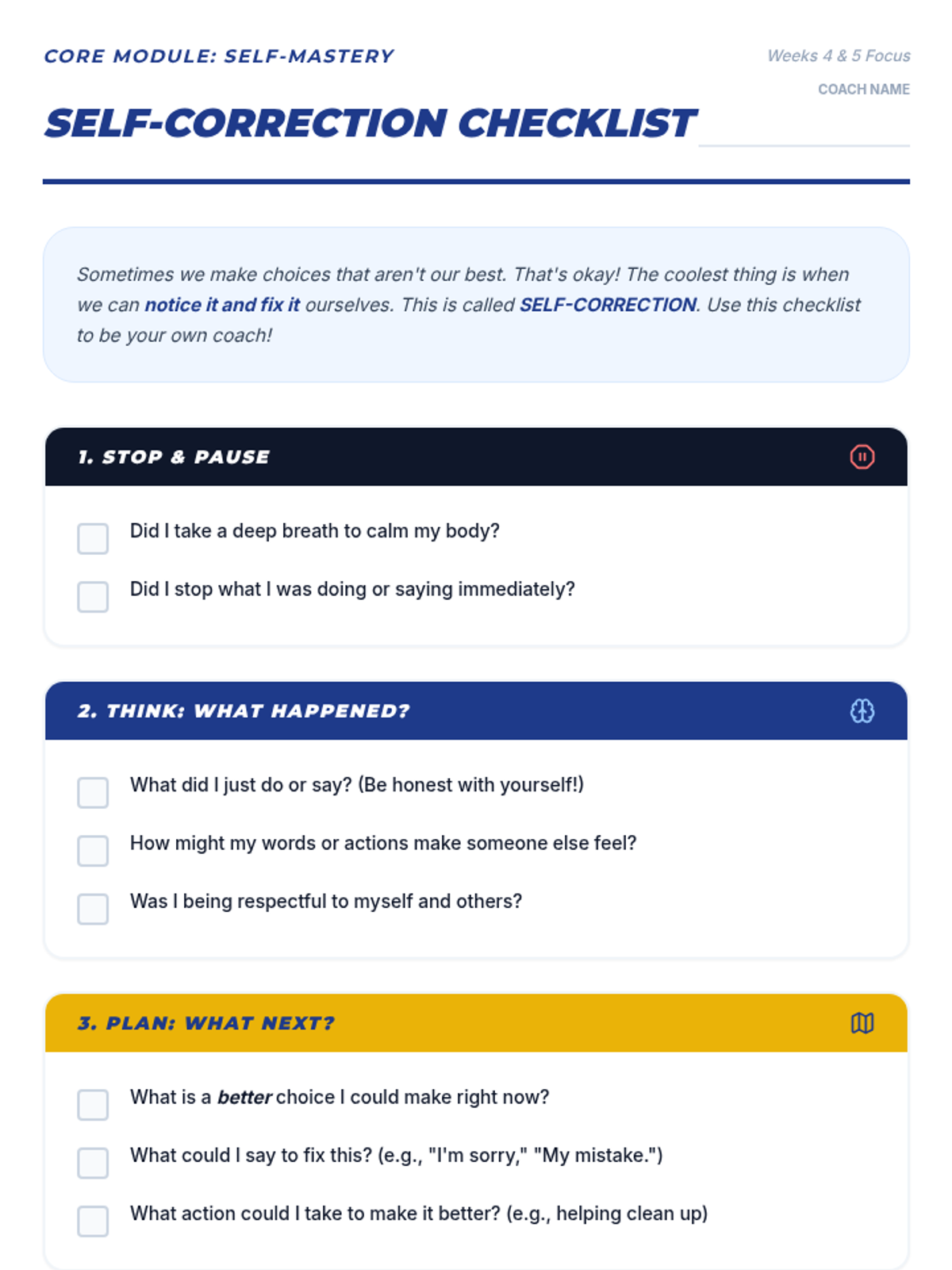 A comprehensive 12-session program designed for youth ages 9-18, focusing on essential life skills including self-esteem, resilience, time management, and conflict resolution, integrated with Sean Covey's 7 Habits and Nathaniel Branden's Six Pillars.