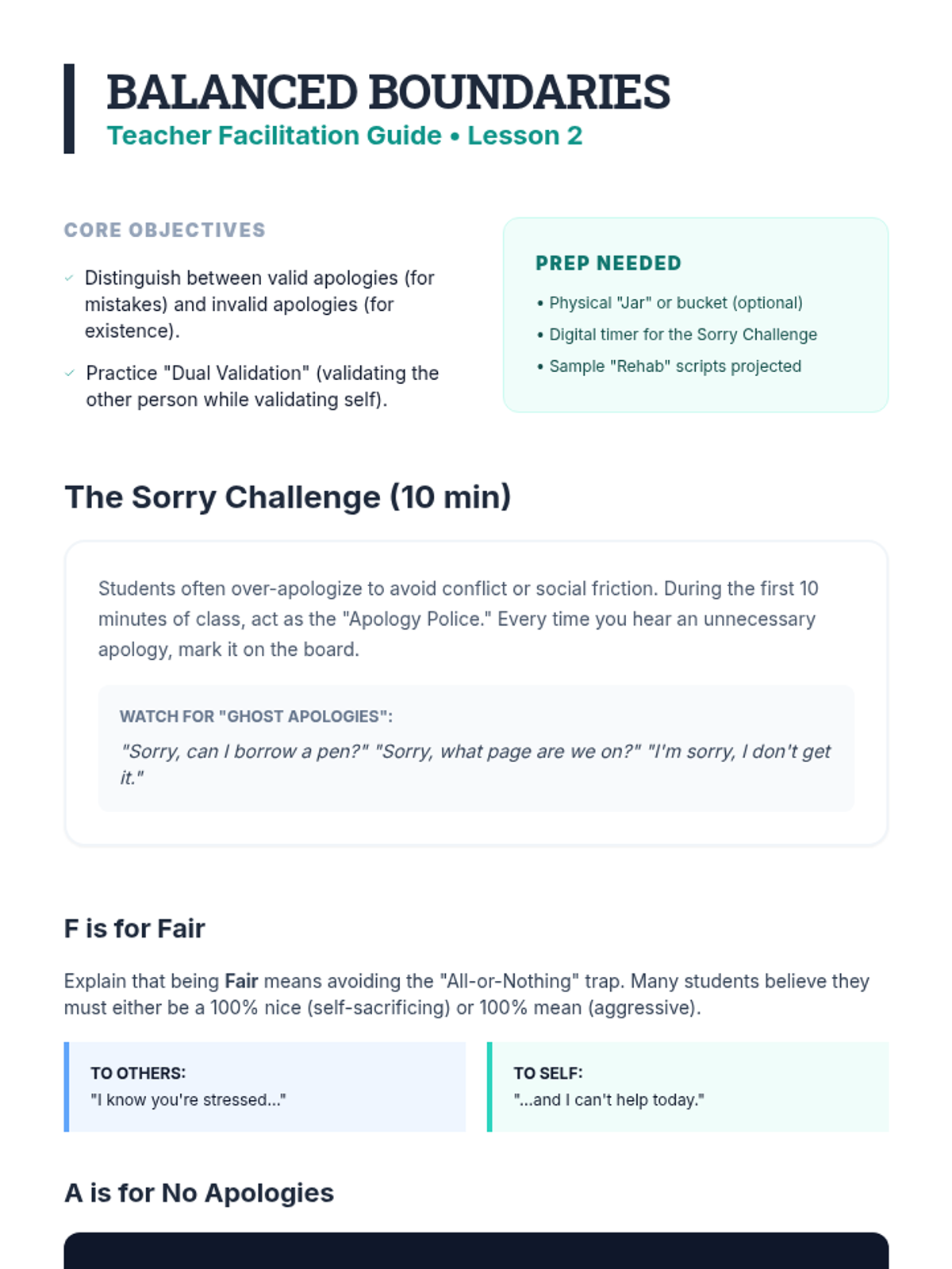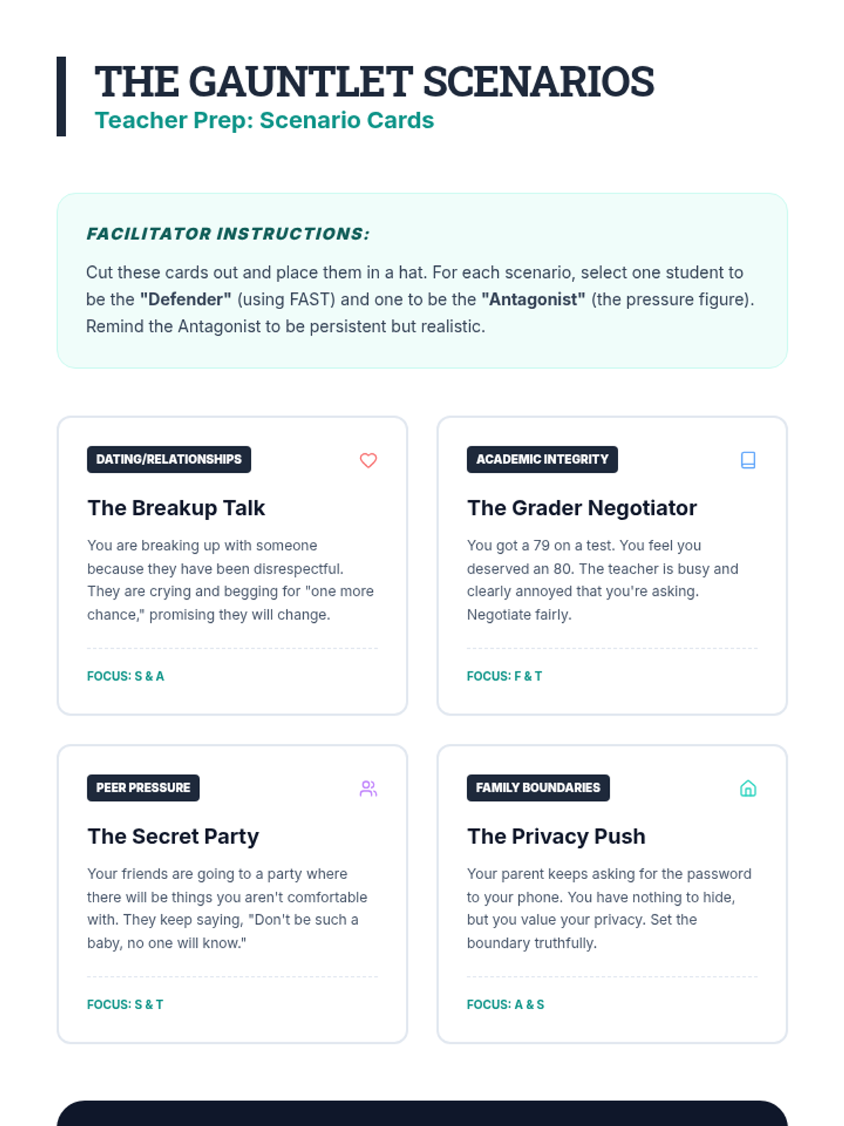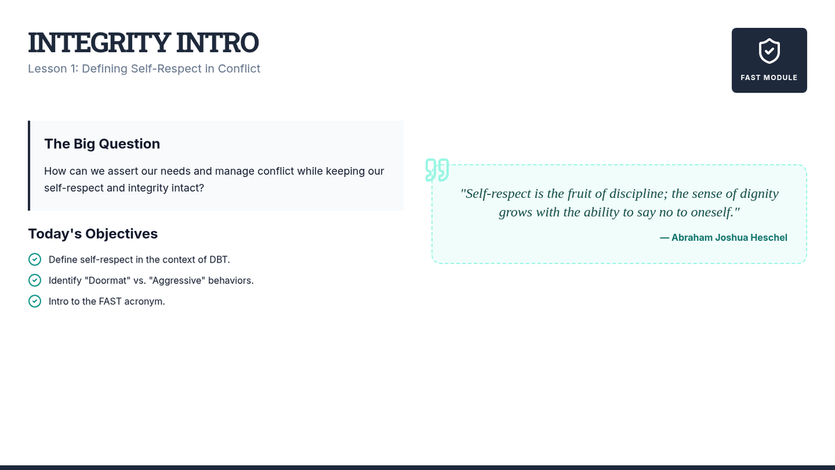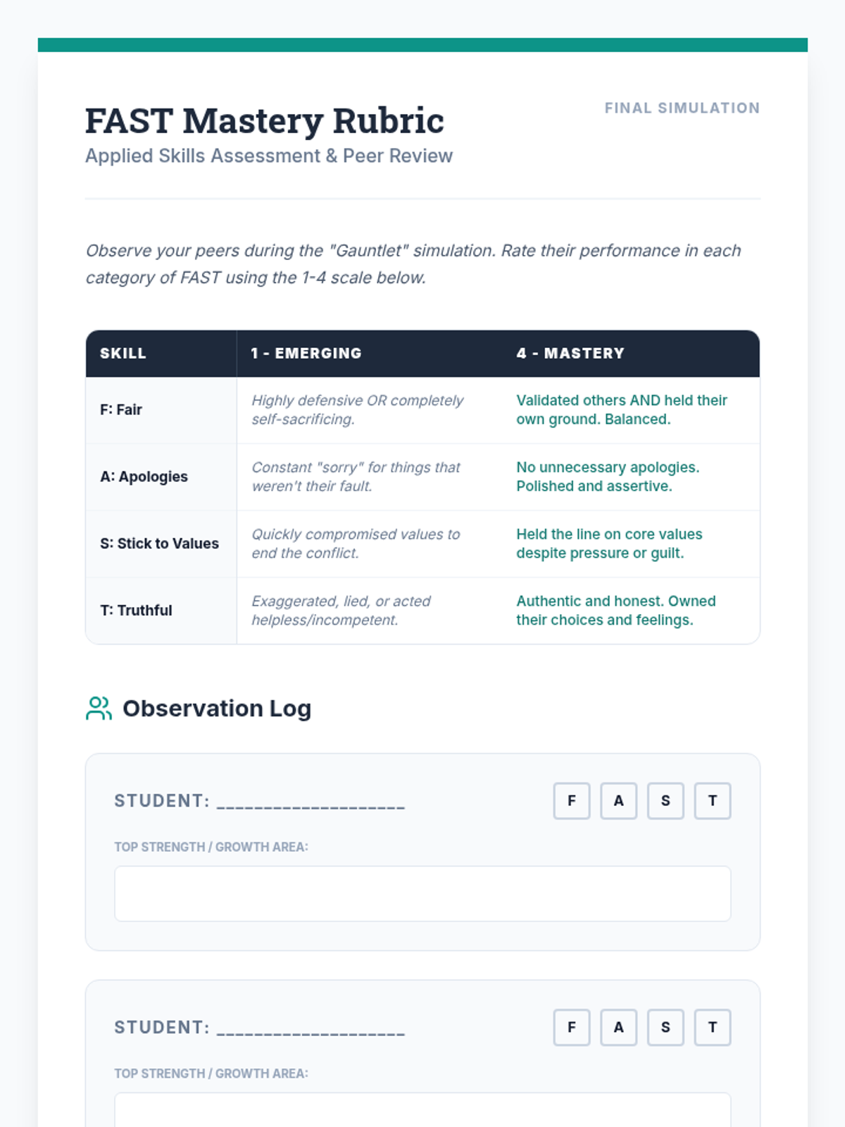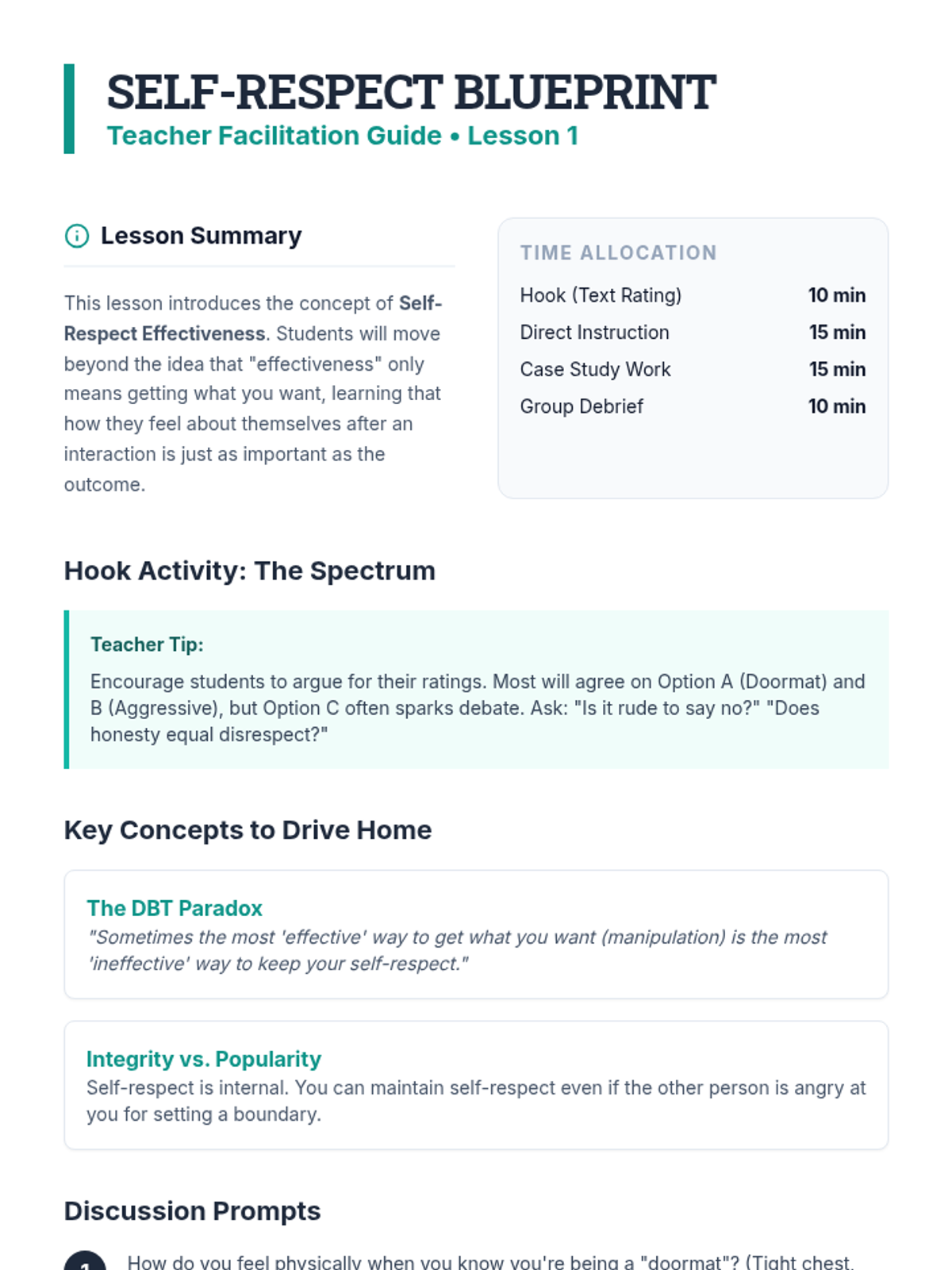 A comprehensive 5-lesson sequence for 10th-grade students focused on the FAST module of Dialectical Behavior Therapy (DBT). Students learn to navigate interpersonal conflicts while maintaining their self-respect through exercises on fairness, reducing over-apologizing, identifying core values, and practicing truthfulness.