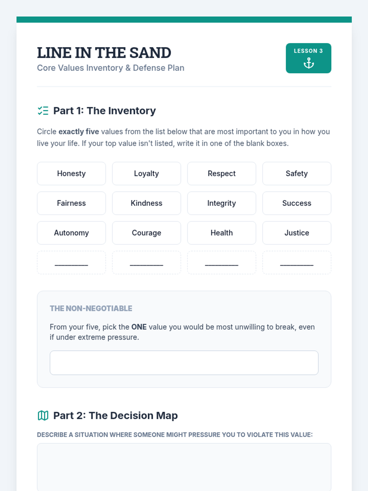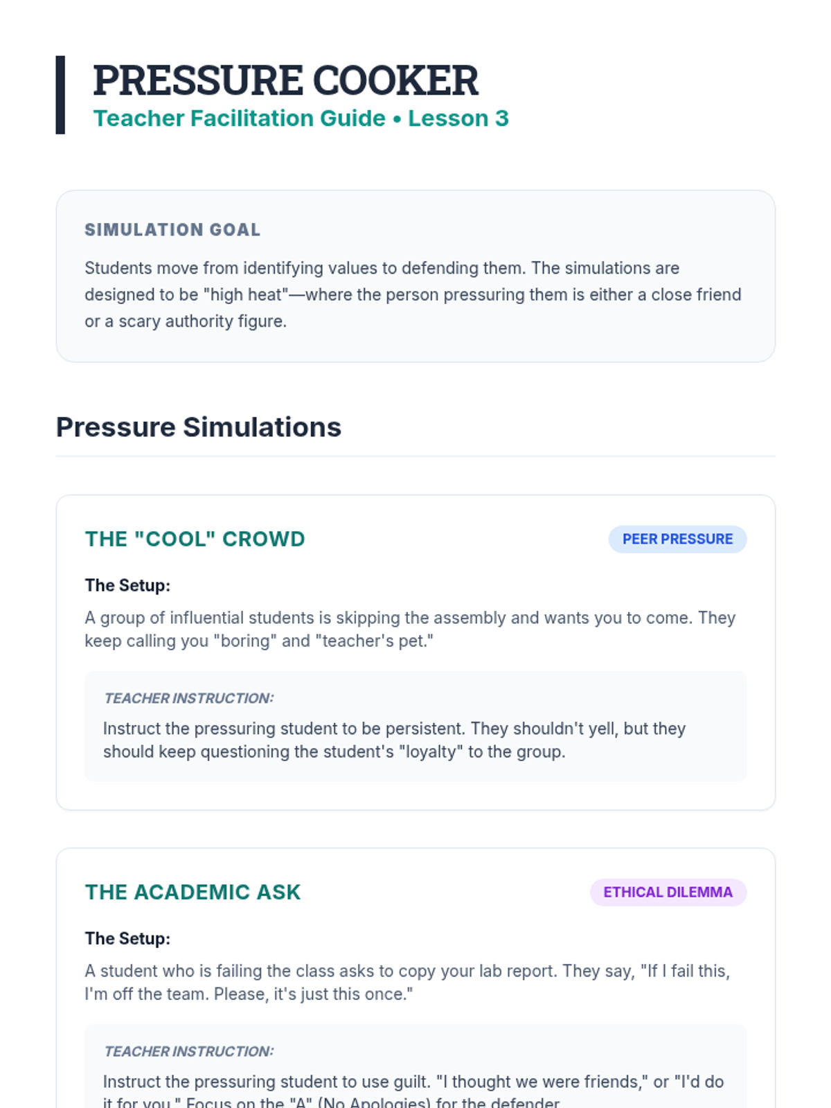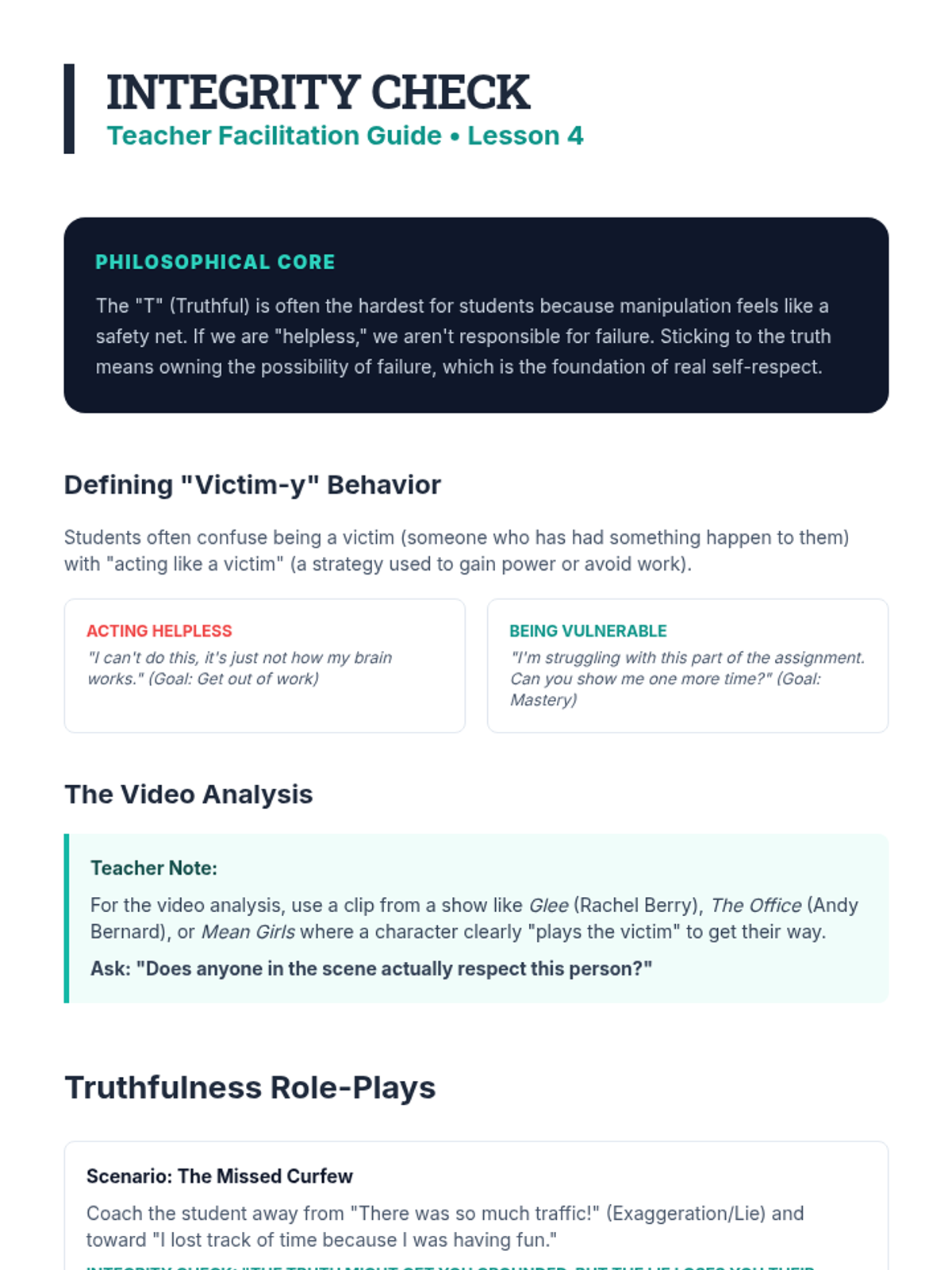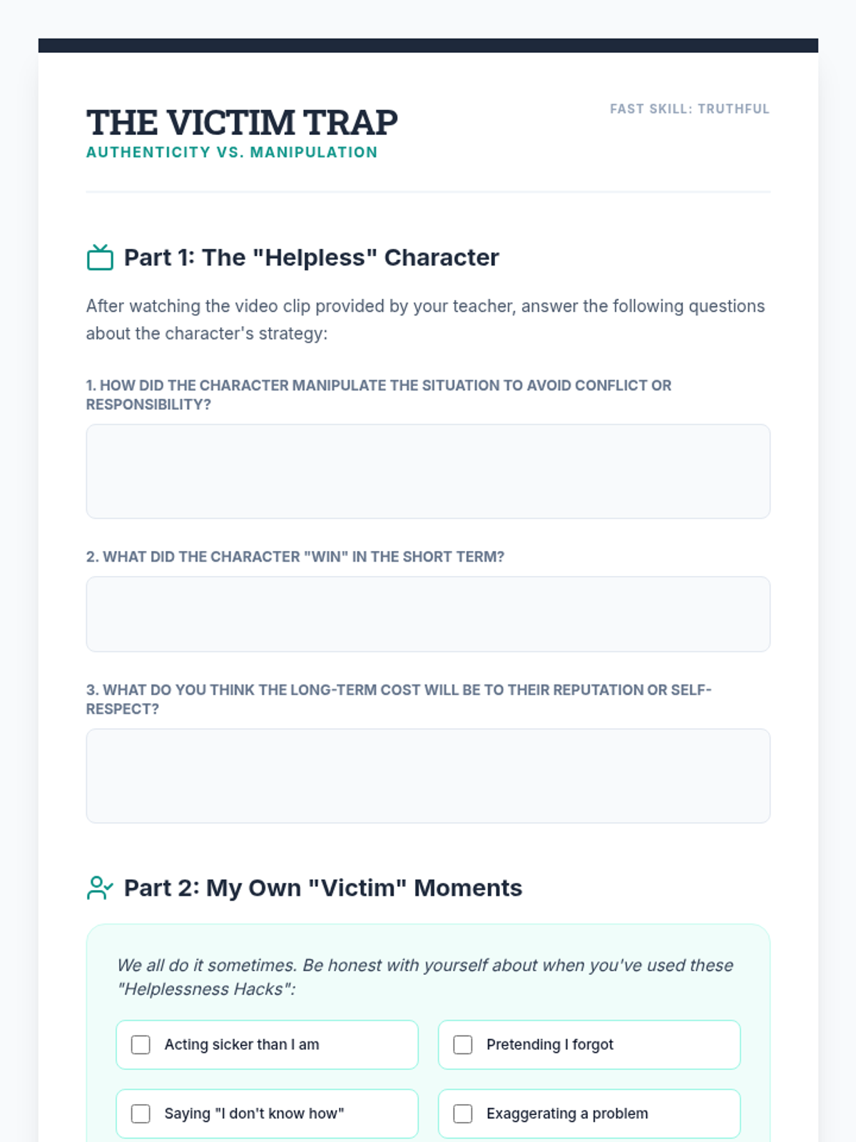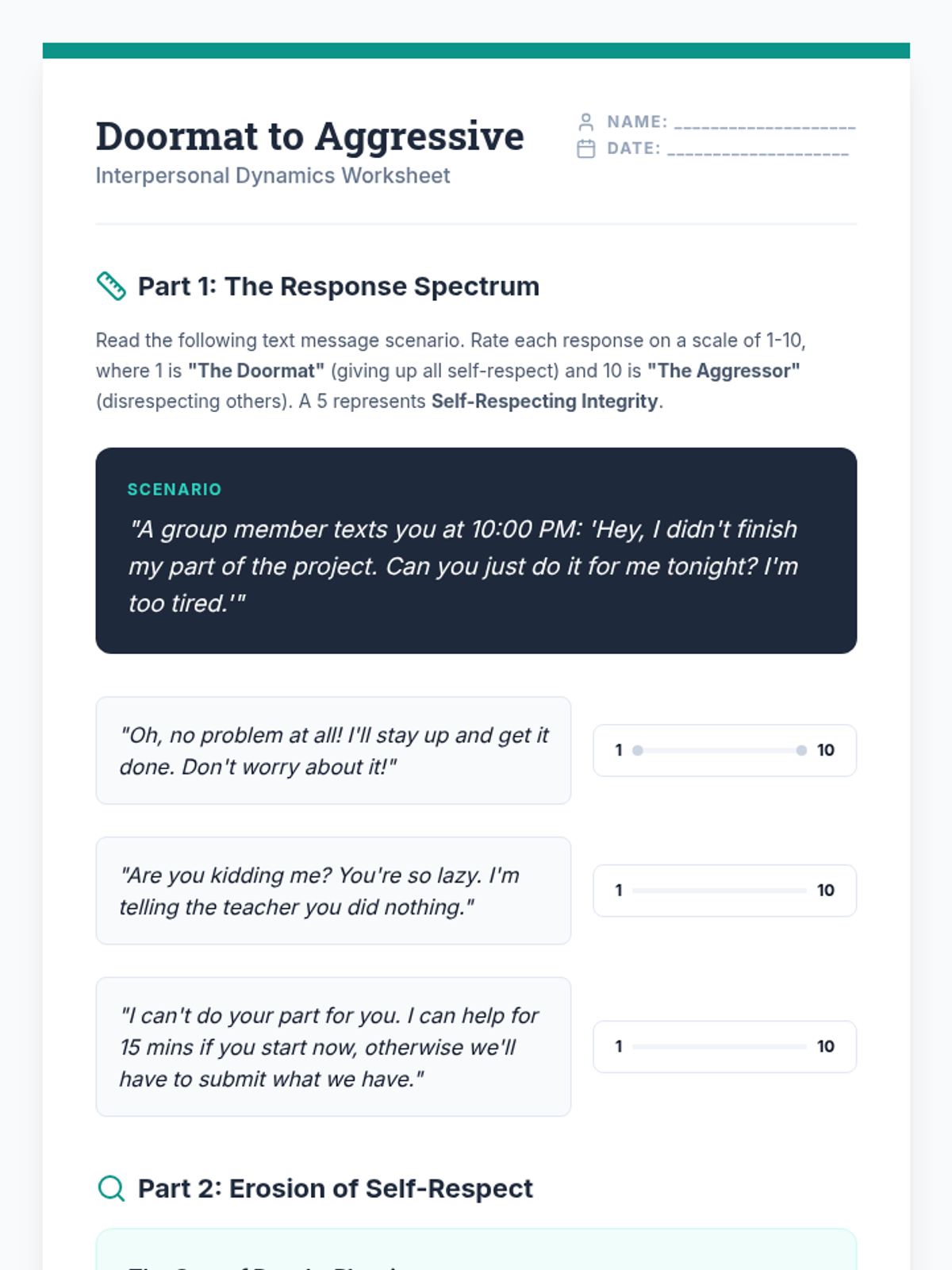 A comprehensive 5-lesson sequence for 10th-grade students focused on the FAST module of Dialectical Behavior Therapy (DBT). Students learn to navigate interpersonal conflicts while maintaining their self-respect through exercises on fairness, reducing over-apologizing, identifying core values, and practicing truthfulness.