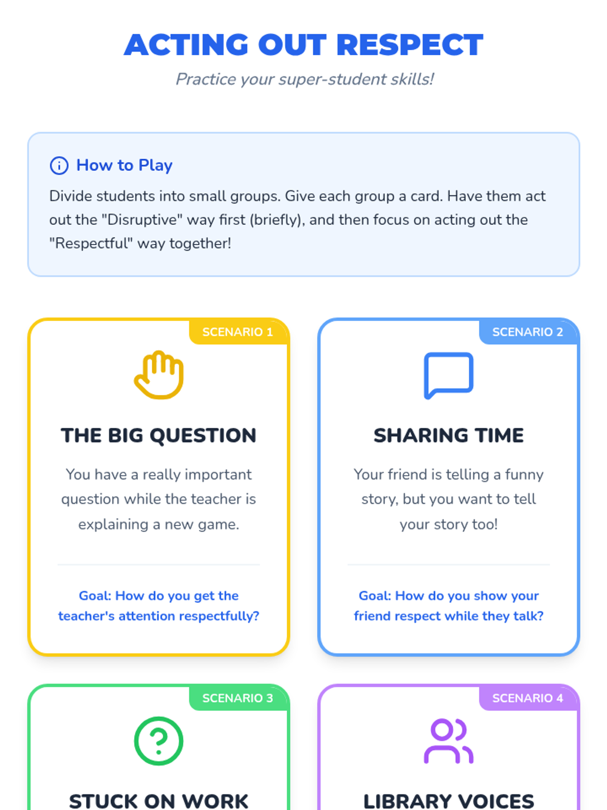 A three-week sequence for 1st and 2nd graders to learn appropriate classroom behavior, focusing on positive attention-seeking strategies, self-regulation, and respectful communication through games and role-play.