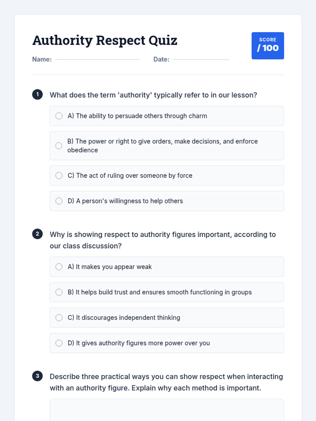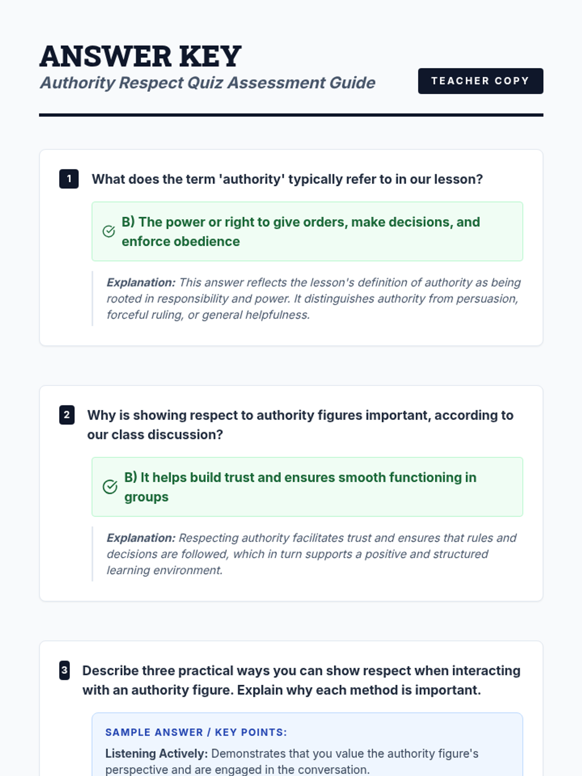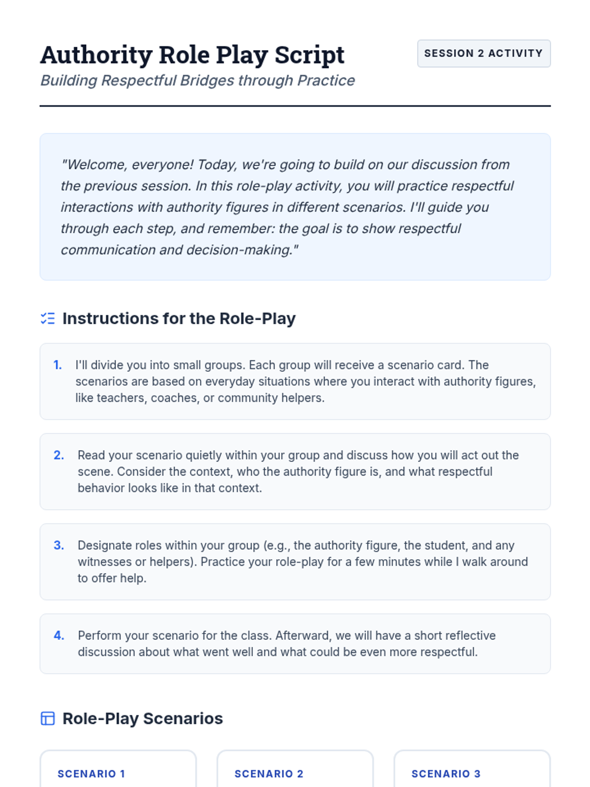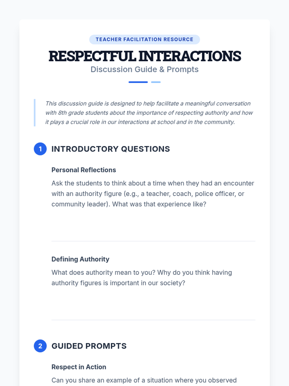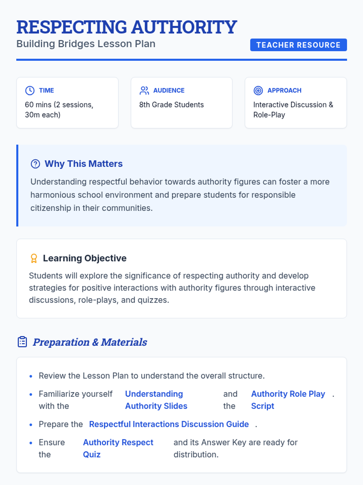 A two-session sequence for 8th graders designed to help them understand the role of authority figures and develop respectful communication strategies. Students engage with definitions, real-world scenarios, and role-playing to build stronger relationships in their community.