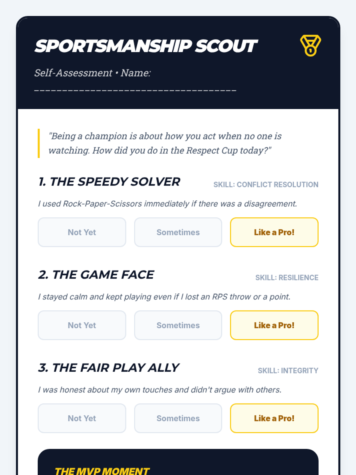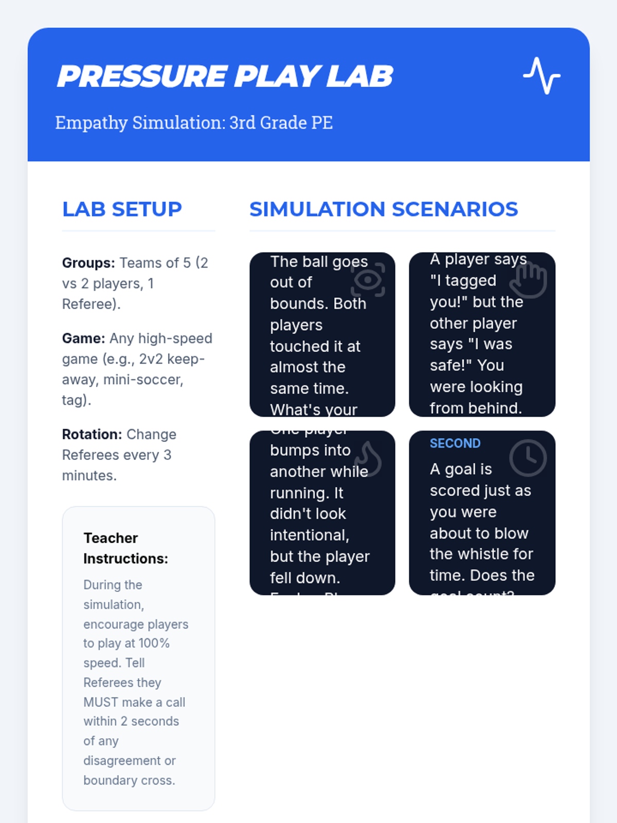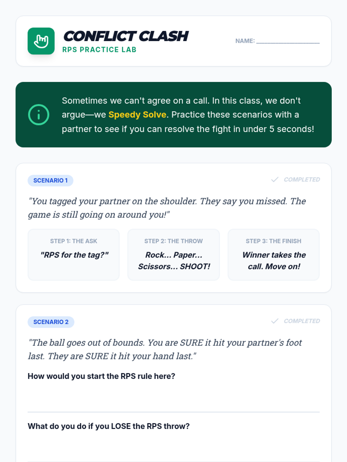 This sequence teaches 3rd-grade students how to respect sports officials and resolve conflicts autonomously. Students will explore the role of referees, practice officiating themselves to build empathy, learn the Rock-Paper-Scissors resolution method, and demonstrate mastery in a self-refereed tournament.