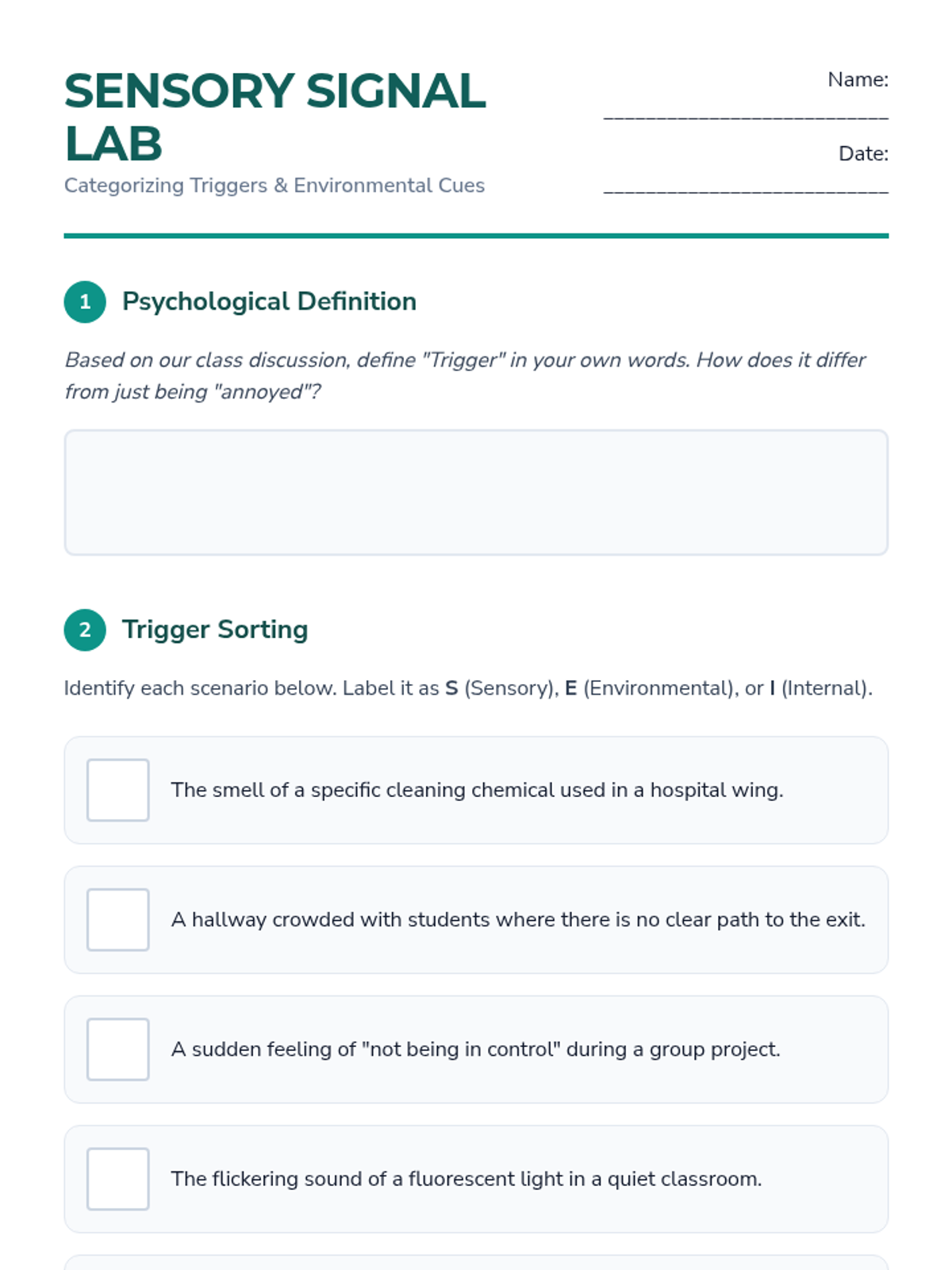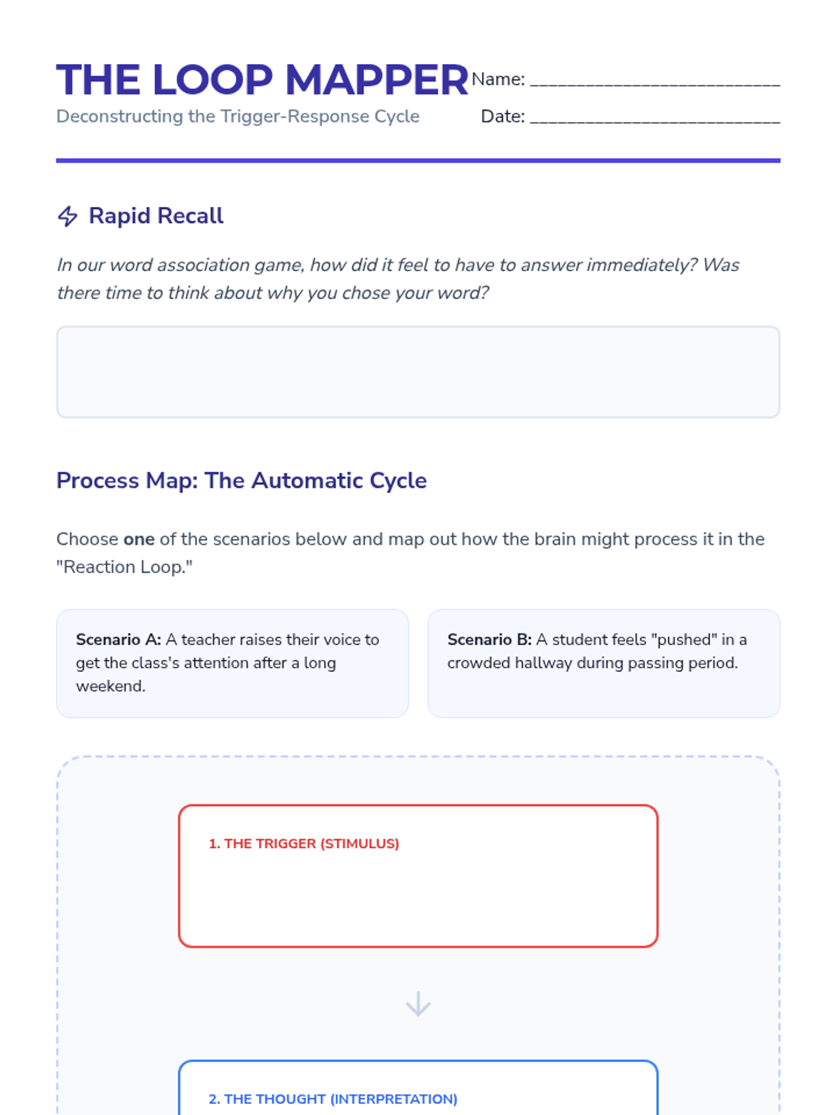 A 9th-grade counseling sequence focused on identifying and analyzing triggers through a workshop approach. Students explore the link between past experiences and present-day trauma responses, categorizing triggers and mapping the 'Trigger-Response Loop' using fictional scenarios and school-based environmental analysis.