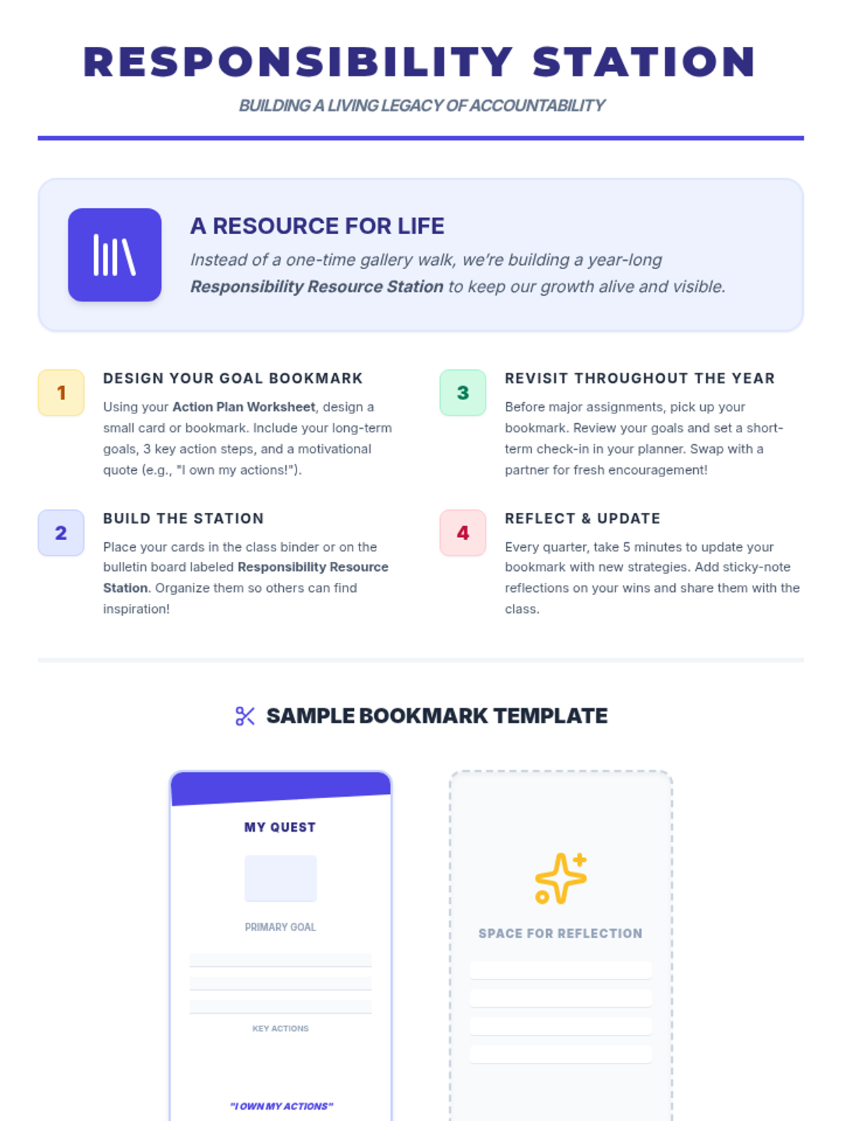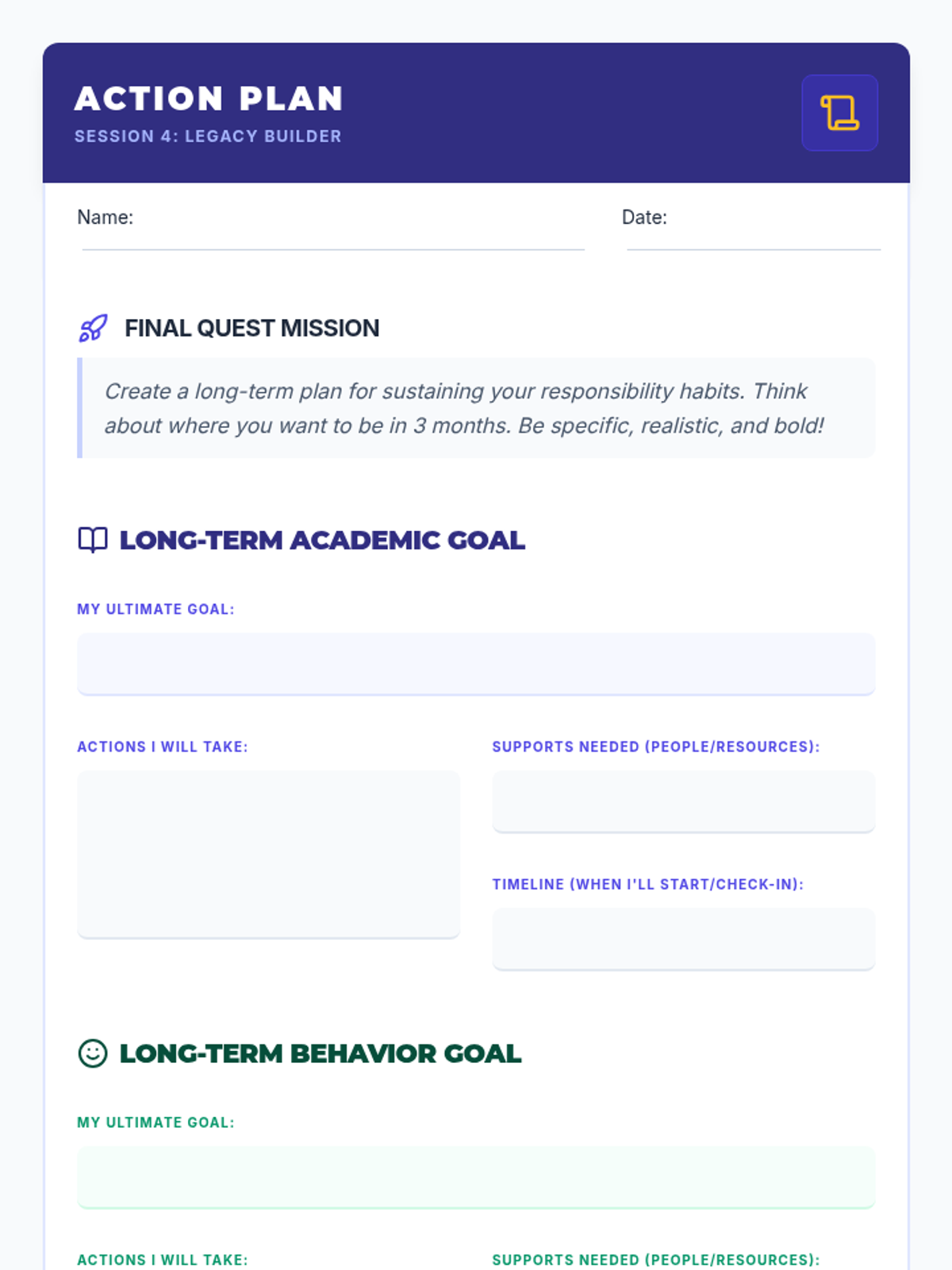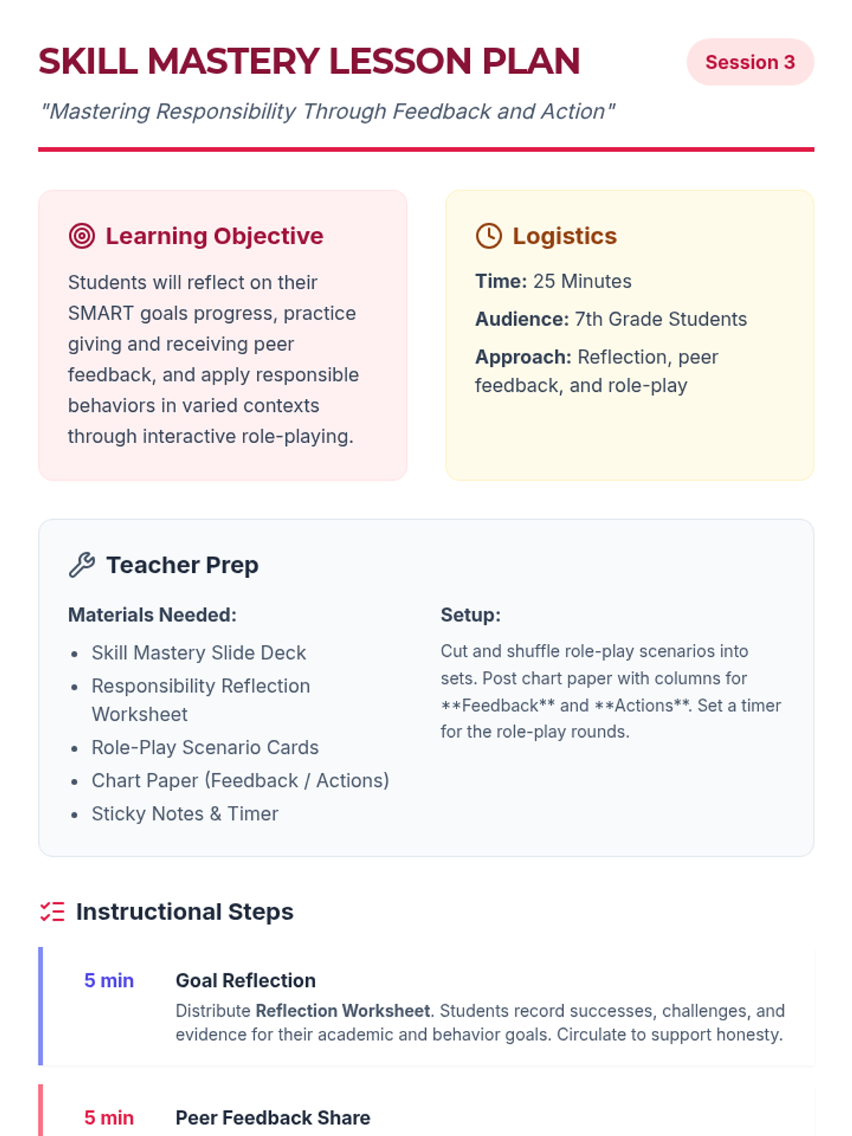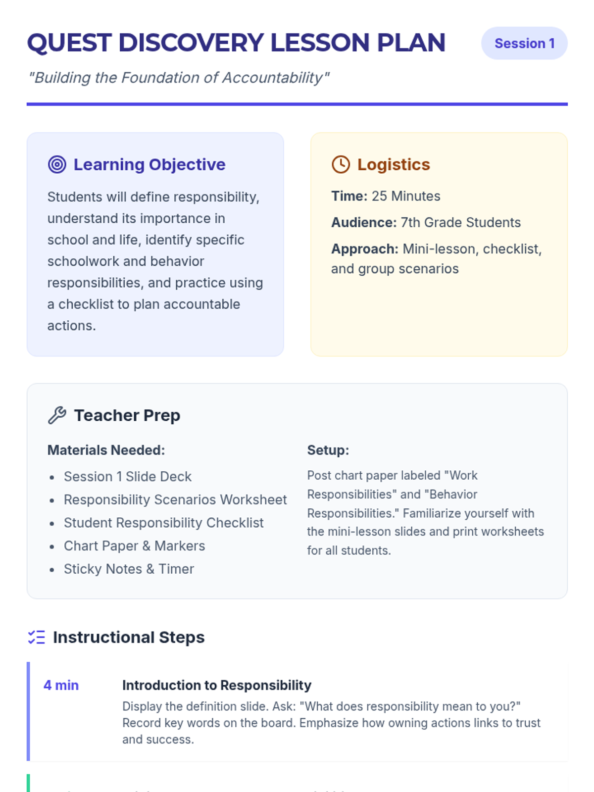 A 4-session sequence for 7th graders to explore responsibility, set SMART goals, practice accountability through role-play, and create long-term action plans for success in school and life.