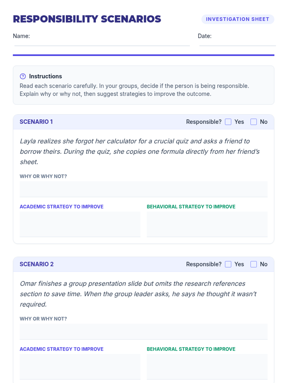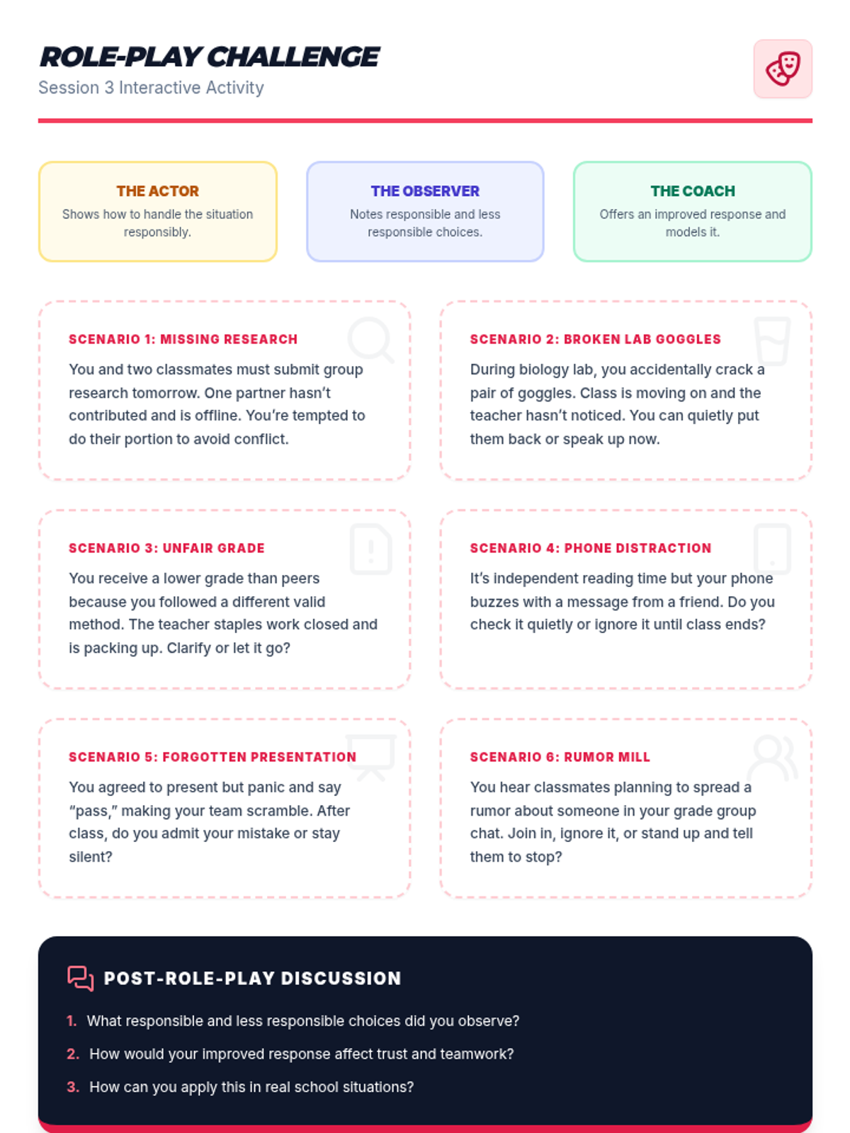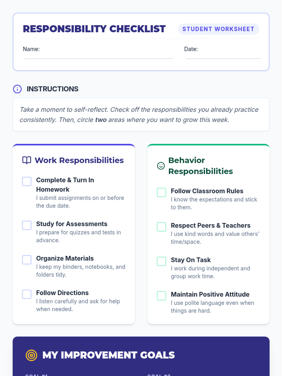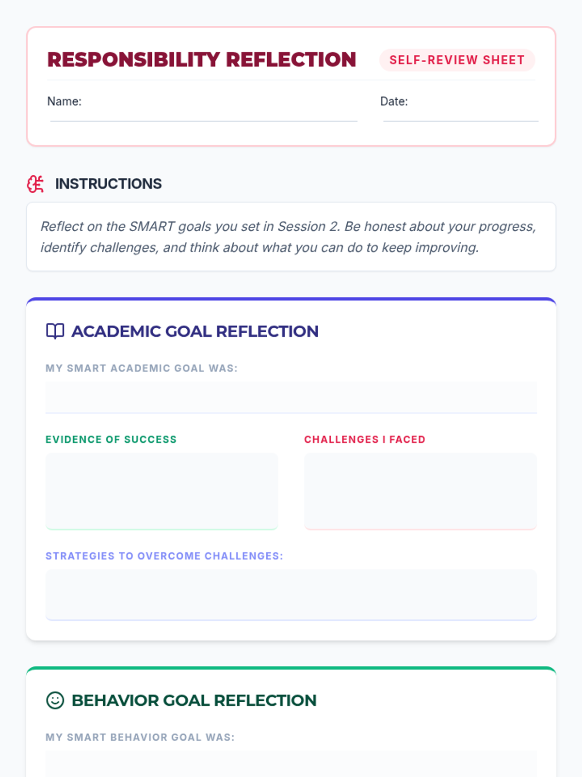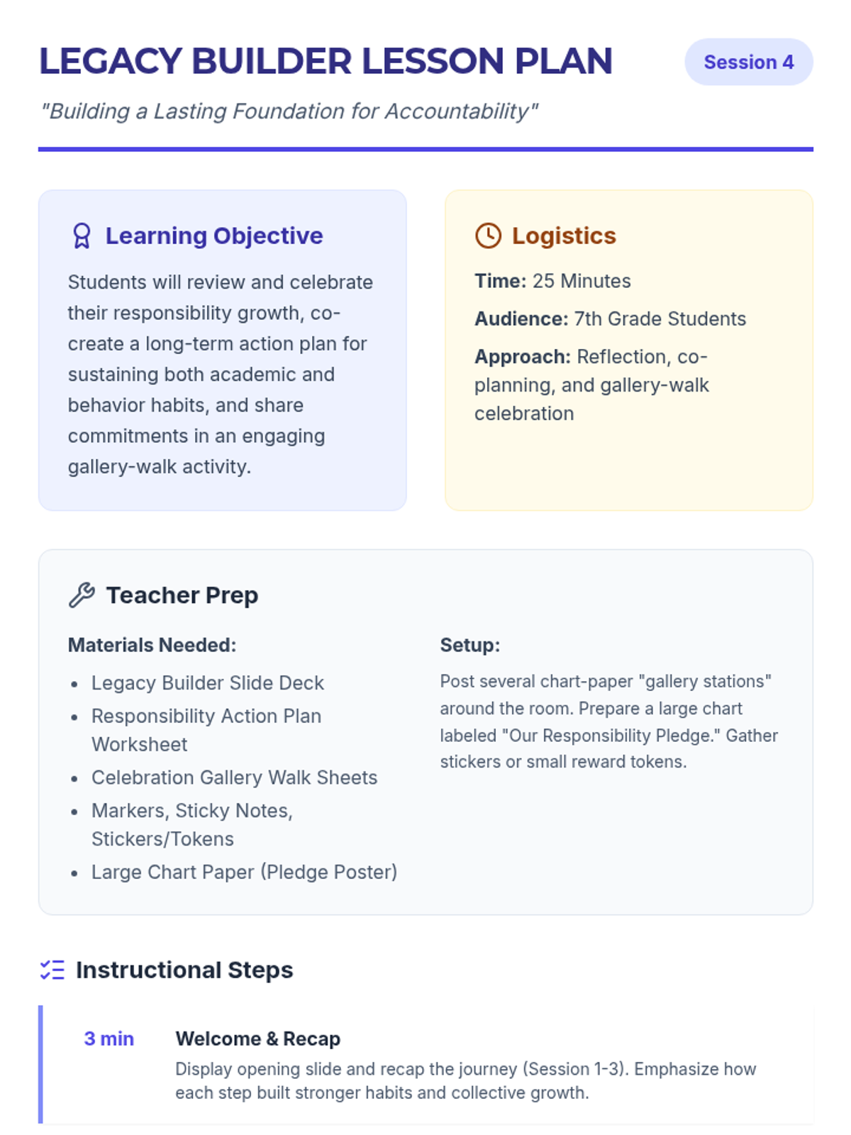 A 4-session sequence for 7th graders to explore responsibility, set SMART goals, practice accountability through role-play, and create long-term action plans for success in school and life.