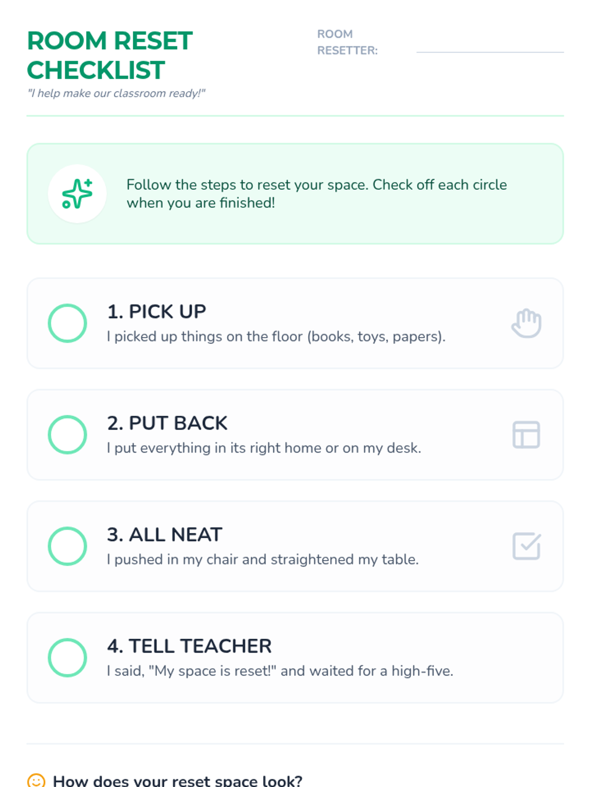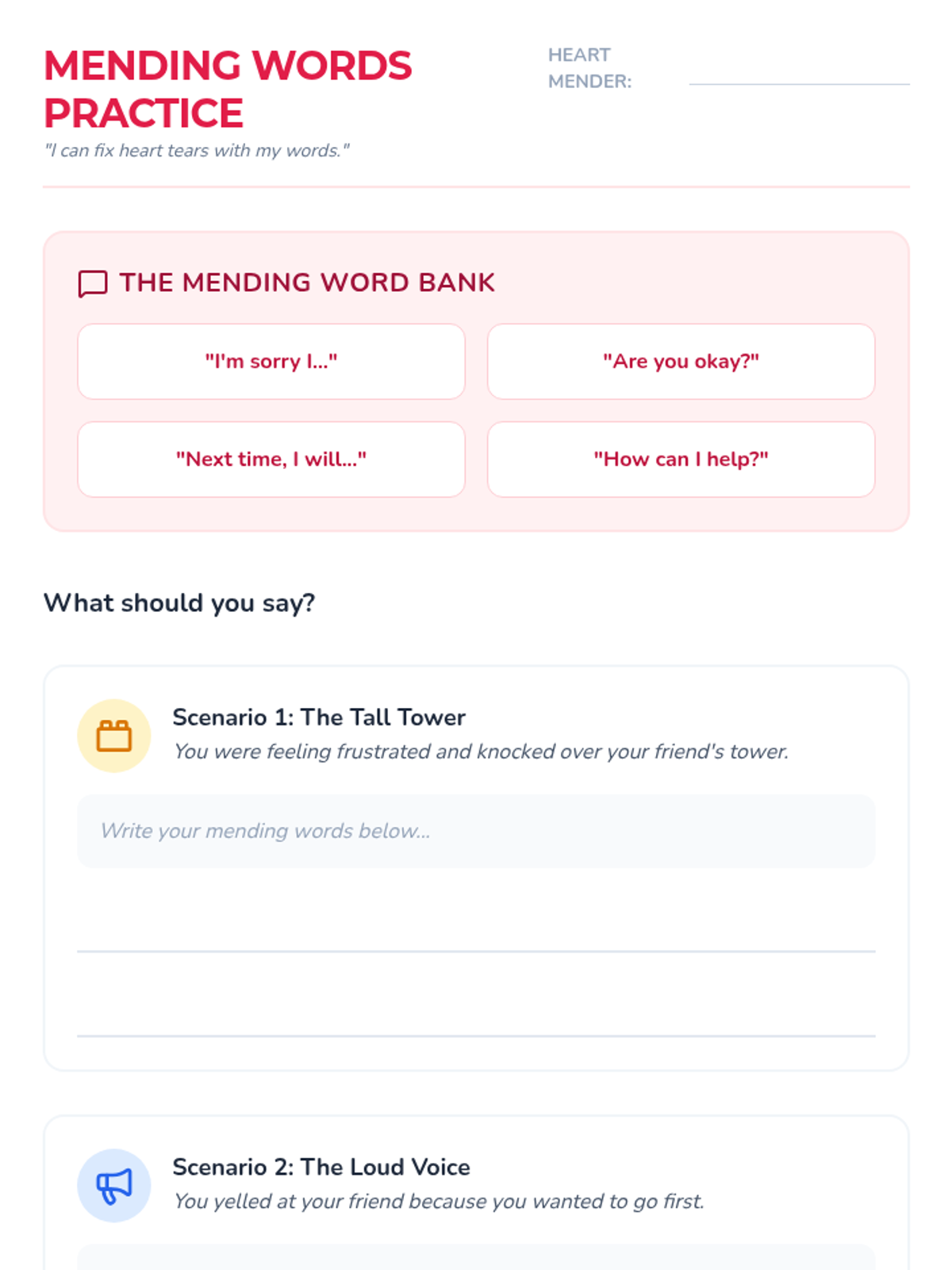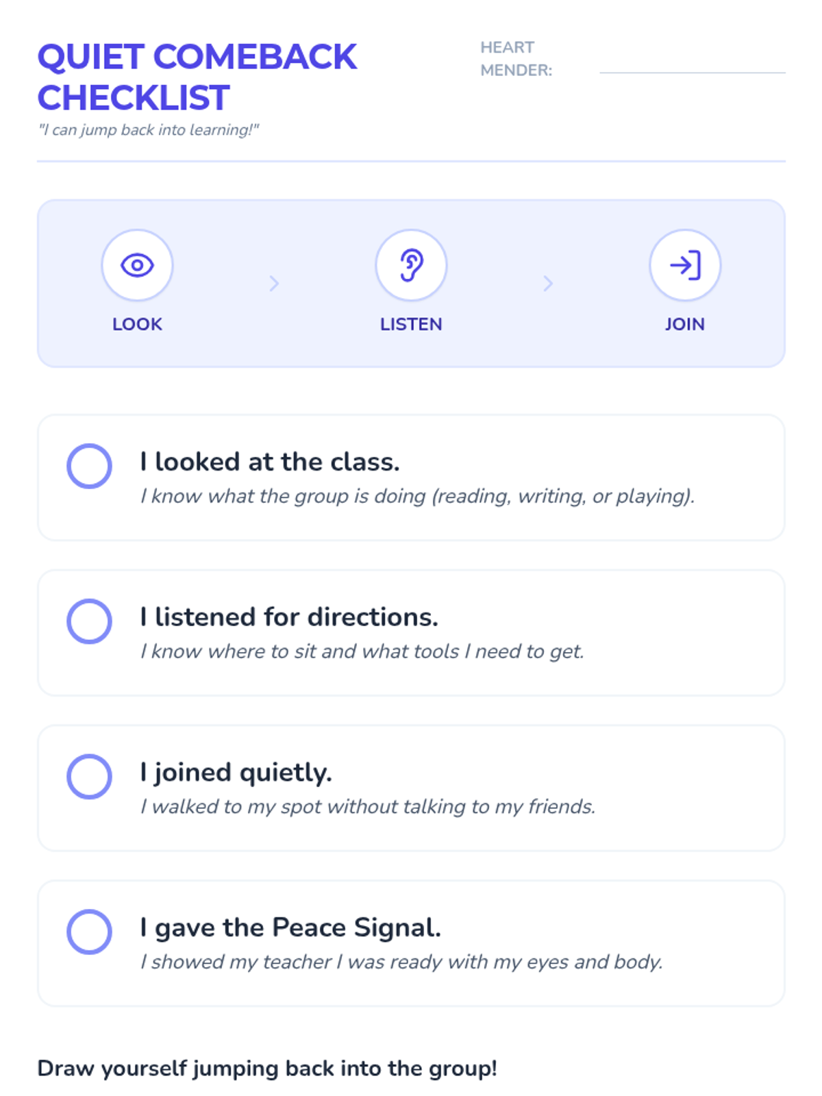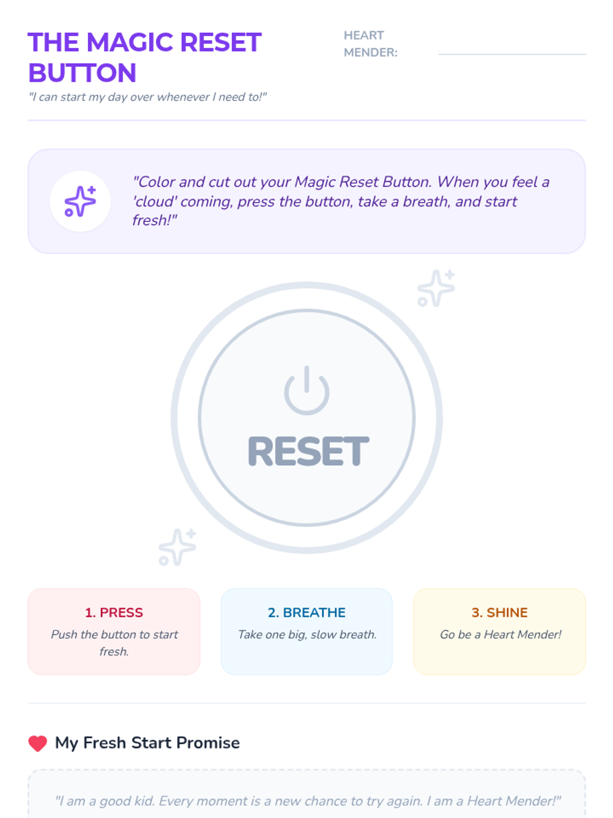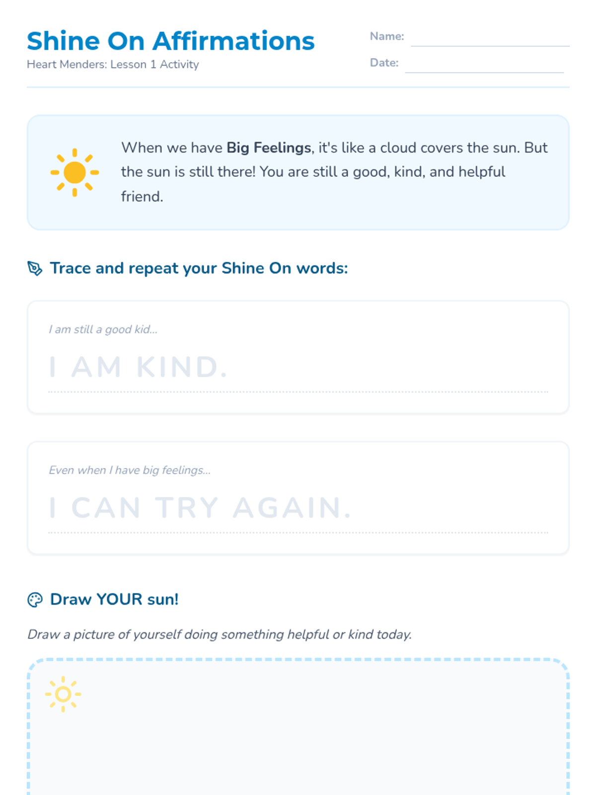 A 5-lesson sequence for 1st-grade students focused on the restorative phase following a dysregulation event. Students learn to separate their identity from their behavior, take responsibility for physical and social repairs, and embrace the power of a fresh start.
