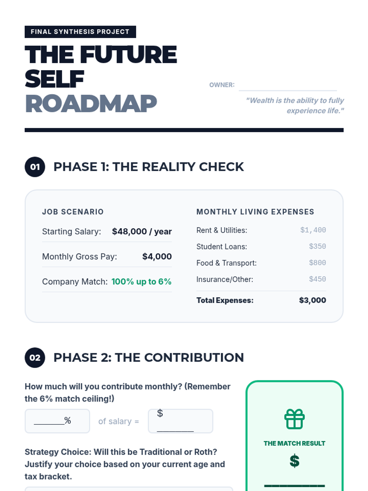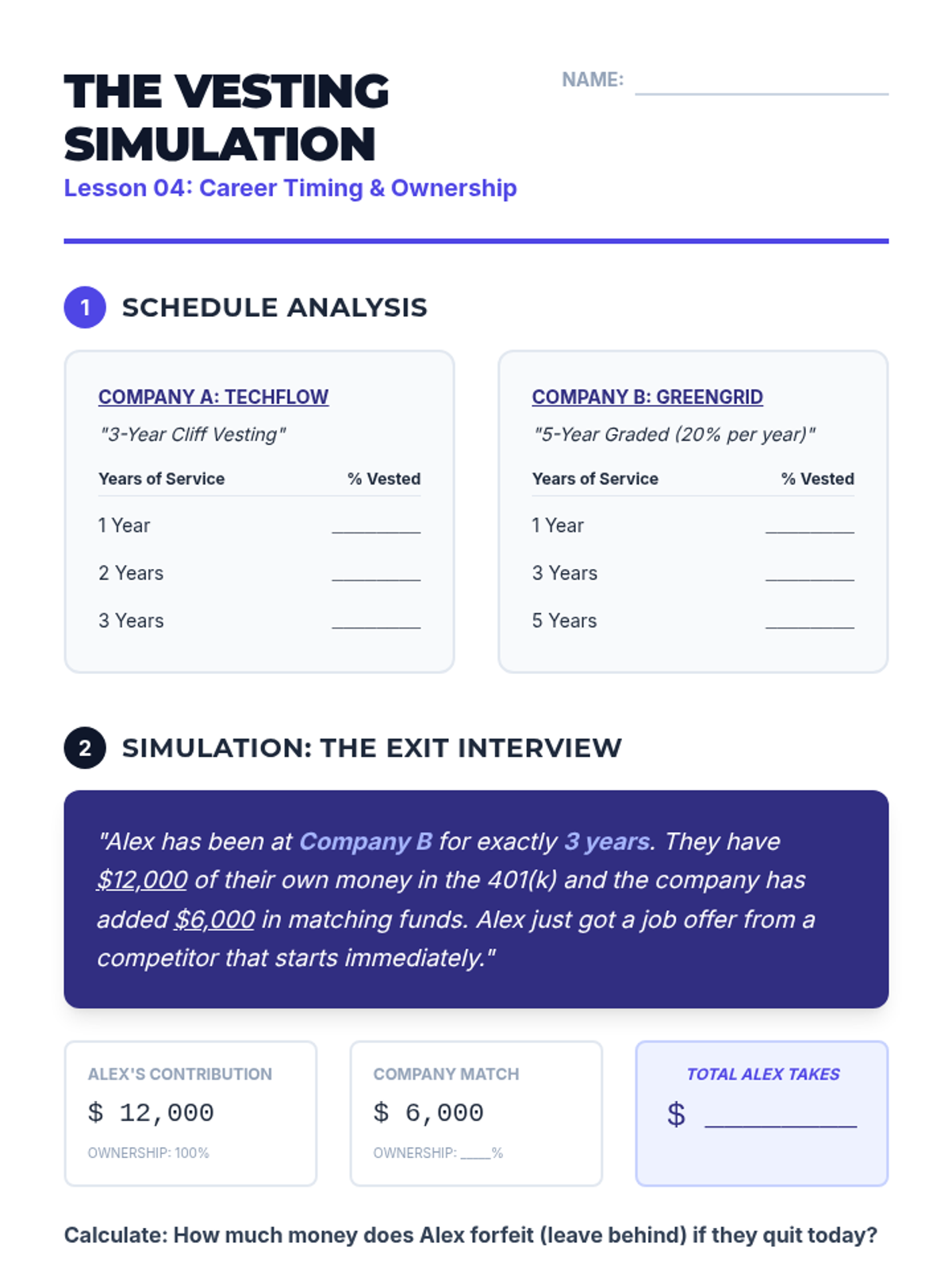 This sequence guides 12th-grade students through the essentials of long-term financial planning, focusing on retirement accounts, employer matching, tax strategies, and vesting schedules to maximize future wealth.