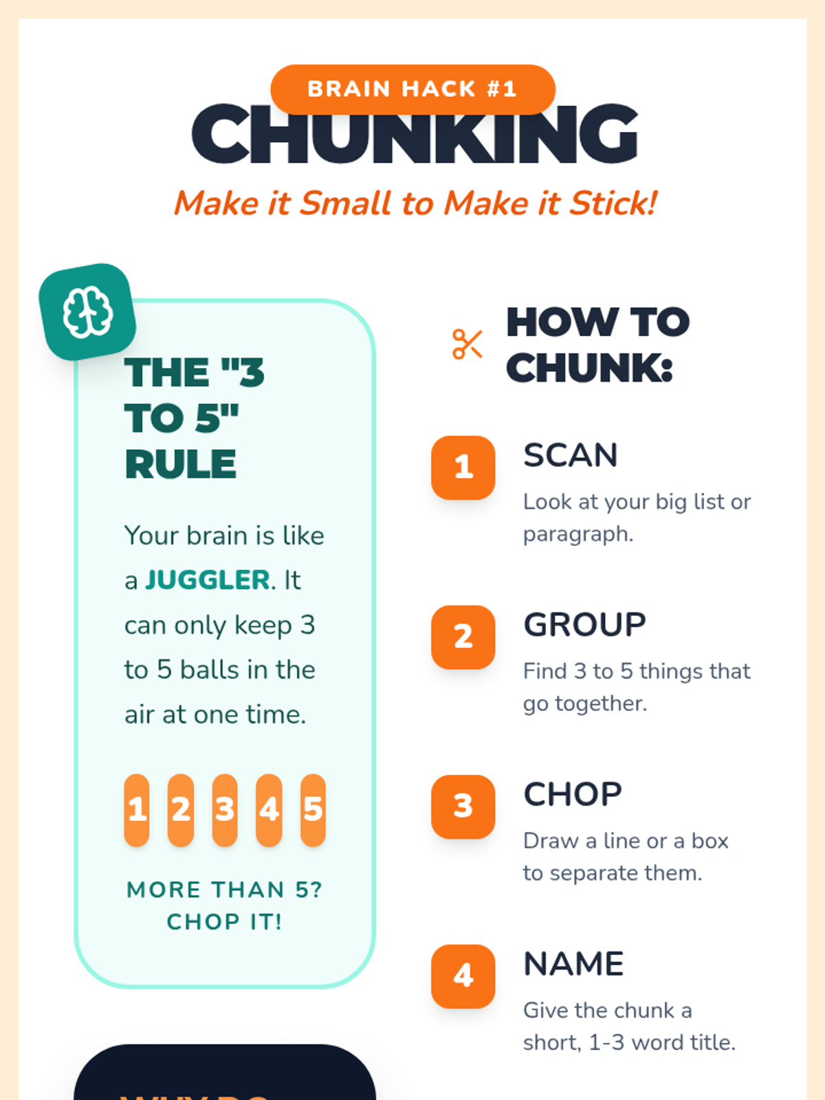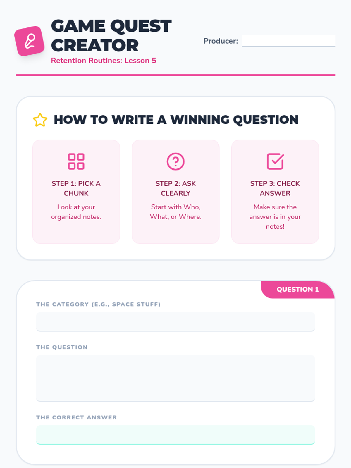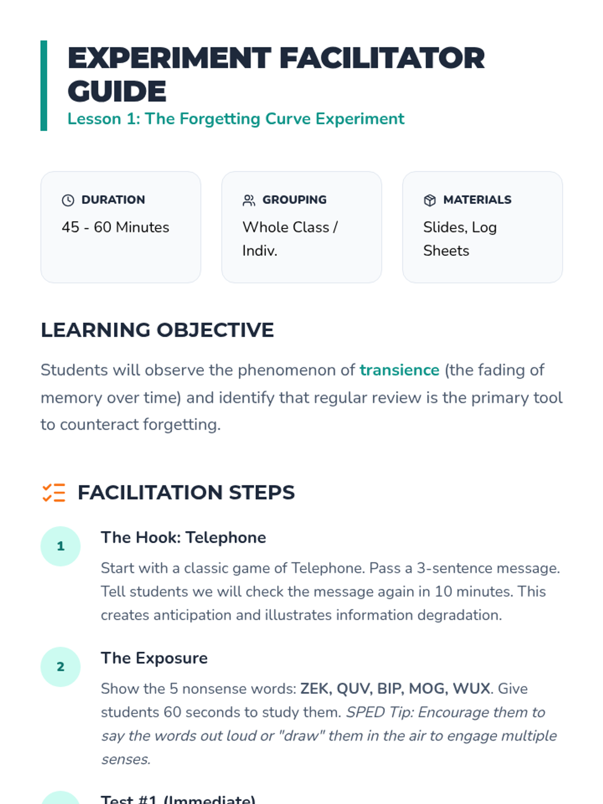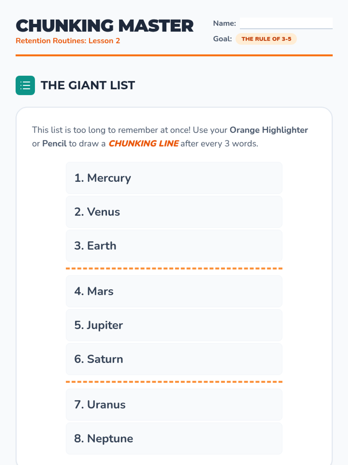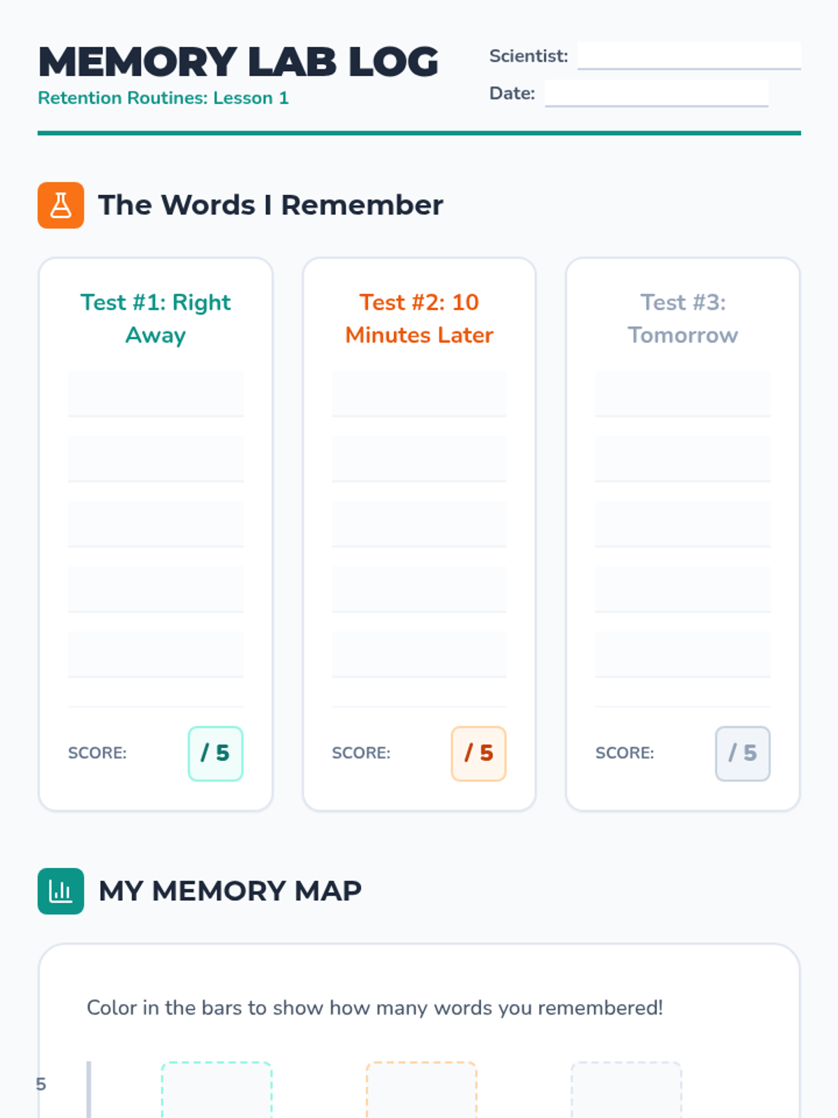 This sequence teaches 4th-grade students with special education needs how to support their working memory through structured note review and organization routines. Students explore the 'Forgetting Curve,' learn 'Chunking' techniques, practice active recall, and establish a 'Spaced Repetition' schedule to improve long-term retention.