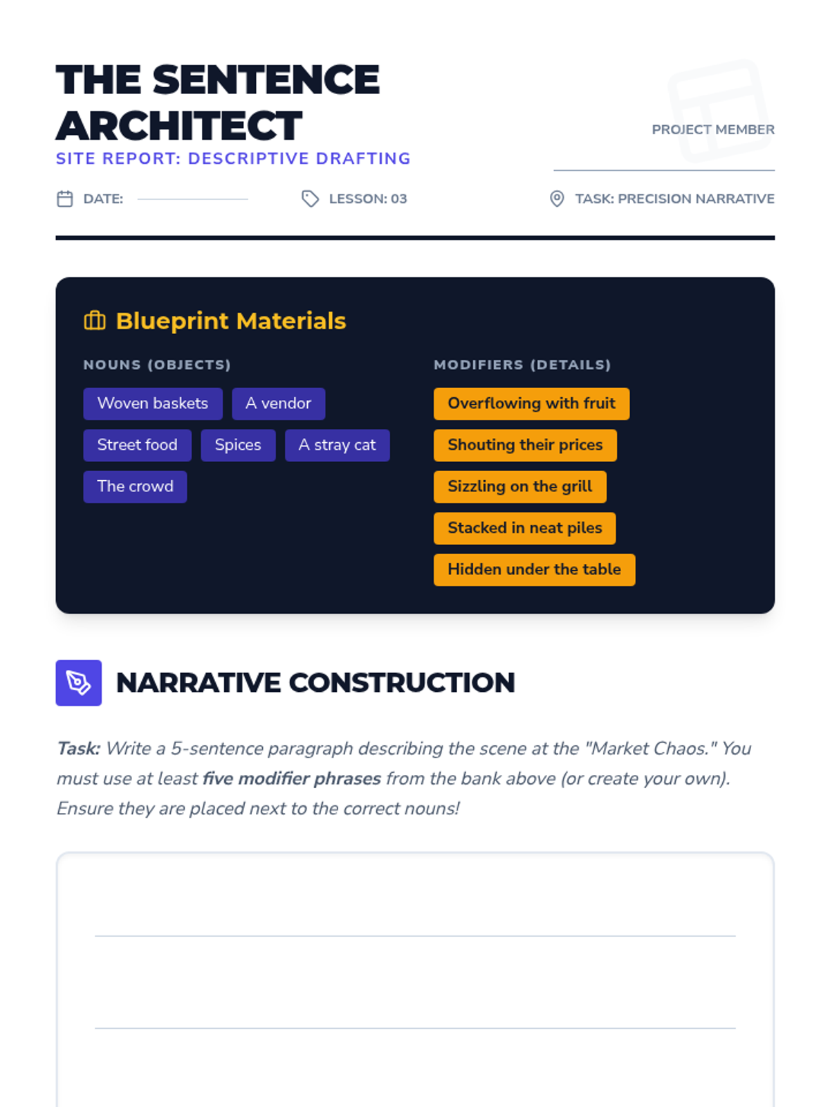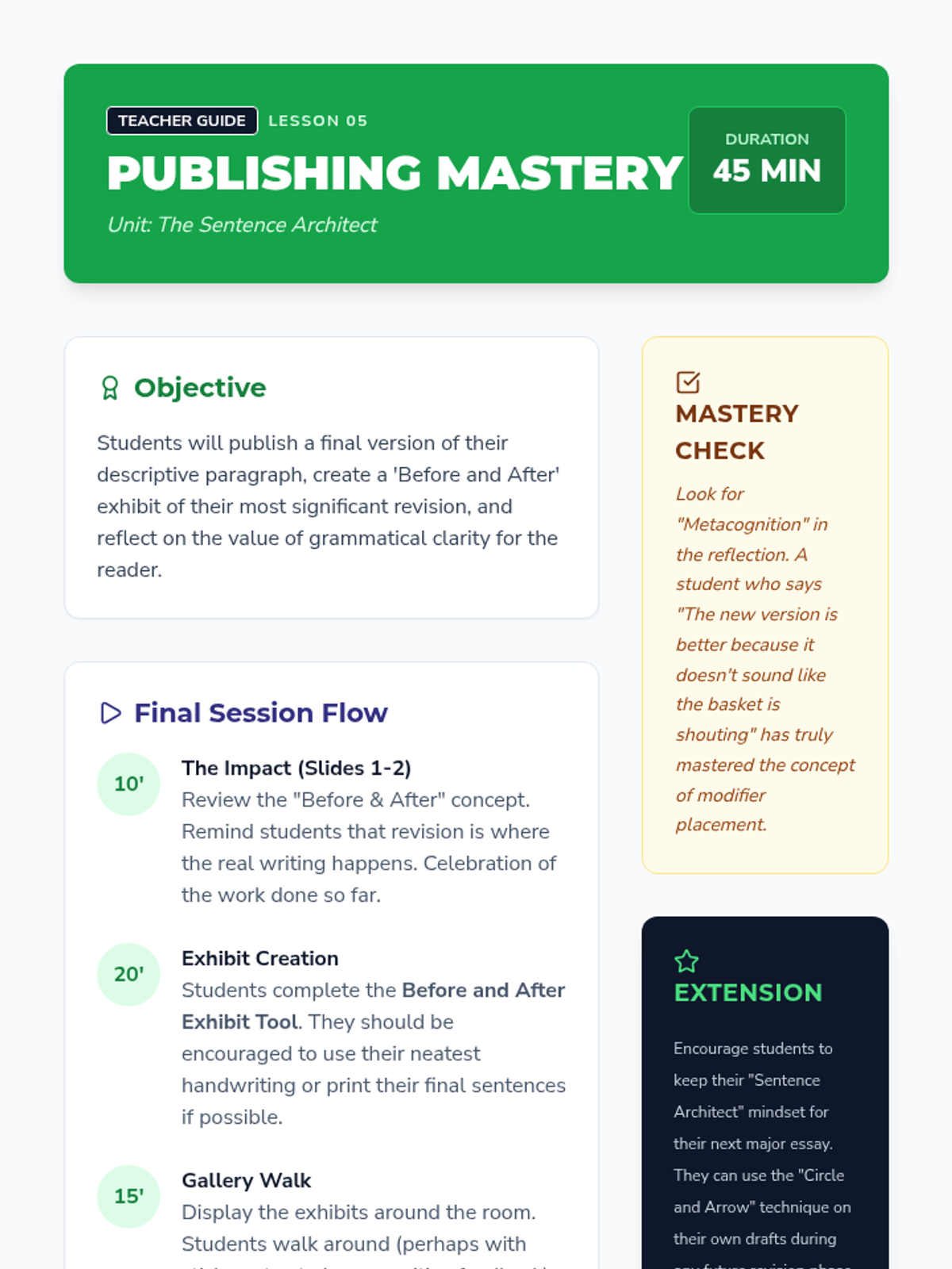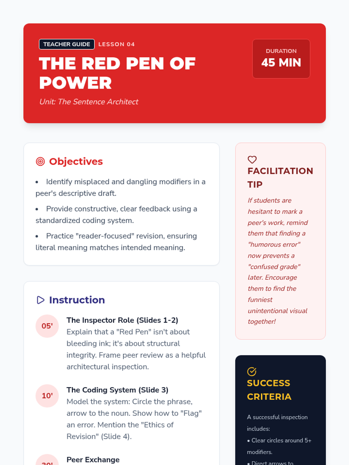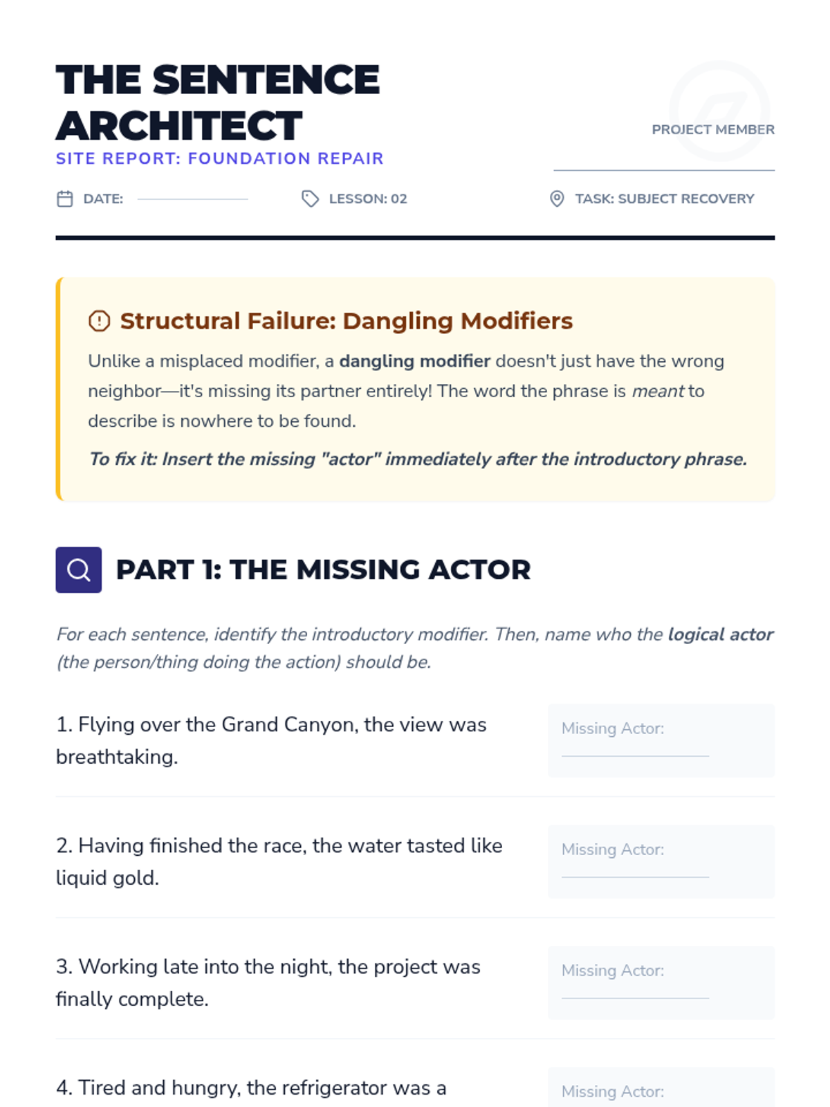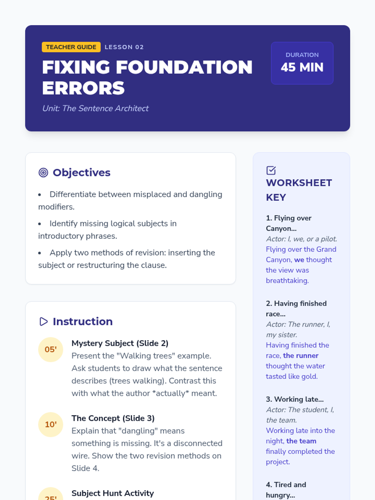 This sequence guides 7th-grade students through the process of identifying and correcting misplaced and dangling modifiers. Students move from diagnostic reading to active revision, ultimately applying these grammar skills to their own writing to enhance clarity and flow.