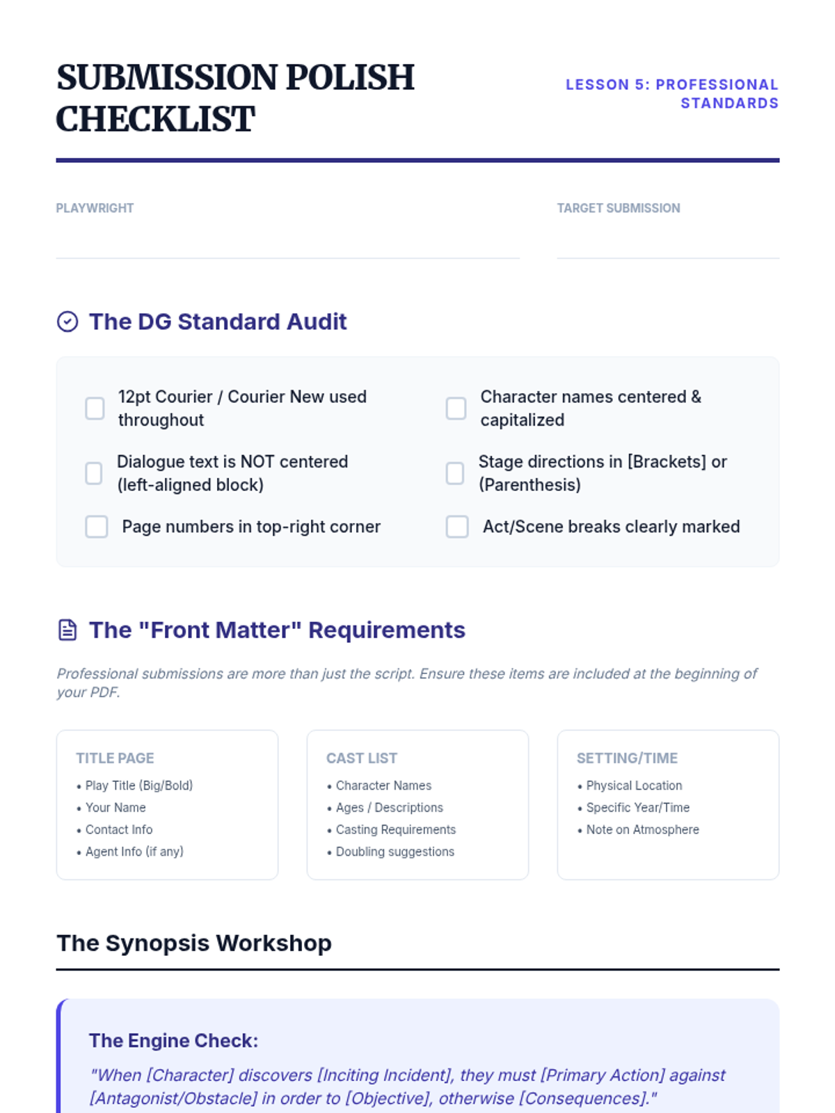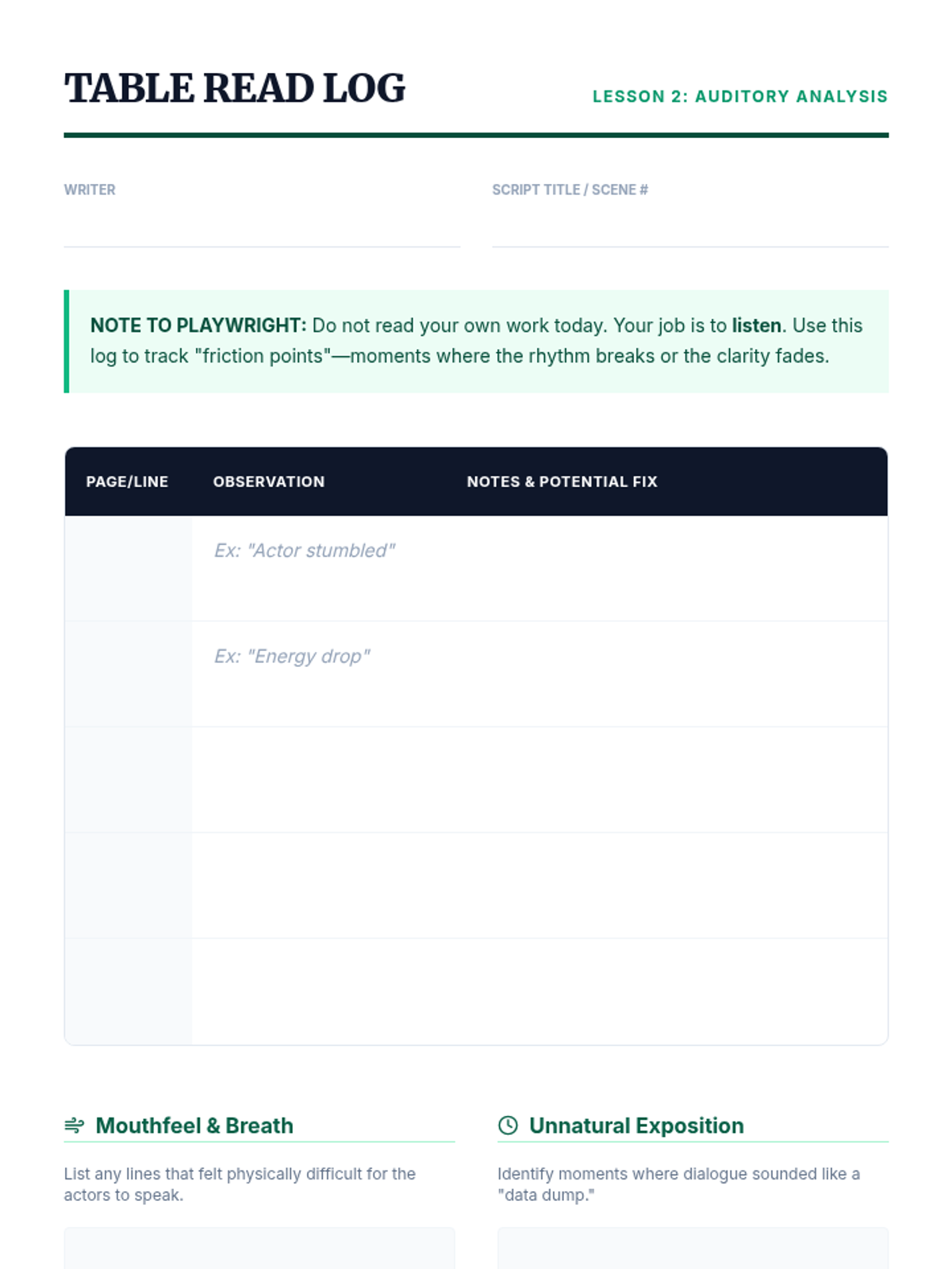 An immersive sequence for undergraduate playwriting students focusing on the professional iterative process of drafting, hearing work aloud, and executing rigorous rewrites using structured feedback frameworks.