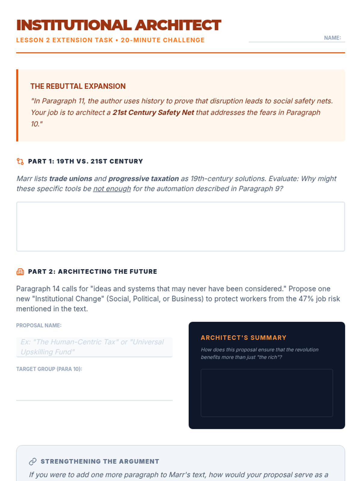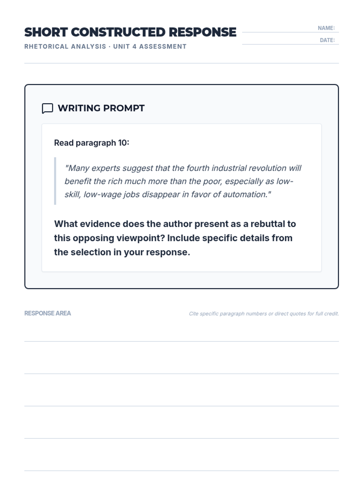 A two-lesson unit focused on analyzing argumentative structures and multimodal features in the text 'Why Everyone Must Get Ready for the Fourth Industrial Revolution.' Students will explore thesis development, evidence, counterarguments, and the impact of graphic features.
