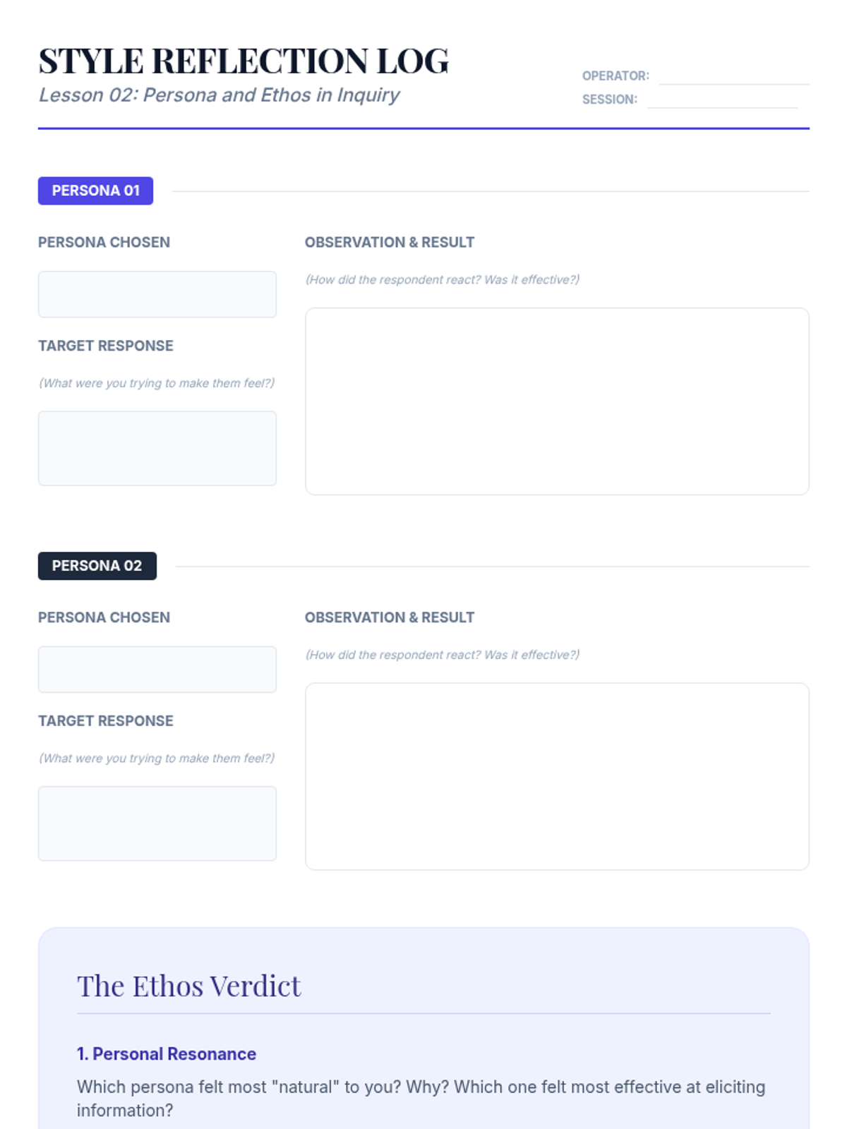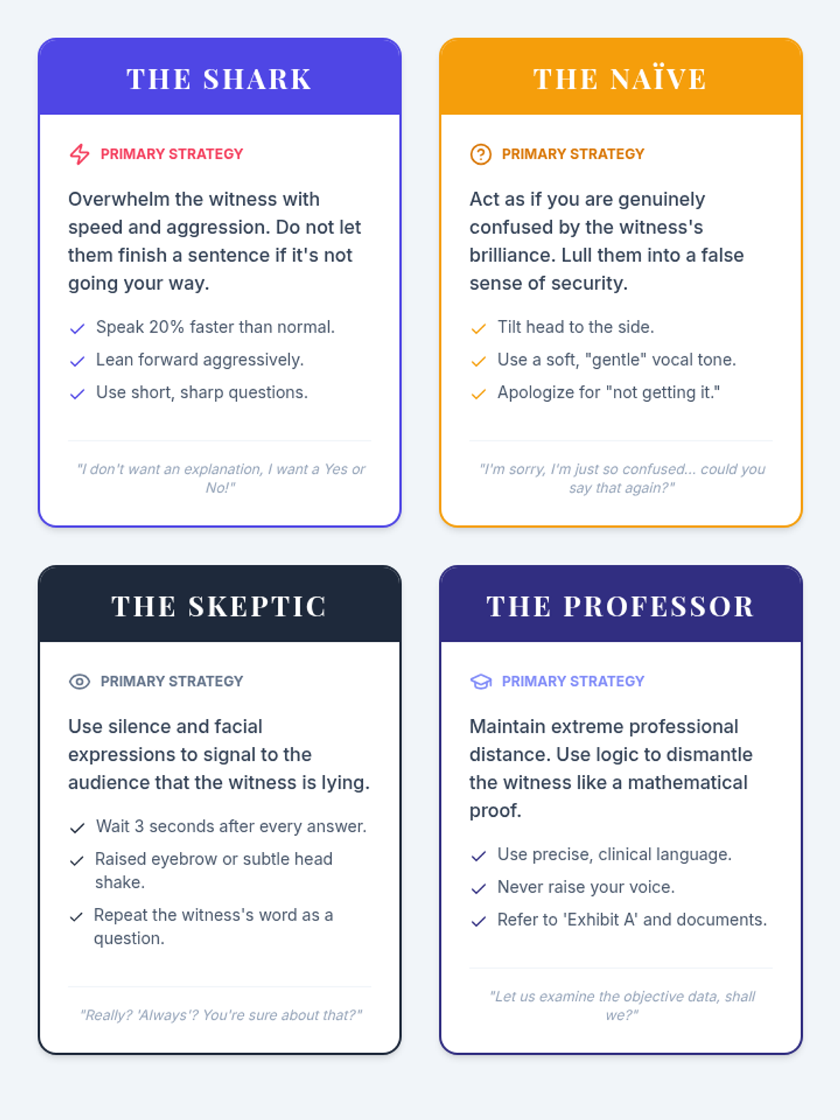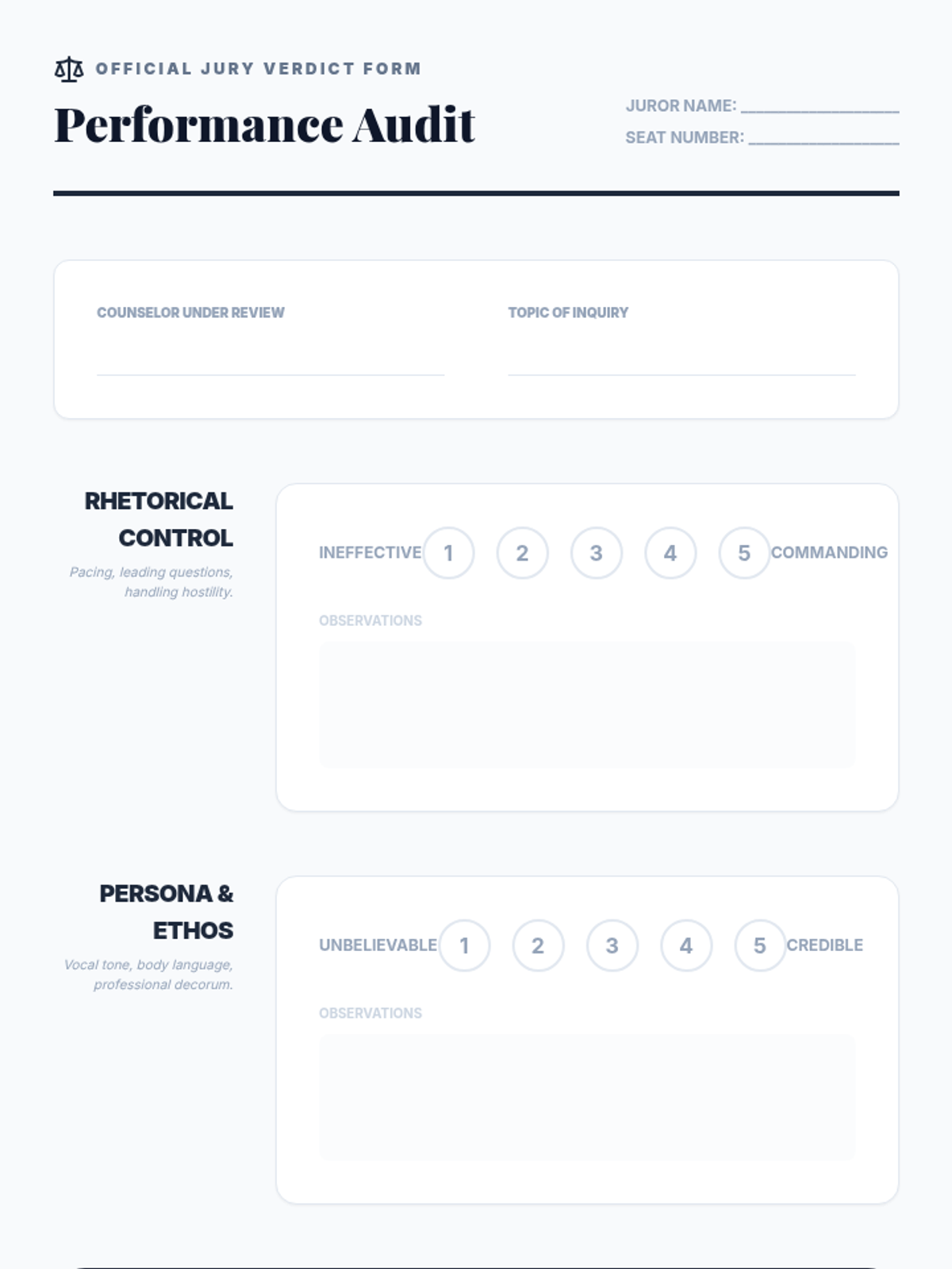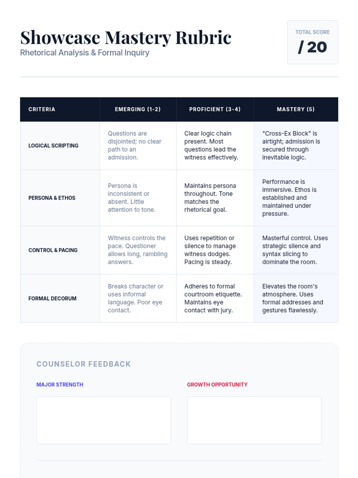 An inquiry-based exploration of rhetorical strategies in questioning. Students analyze historical models, experiment with vocal personas, and master techniques for handling hostile witnesses to prepare for a formal cross-examination showcase.