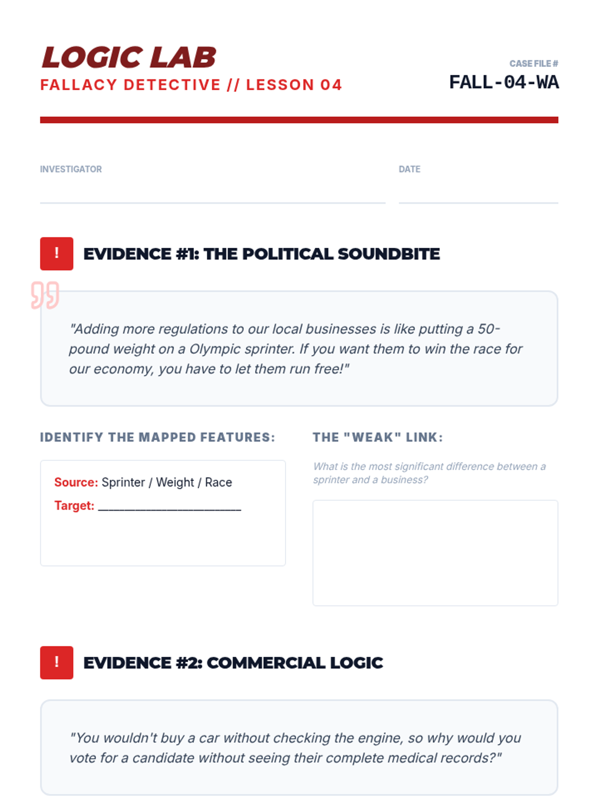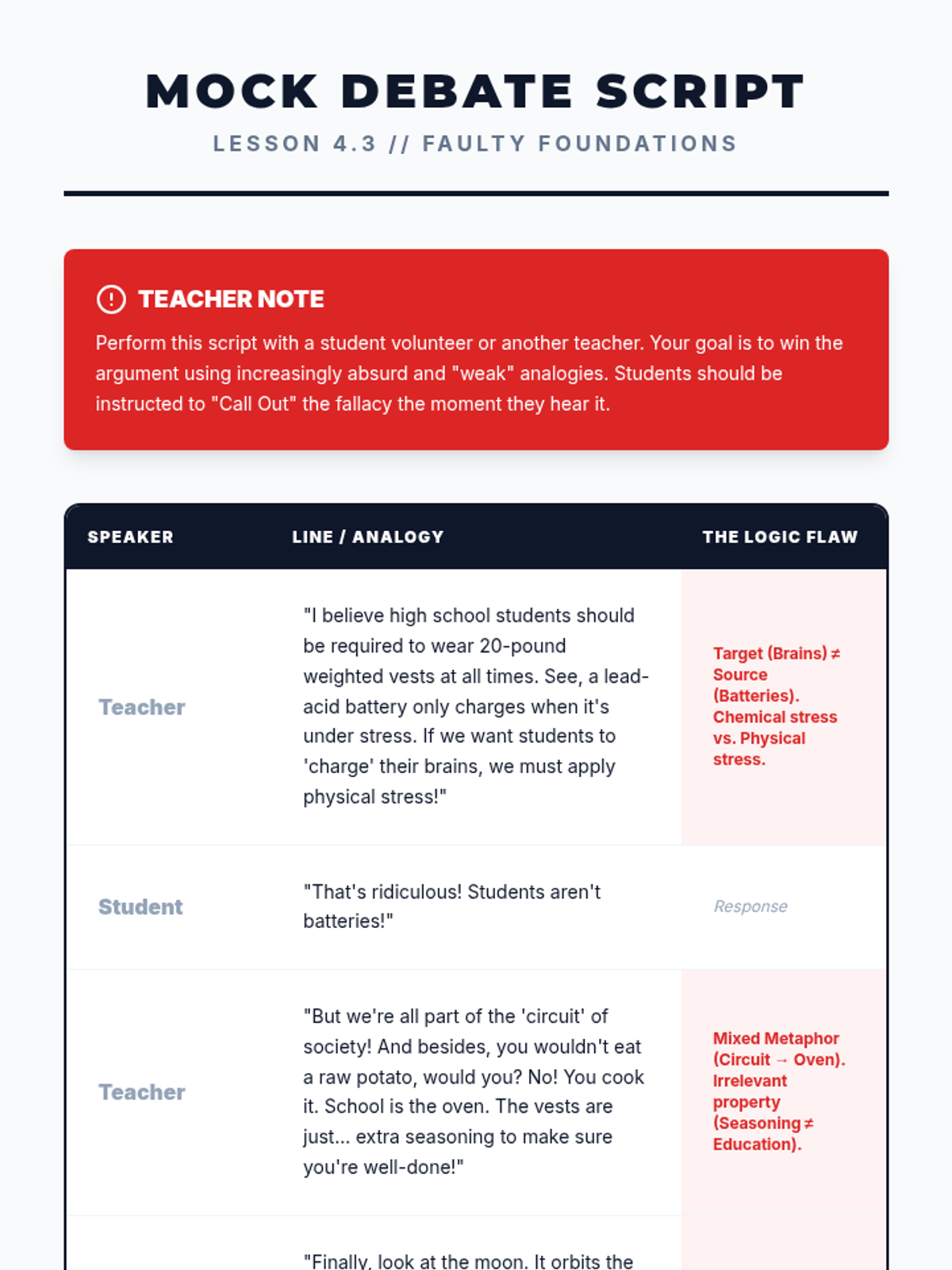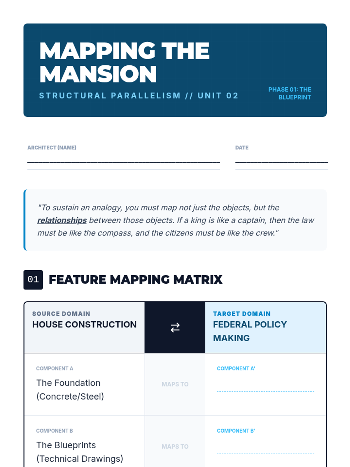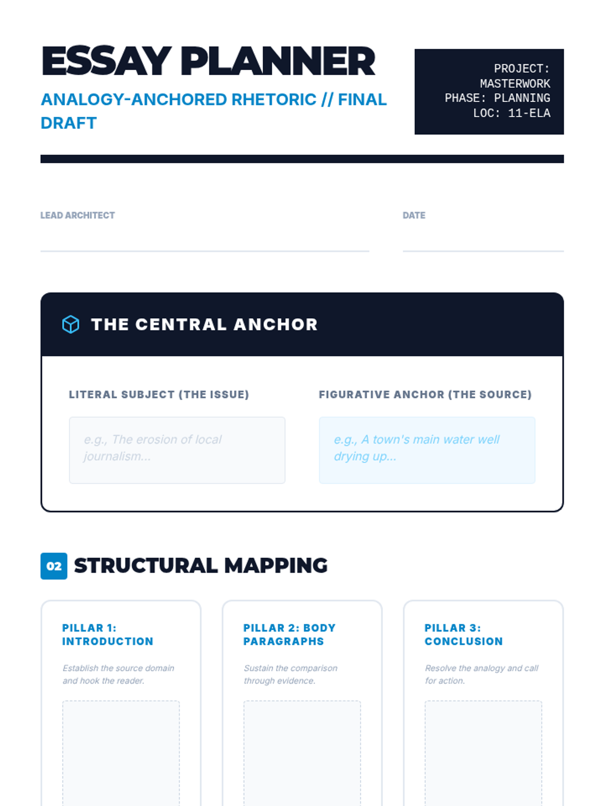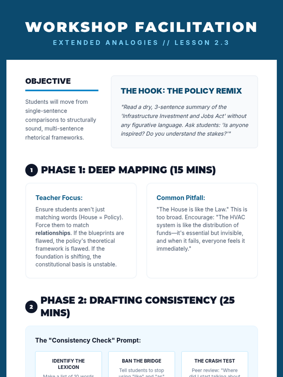This sequence guides 11th-grade students through the rhetorical power of analogies, from analyzing classic examples to constructing original extended analogies for persuasive writing. Students learn to map complex ideas onto familiar concepts, simplify the abstract, and identify logical fallacies in comparative reasoning.