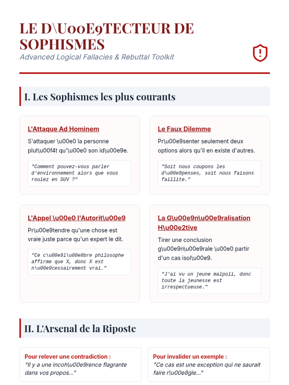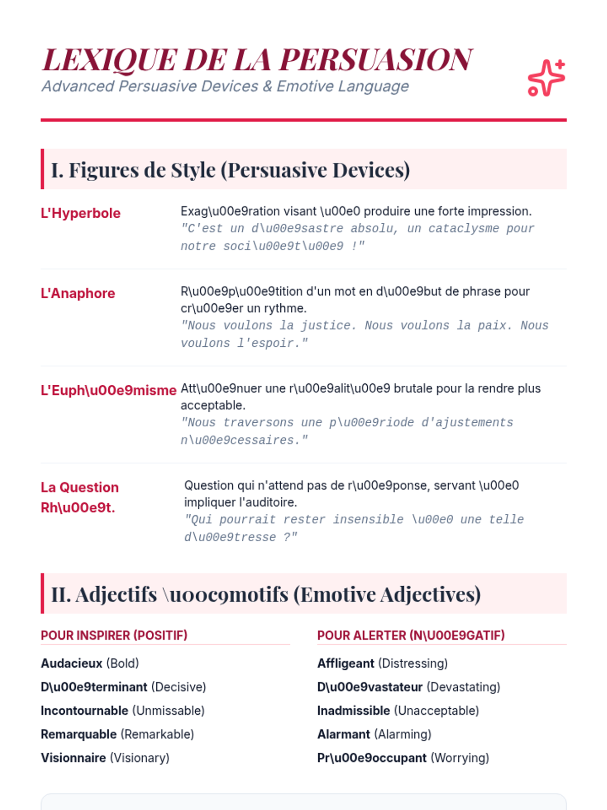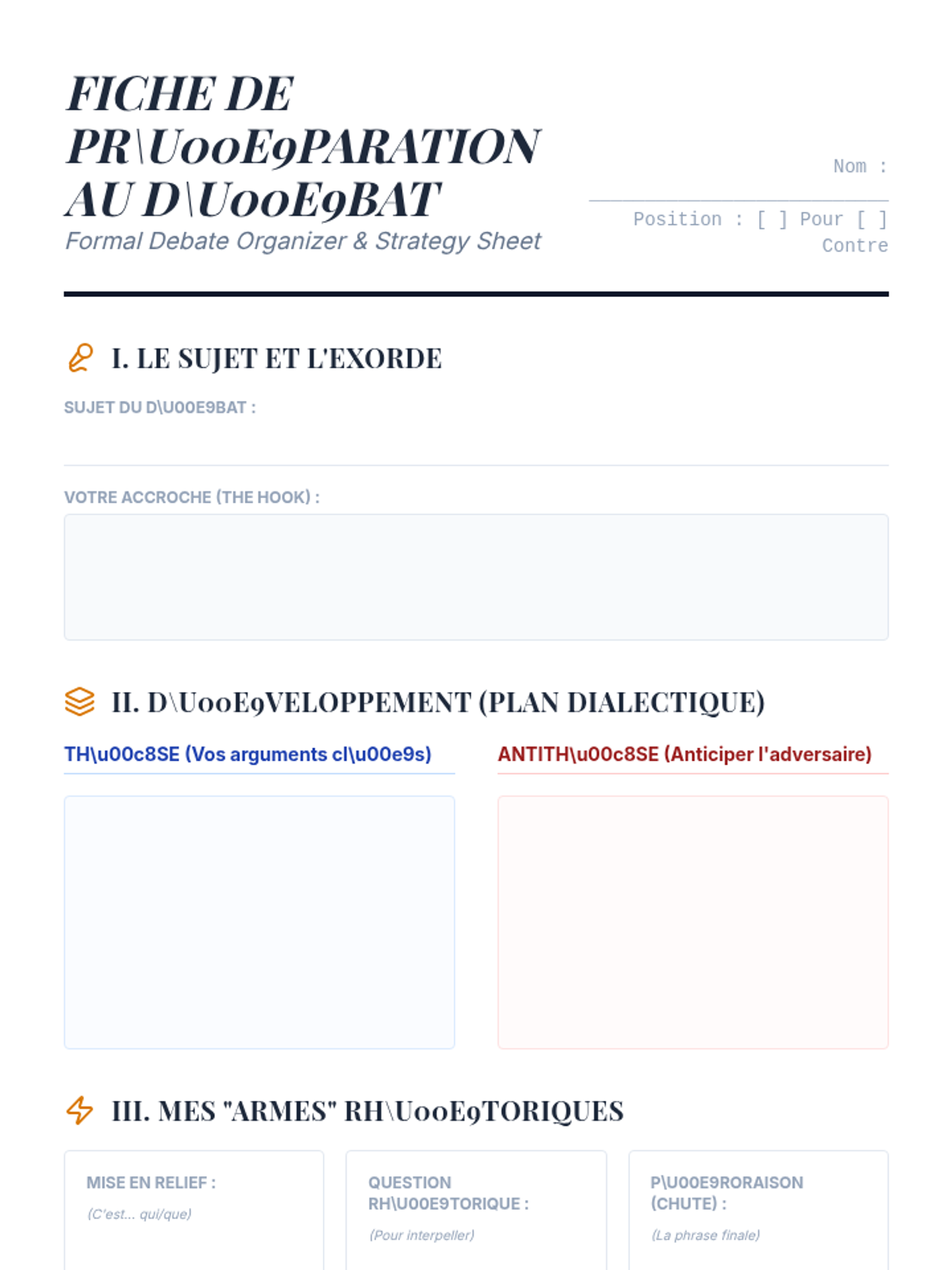 This advanced French sequence focuses on rhetorical strategies and formal debate techniques. Students master complex structures like Th\u00e8se-Antith\u00e8se-Synth\u00e8se, emphatic grammar, and persuasive vocabulary to engage in high-level oral argumentation.