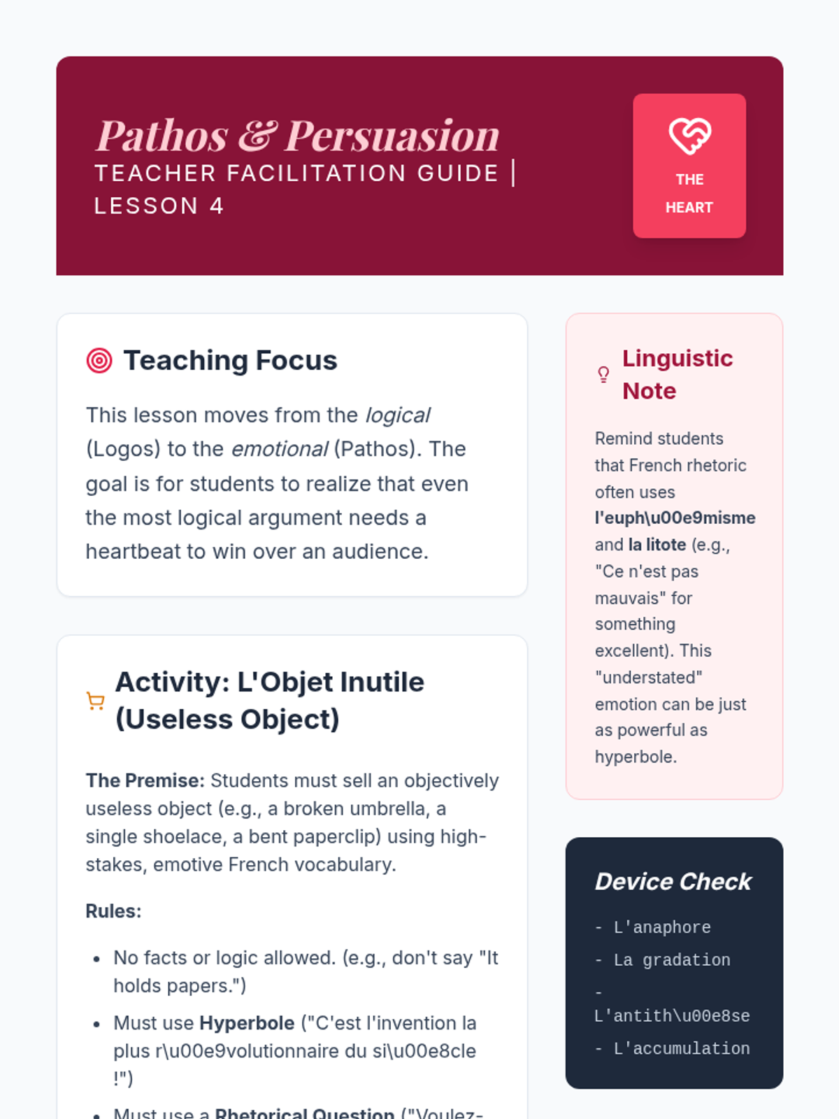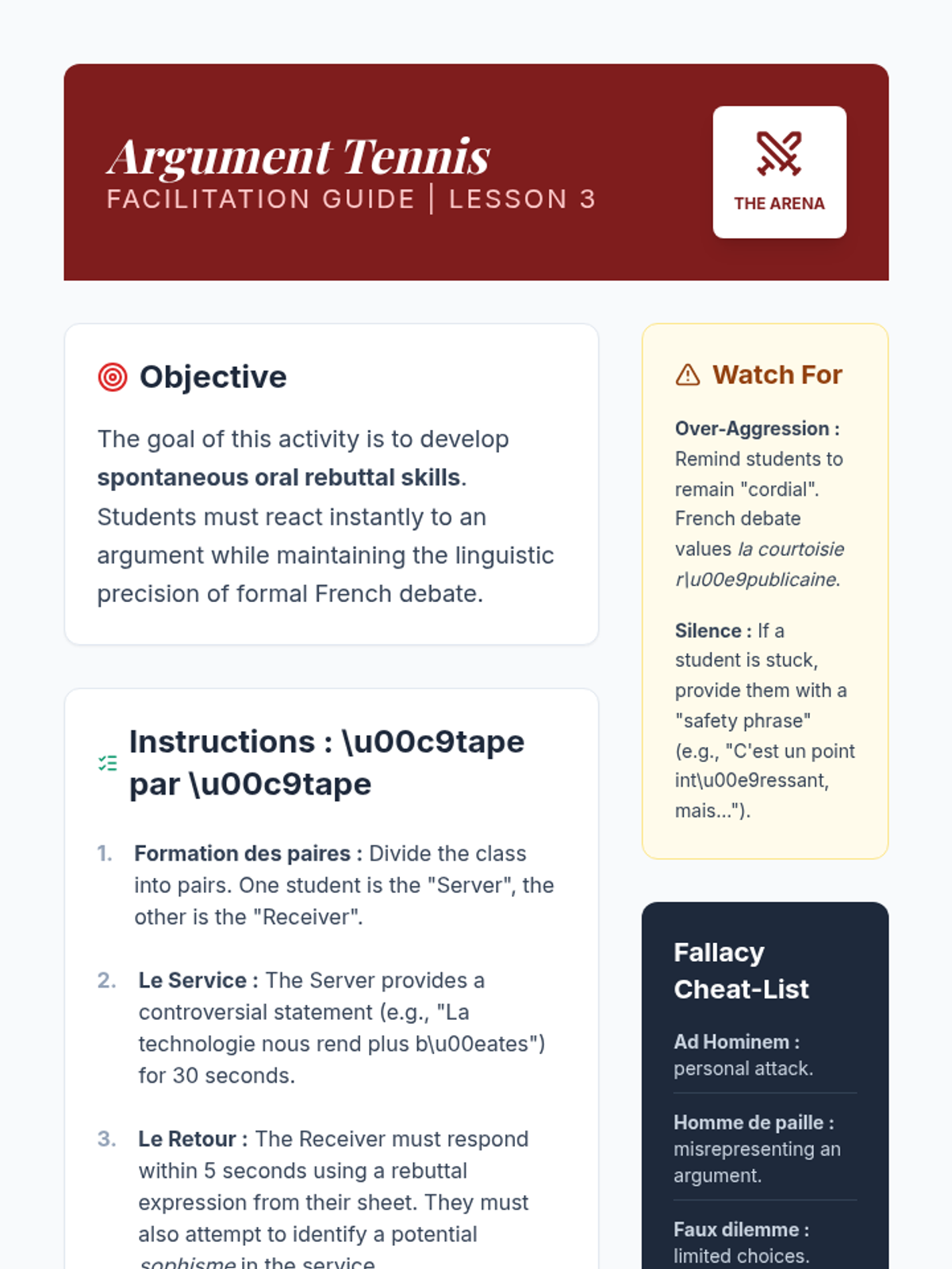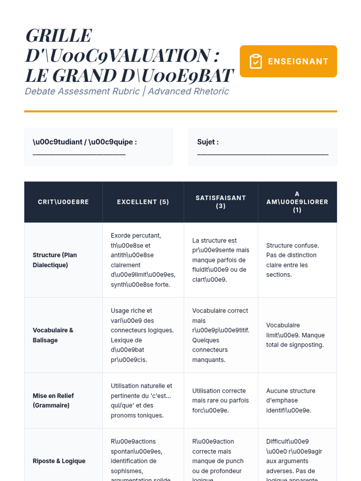 This advanced French sequence focuses on rhetorical strategies and formal debate techniques. Students master complex structures like Th\u00e8se-Antith\u00e8se-Synth\u00e8se, emphatic grammar, and persuasive vocabulary to engage in high-level oral argumentation.