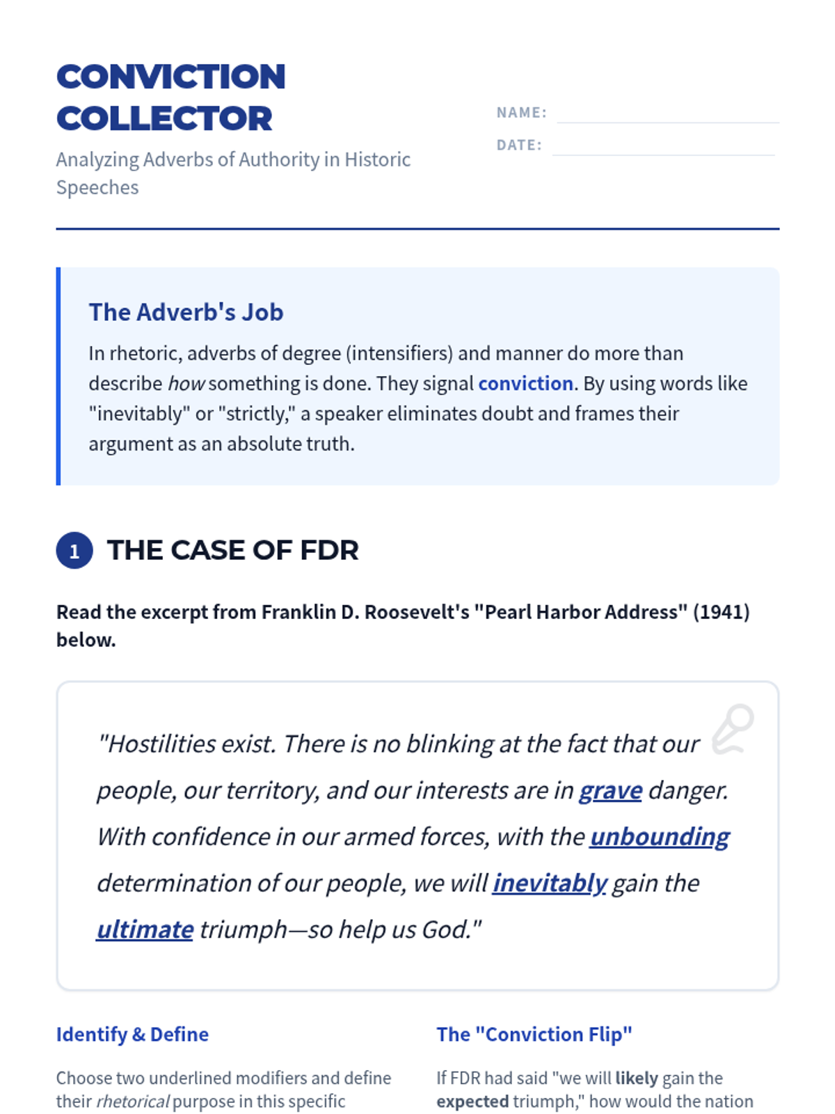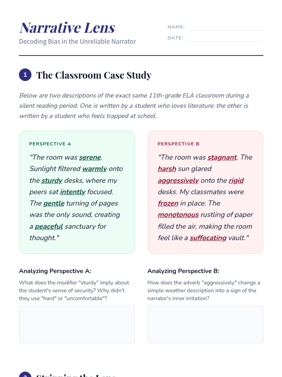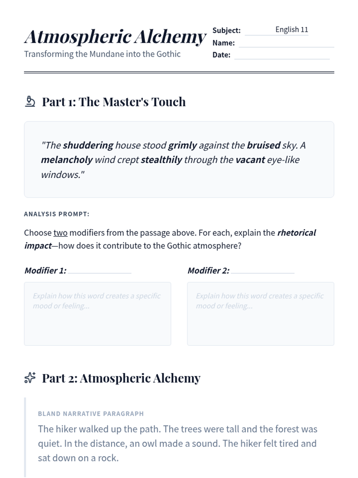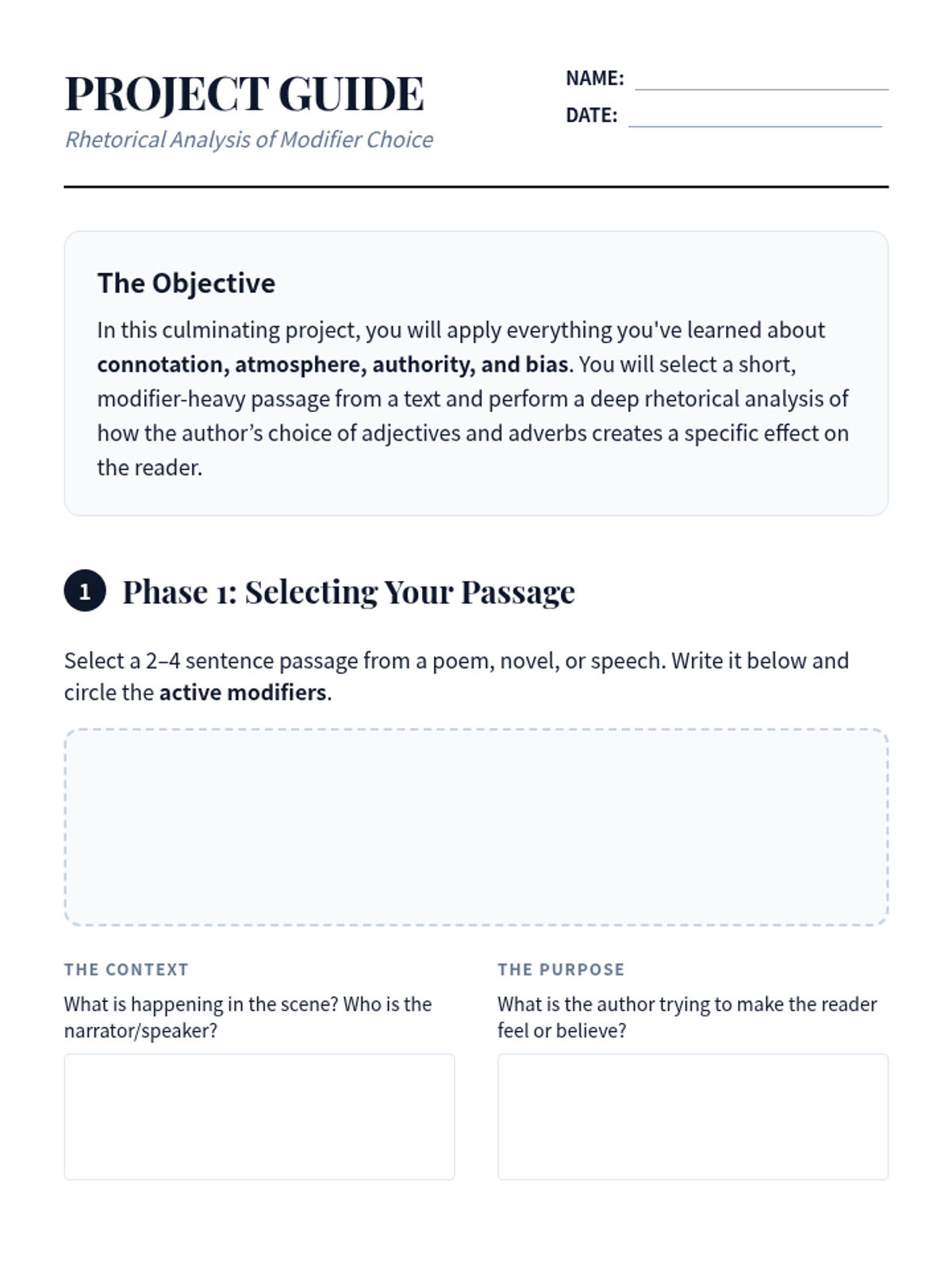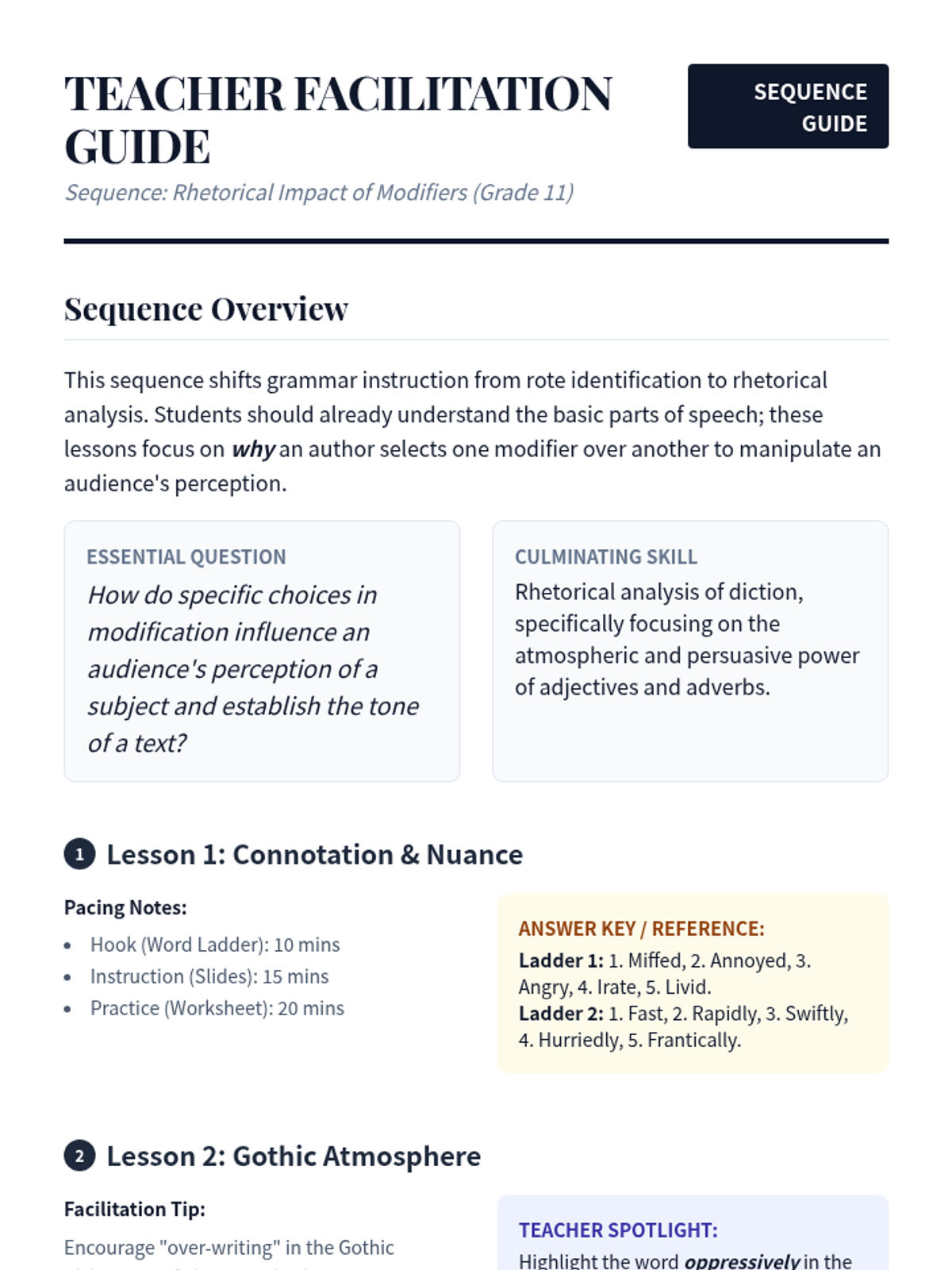 A high school ELA sequence exploring how adjectives and adverbs function as rhetorical tools to shape tone, atmosphere, and narrator reliability. Students progress from analyzing simple connotations to writing full rhetorical analyses of modifier choices in classic and modern texts.