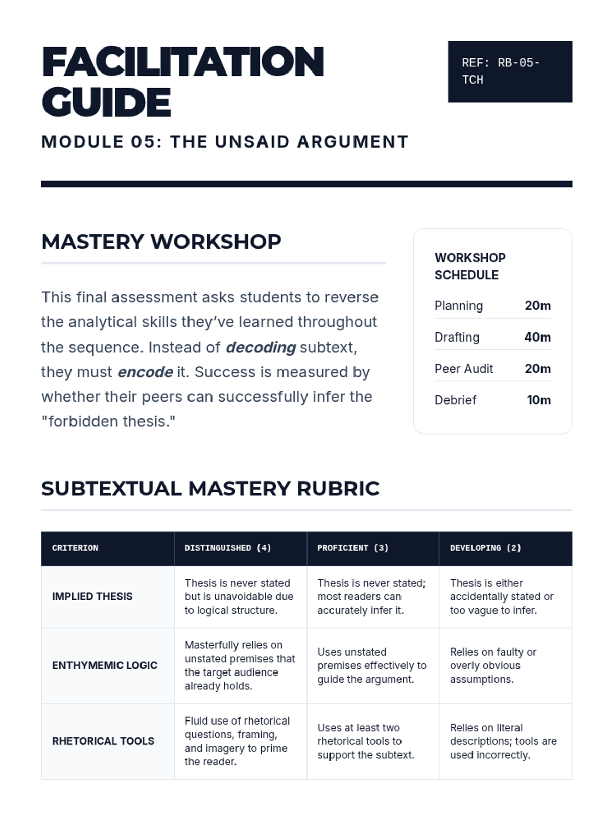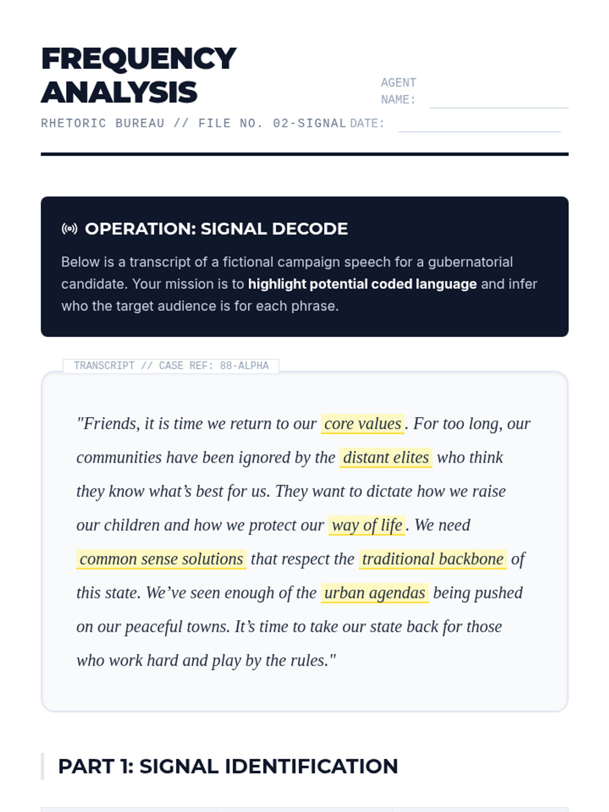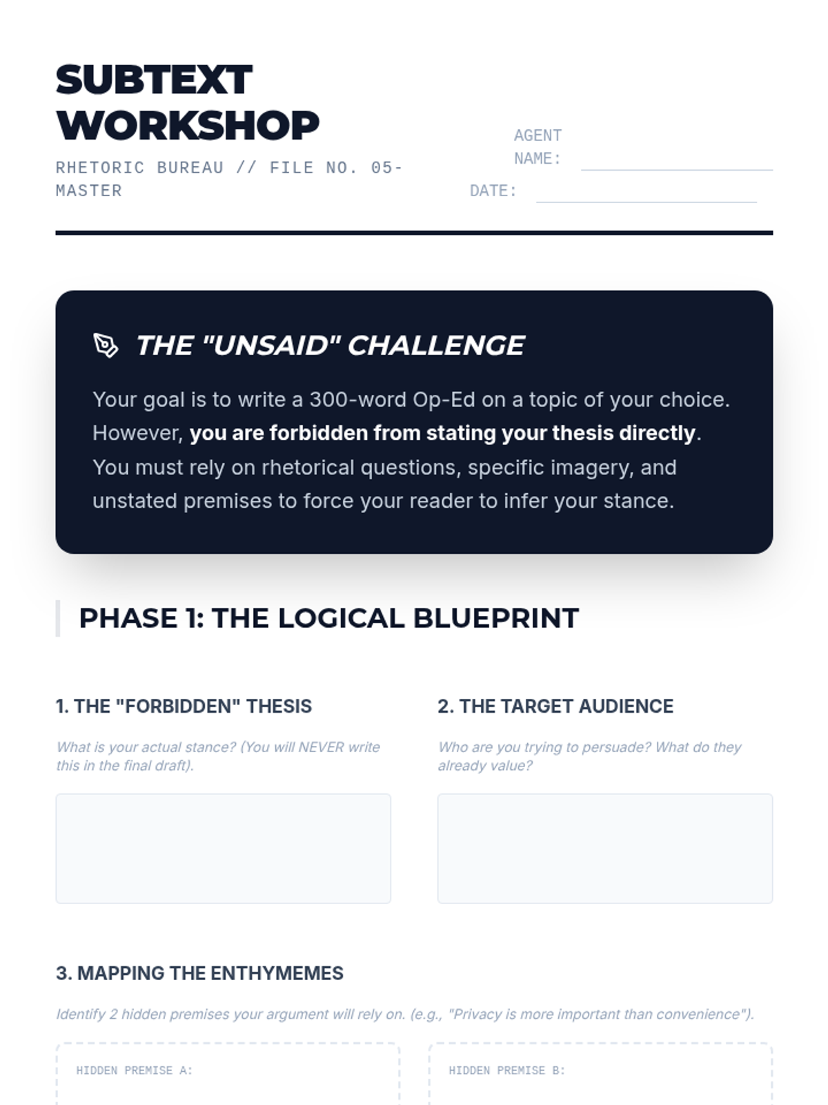 A high-level rhetoric sequence for undergraduate students focusing on the mechanics of inference in public discourse. Students explore enthymemes, coded language, satire, and media bias to understand how persuasion operates through what remains unsaid.