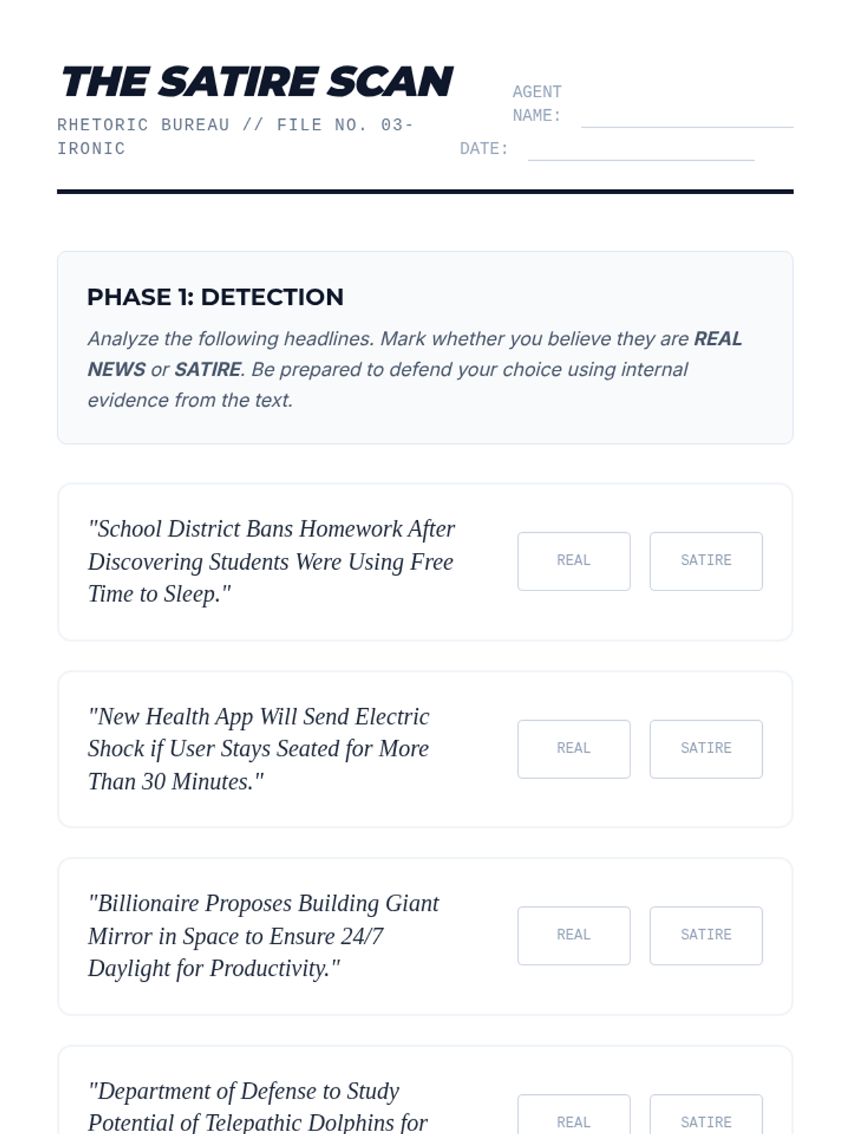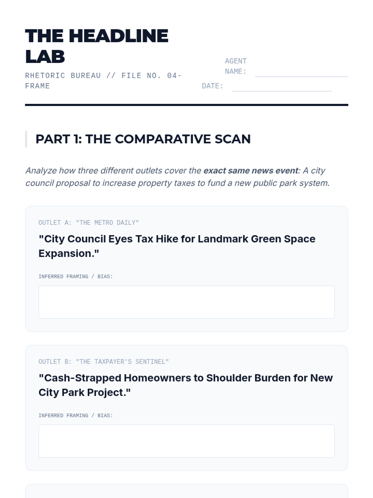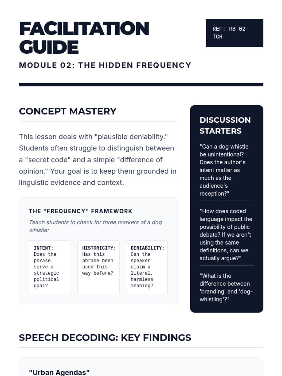 A high-level rhetoric sequence for undergraduate students focusing on the mechanics of inference in public discourse. Students explore enthymemes, coded language, satire, and media bias to understand how persuasion operates through what remains unsaid.