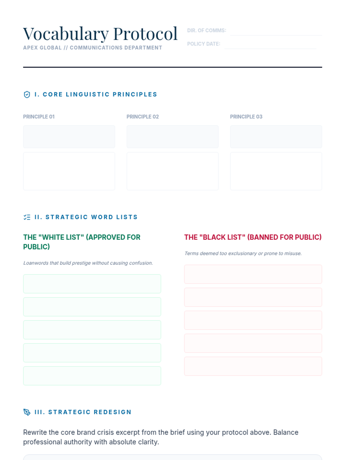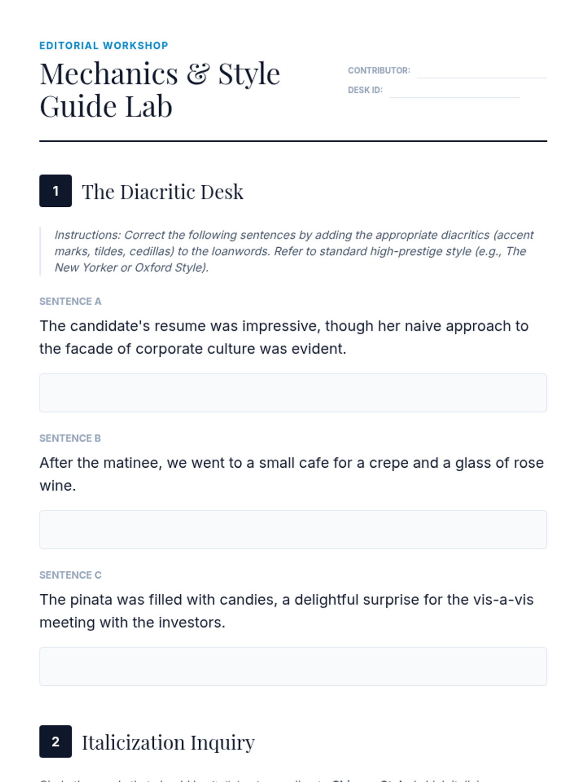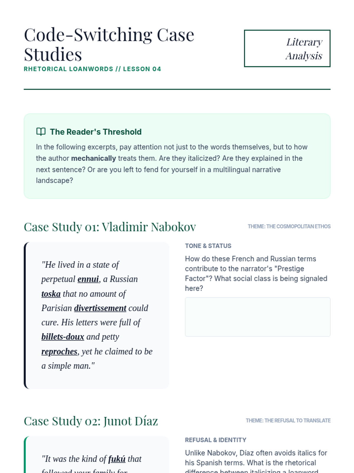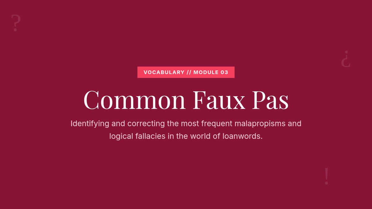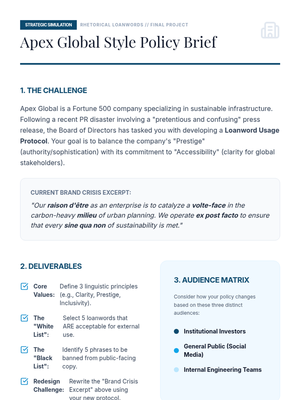 An advanced rhetorical study of foreign words and expressions in professional and literary contexts, focusing on the tension between prestige and alienation. Students move from technical mechanics and common misuses to analyzing code-switching in literature and designing corporate style policies.