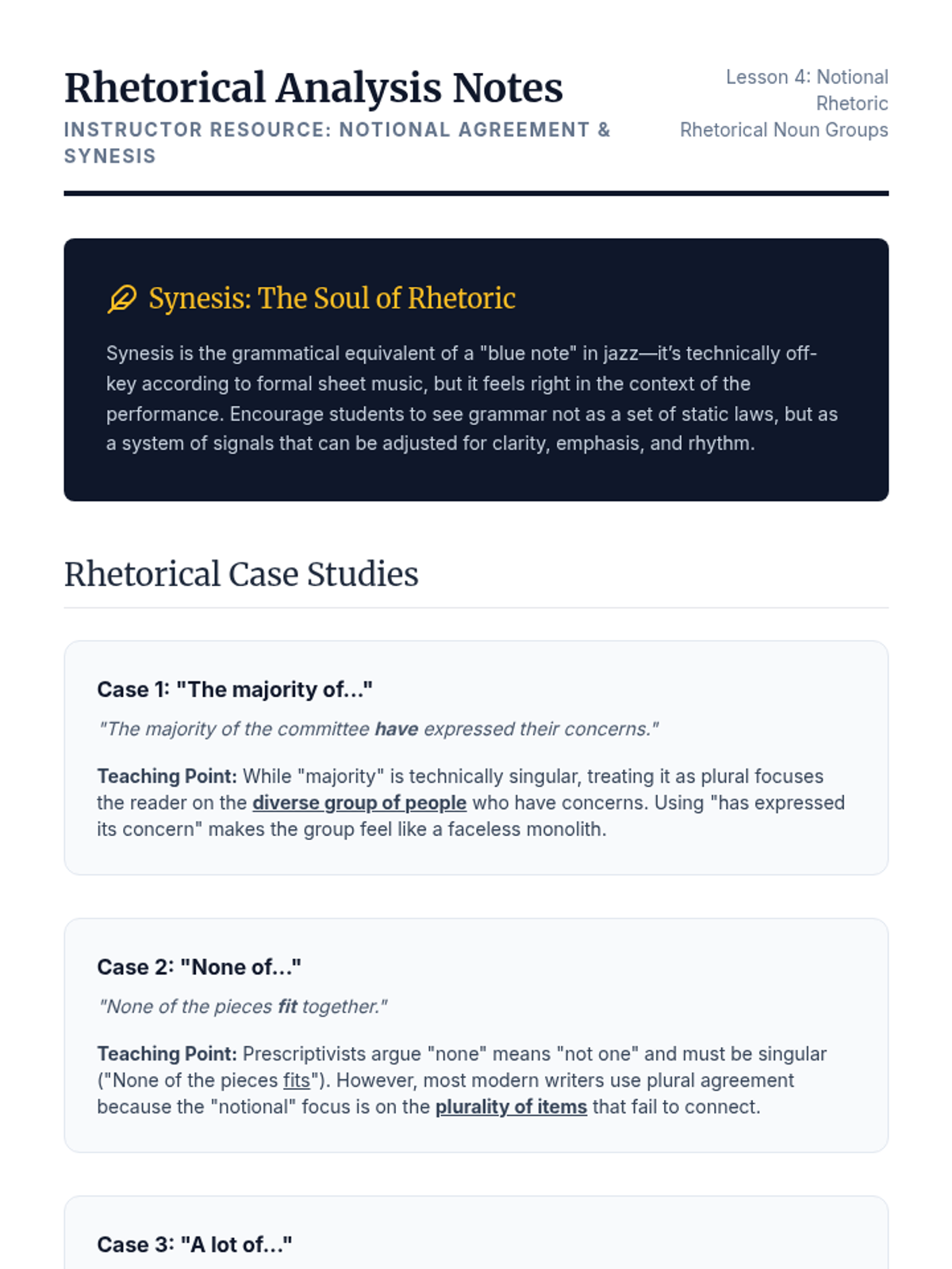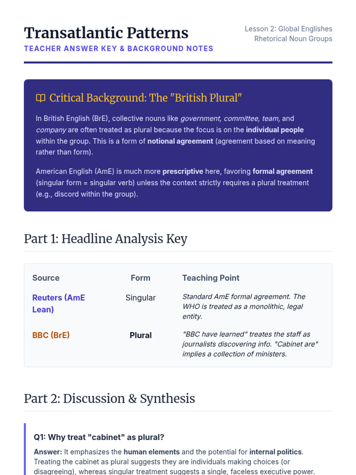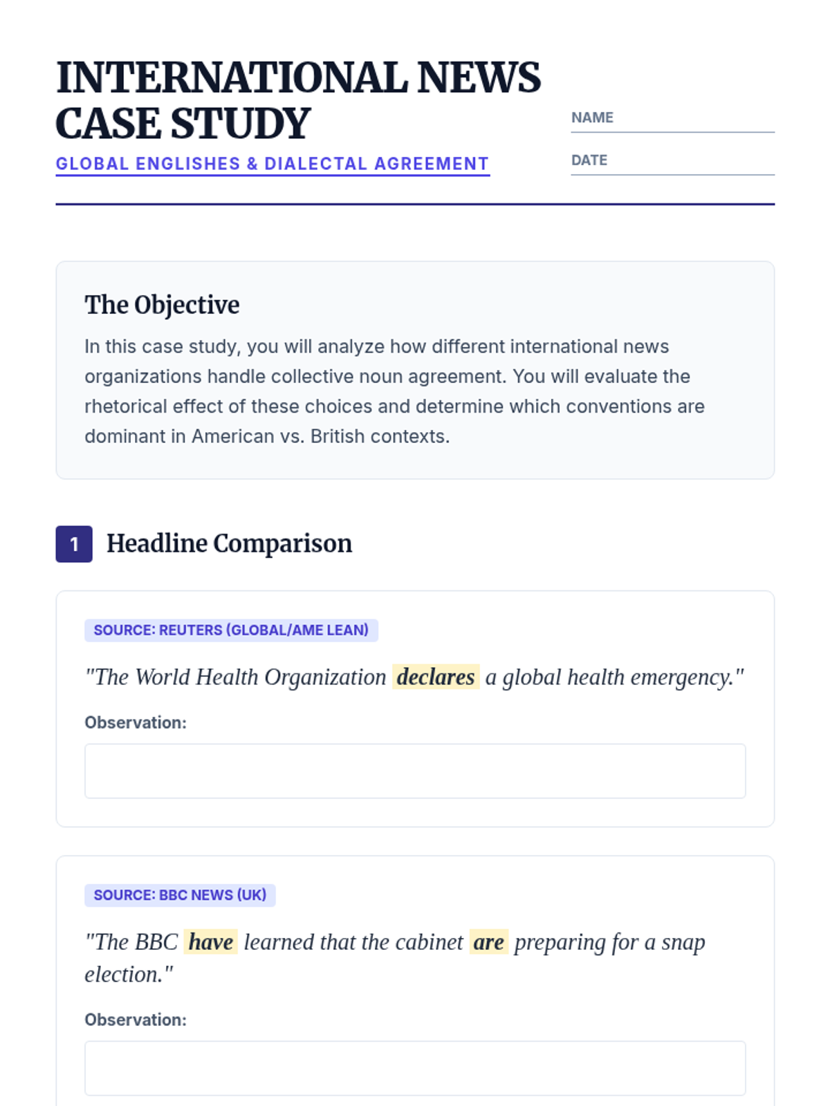 This sequence explores the nuances of collective nouns through a sociolinguistic and rhetorical lens, moving beyond simple rights and wrongs to explore usage variations. Students investigate differences between American and British English conventions and the concept of 'notional agreement' versus 'formal agreement,' empowering them to make intentional stylistic choices when treating groups as single units or collections of individuals.