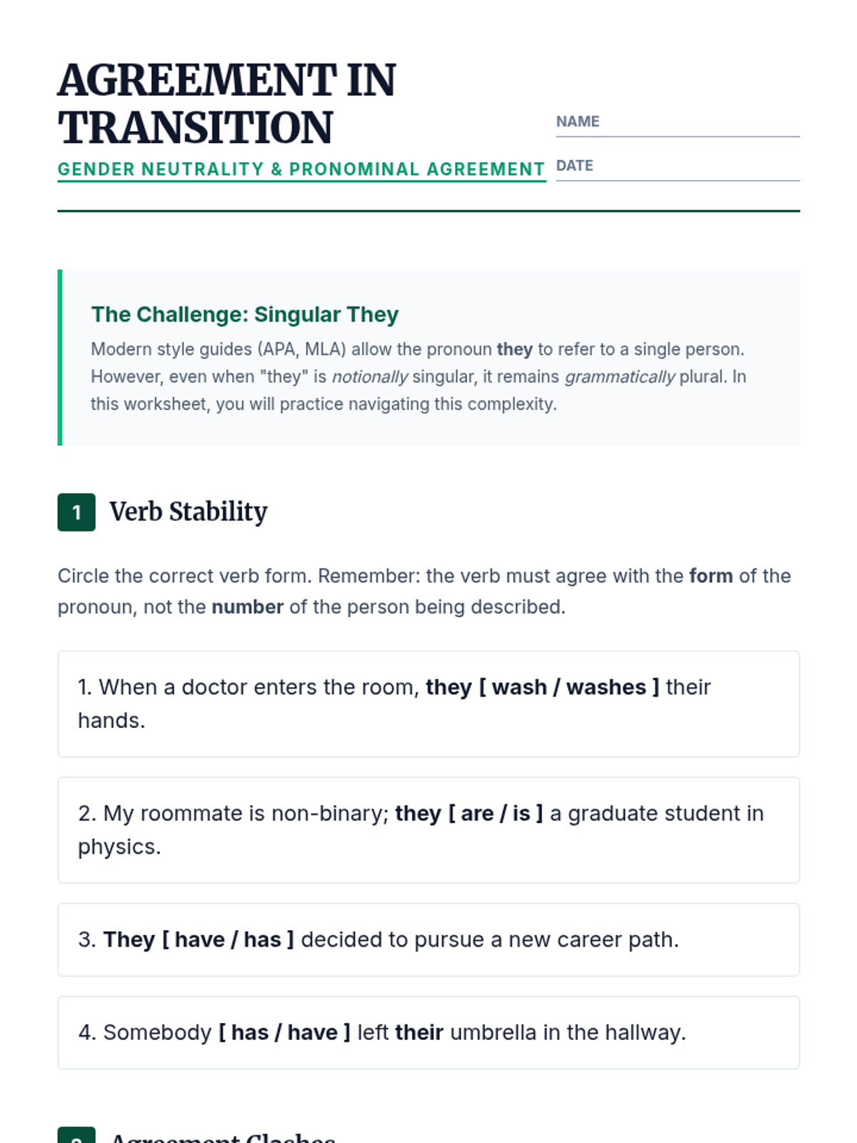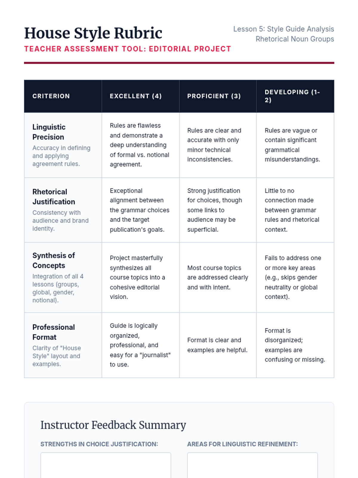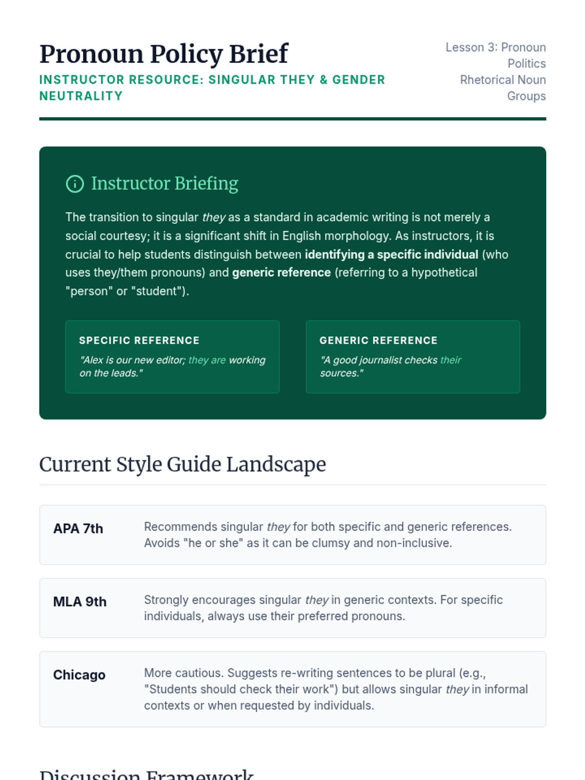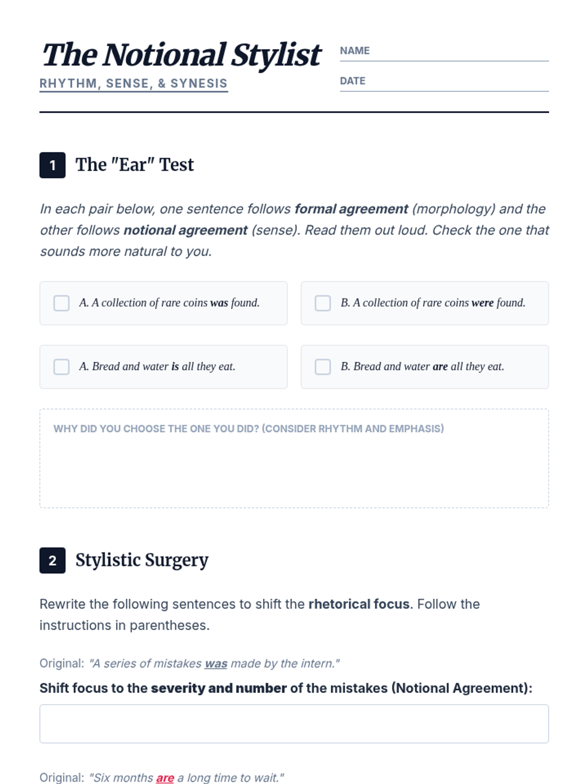 This sequence explores the nuances of collective nouns through a sociolinguistic and rhetorical lens, moving beyond simple rights and wrongs to explore usage variations. Students investigate differences between American and British English conventions and the concept of 'notional agreement' versus 'formal agreement,' empowering them to make intentional stylistic choices when treating groups as single units or collections of individuals.