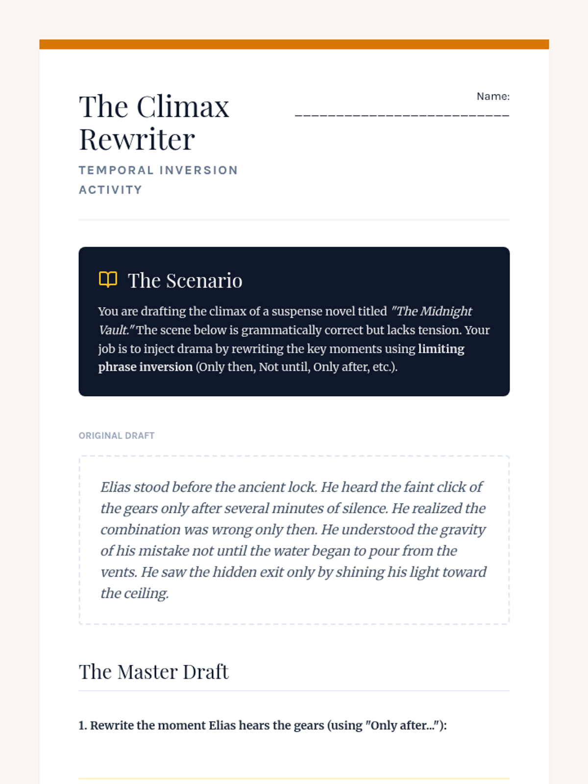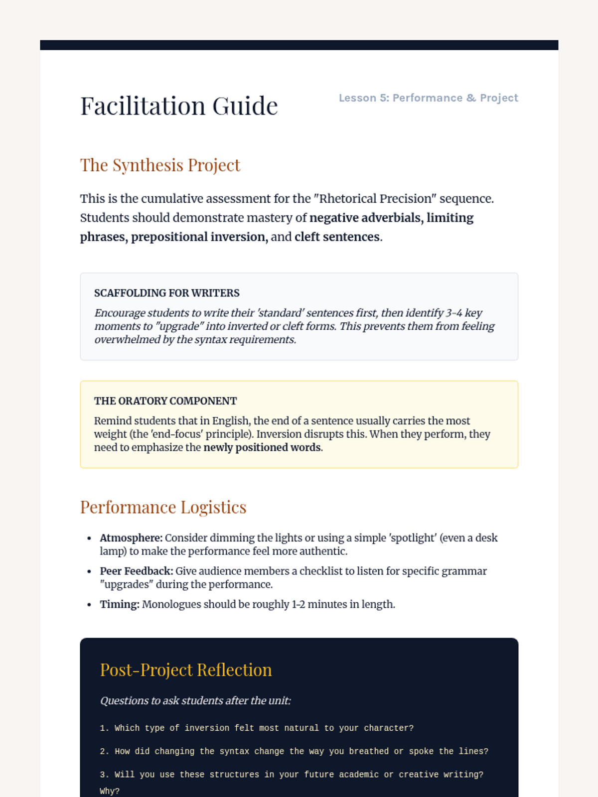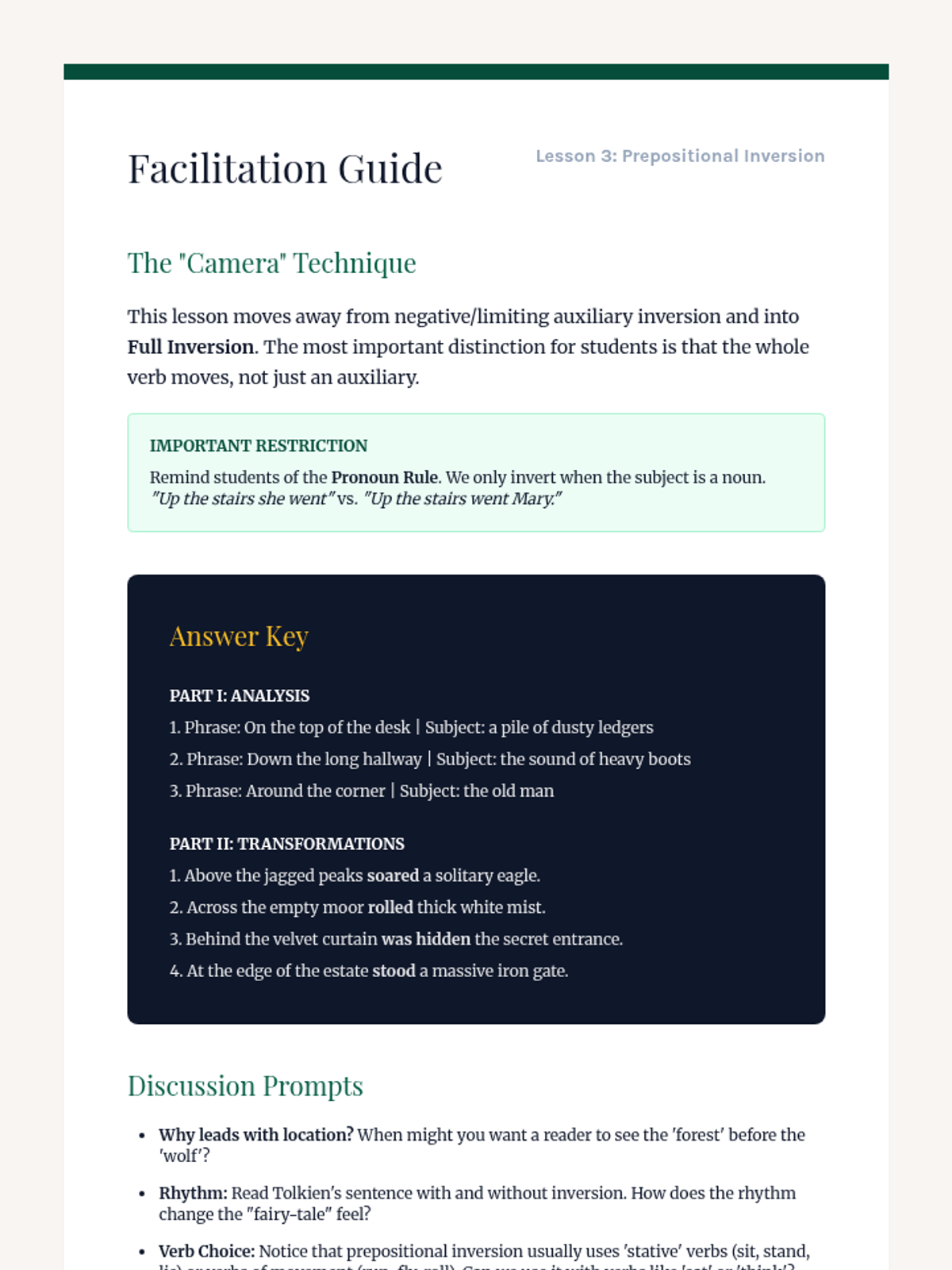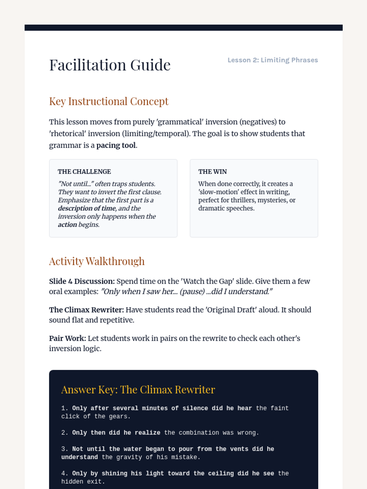 This workshop-style sequence focuses on the power of syntax manipulation, specifically inversion, to add emphasis and dramatic flair to writing. Students move from standard sentence structures to sophisticated inverted forms using negative adverbials, limiting phrases, and cleft sentences.