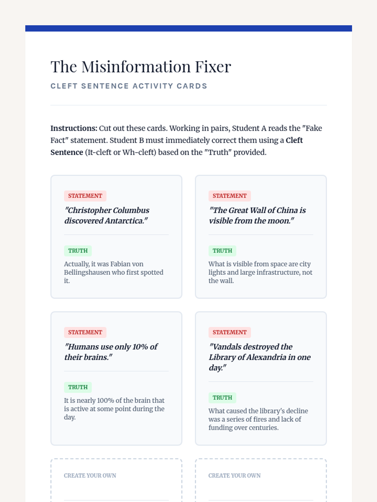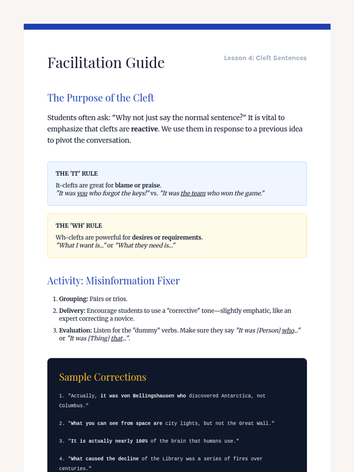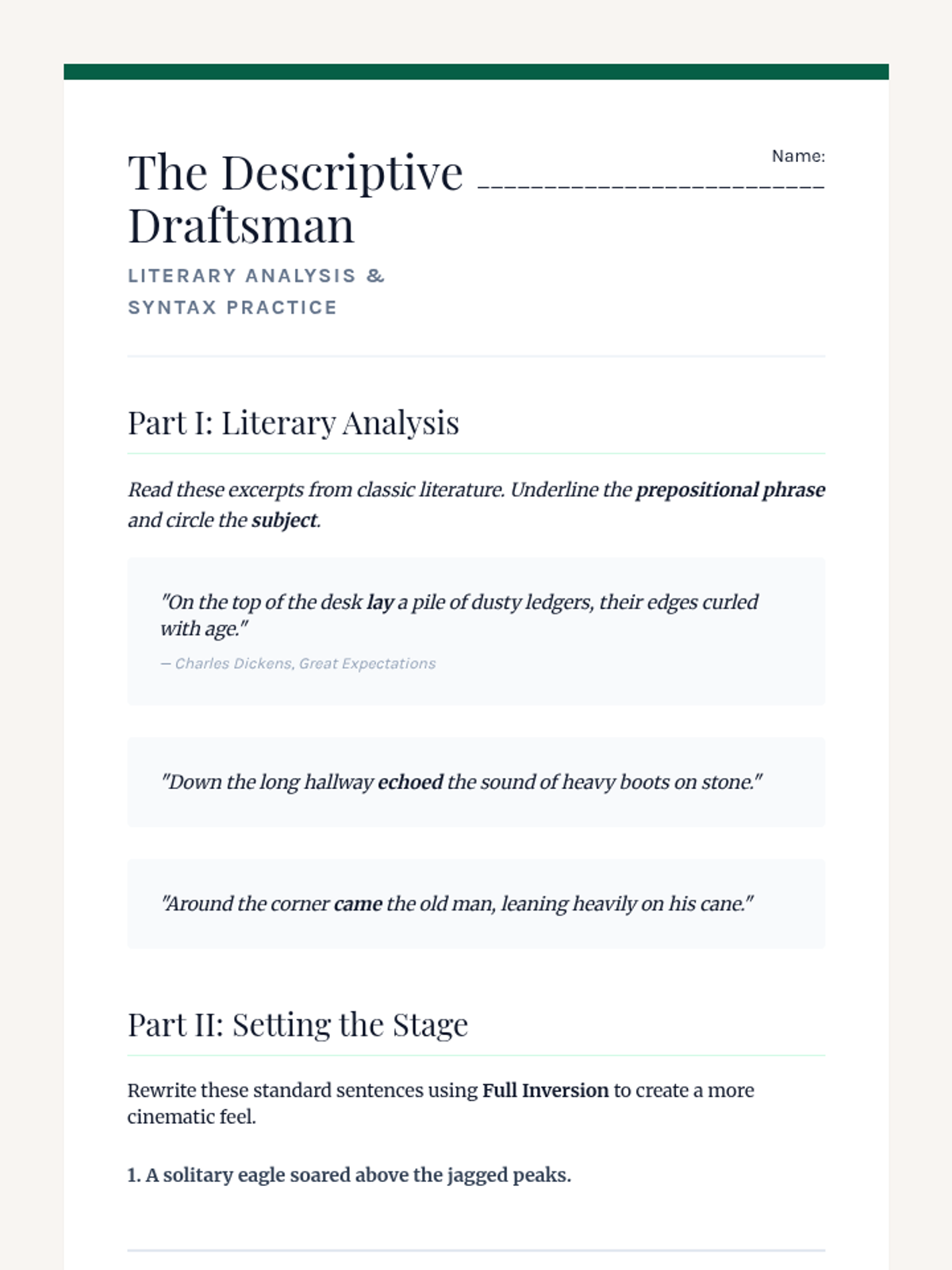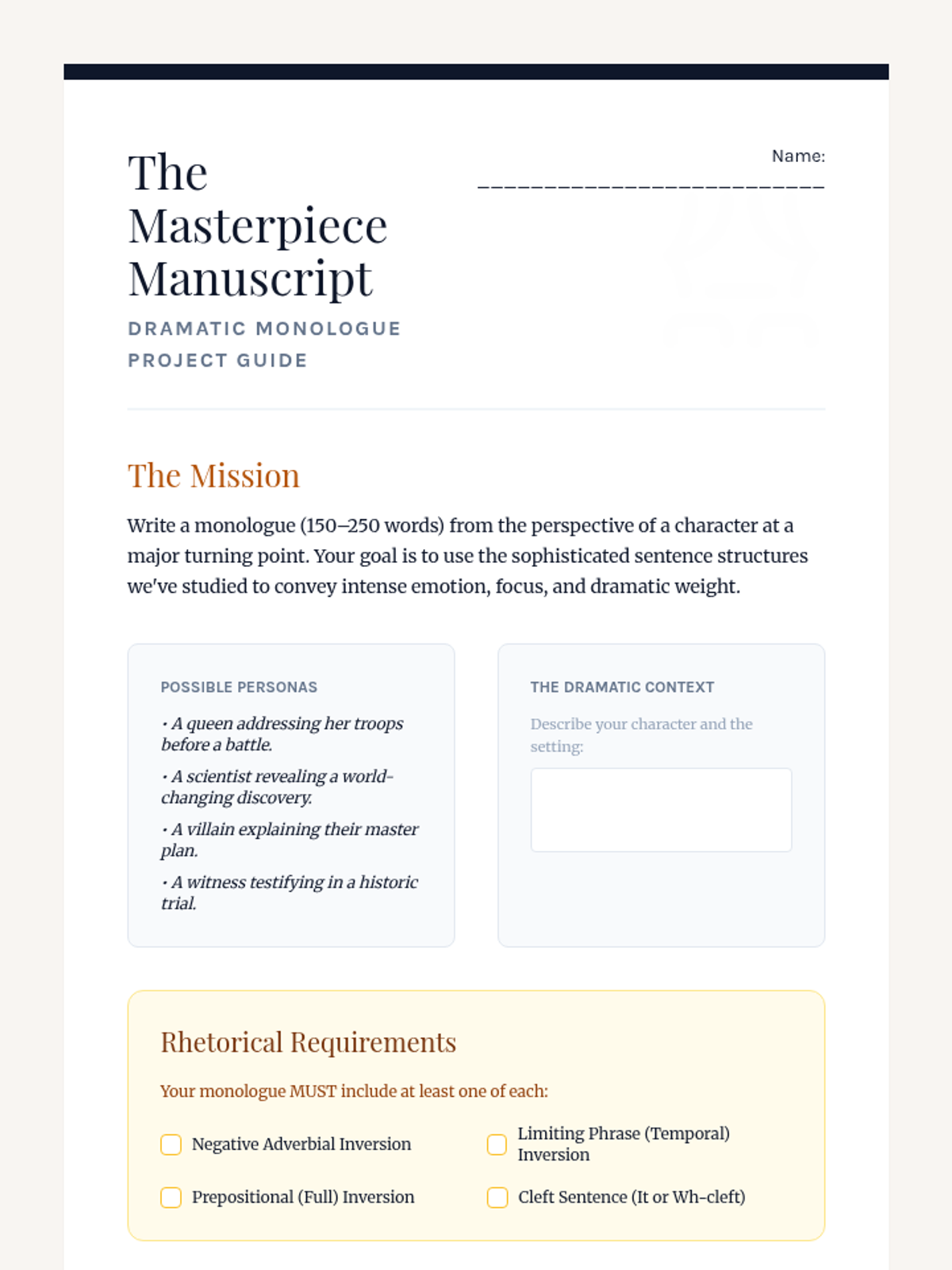 This workshop-style sequence focuses on the power of syntax manipulation, specifically inversion, to add emphasis and dramatic flair to writing. Students move from standard sentence structures to sophisticated inverted forms using negative adverbials, limiting phrases, and cleft sentences.