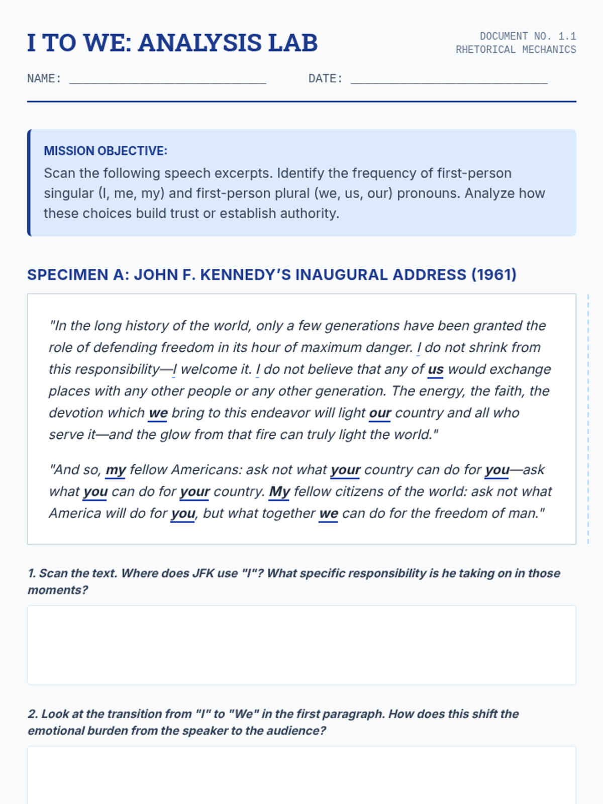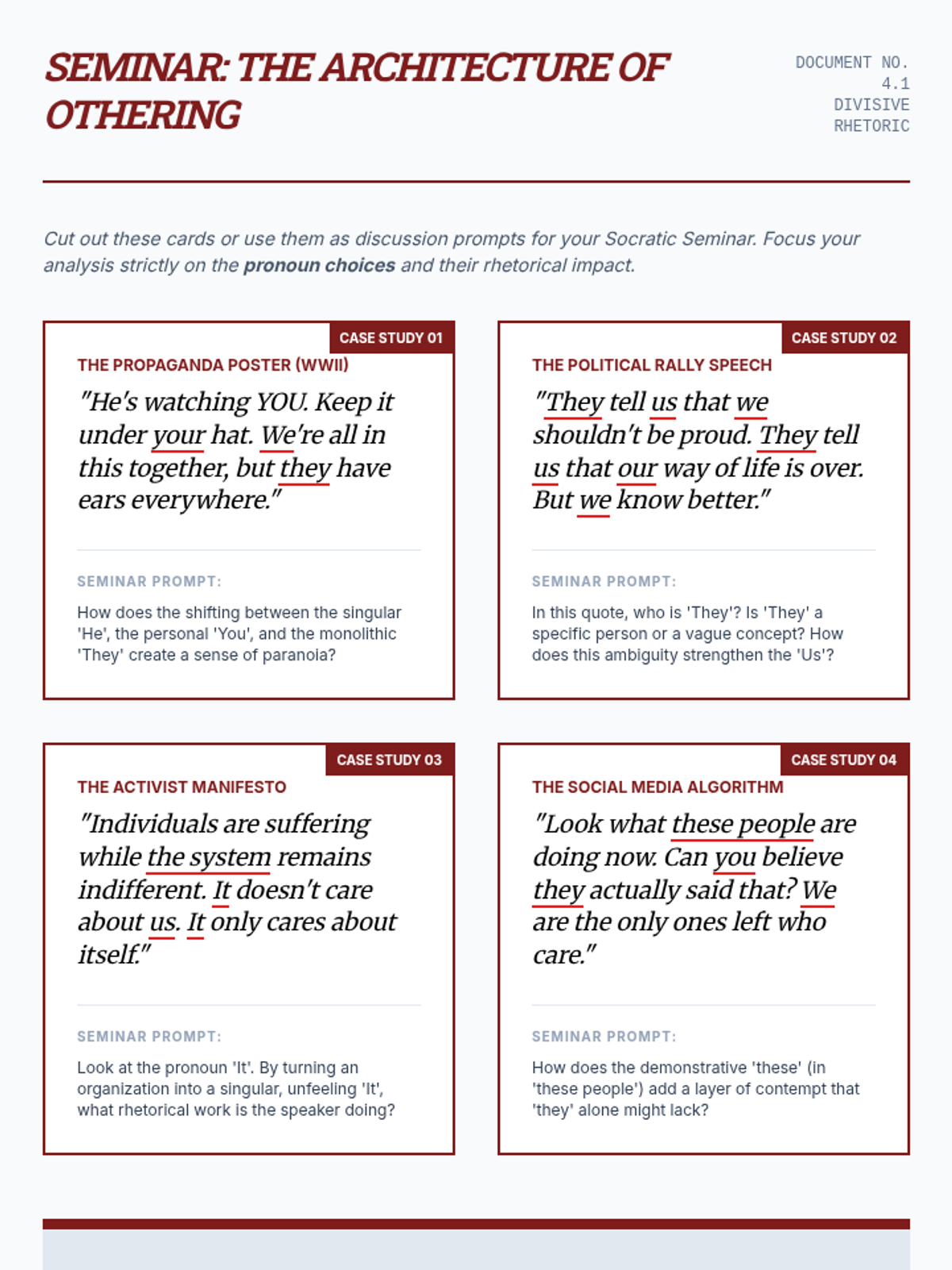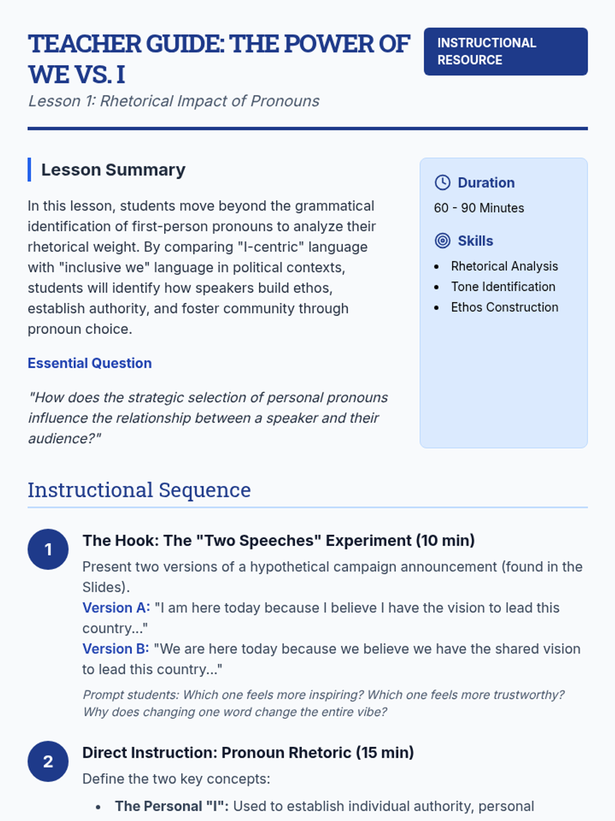 This inquiry-based sequence for 11th-grade ELA explores the rhetorical power of pronoun choices. Students analyze how shifting between first, second, and third person influences tone, inclusion, and persuasion in speeches, advertisements, and historical documents.