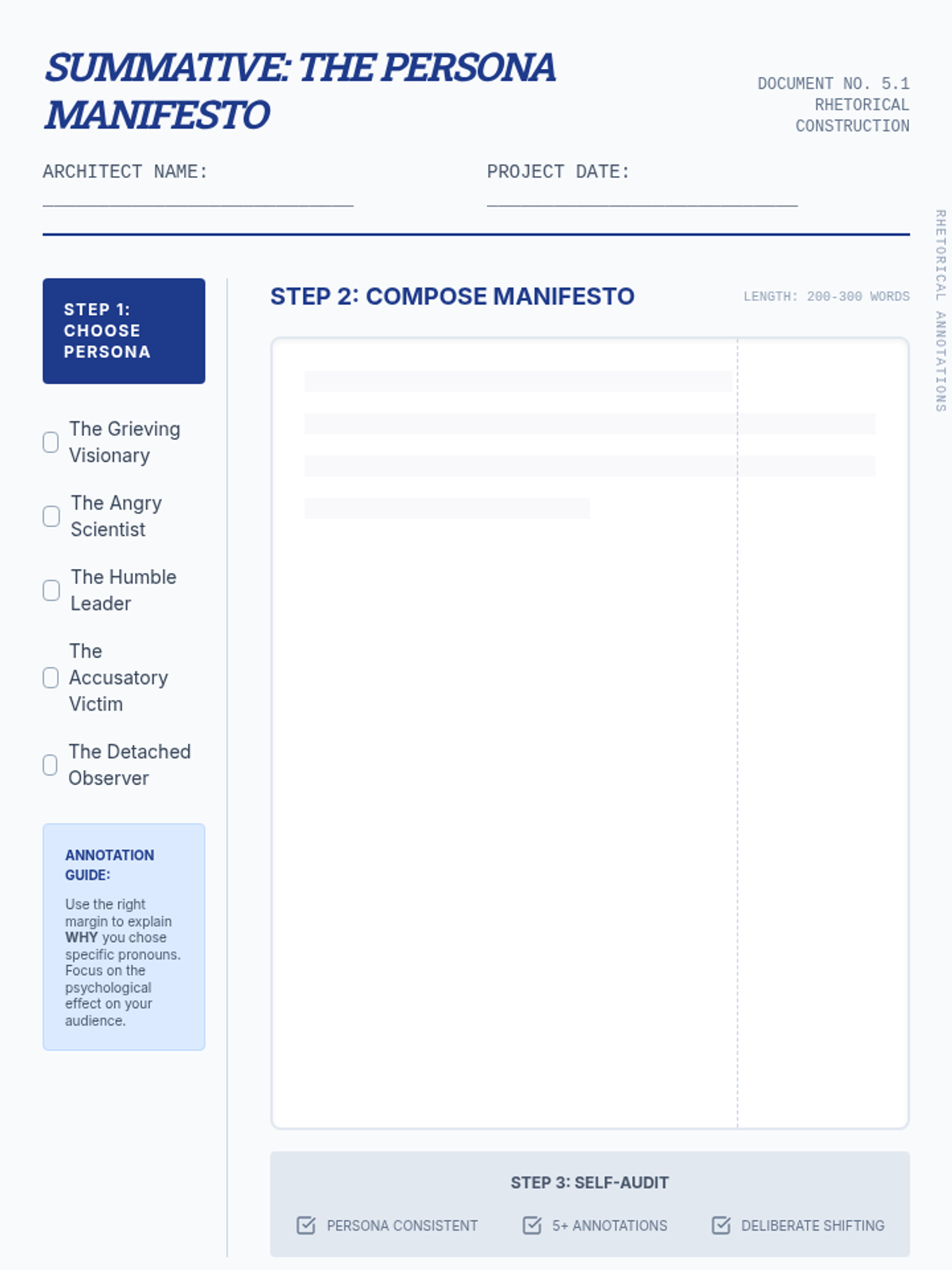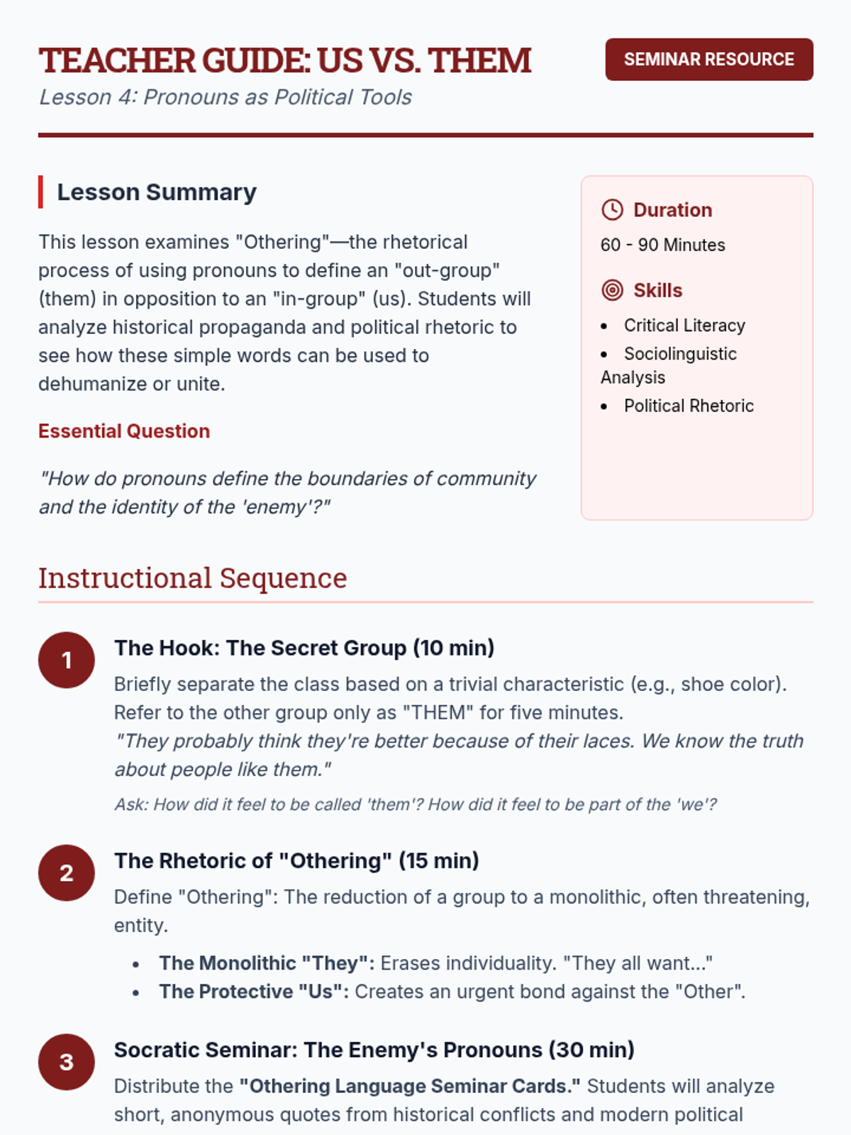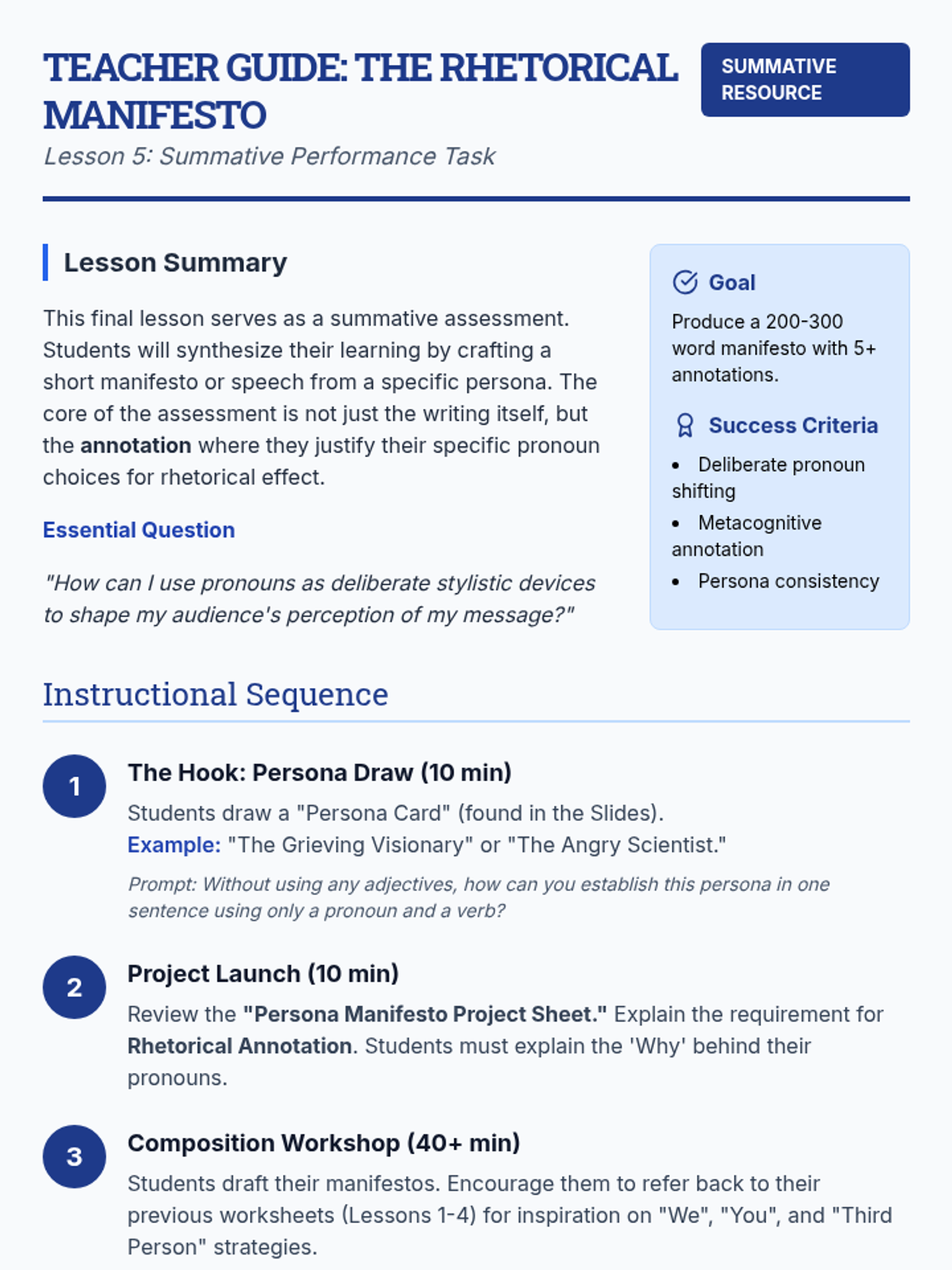 This inquiry-based sequence for 11th-grade ELA explores the rhetorical power of pronoun choices. Students analyze how shifting between first, second, and third person influences tone, inclusion, and persuasion in speeches, advertisements, and historical documents.