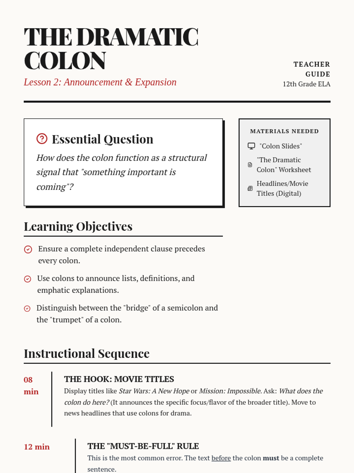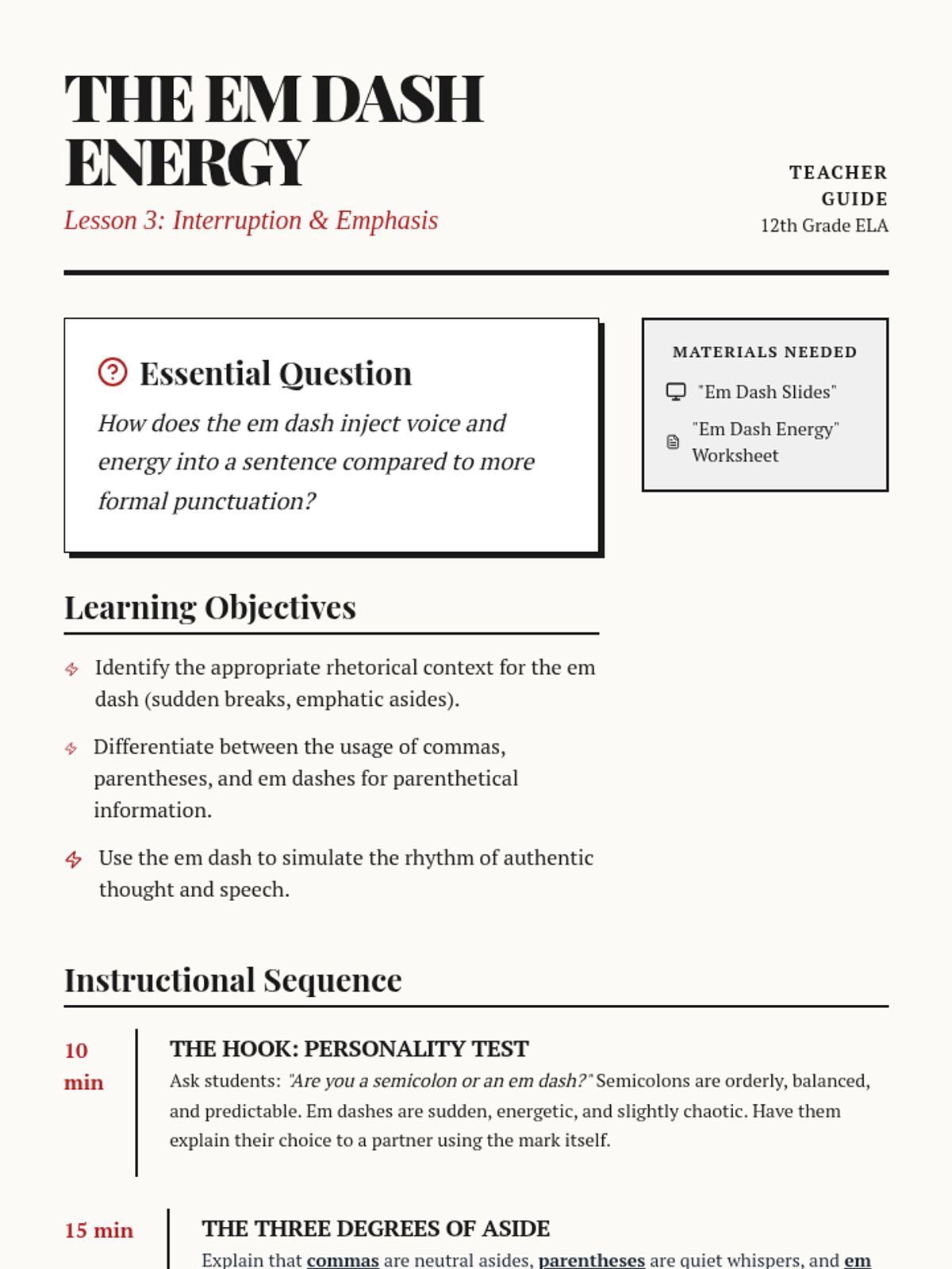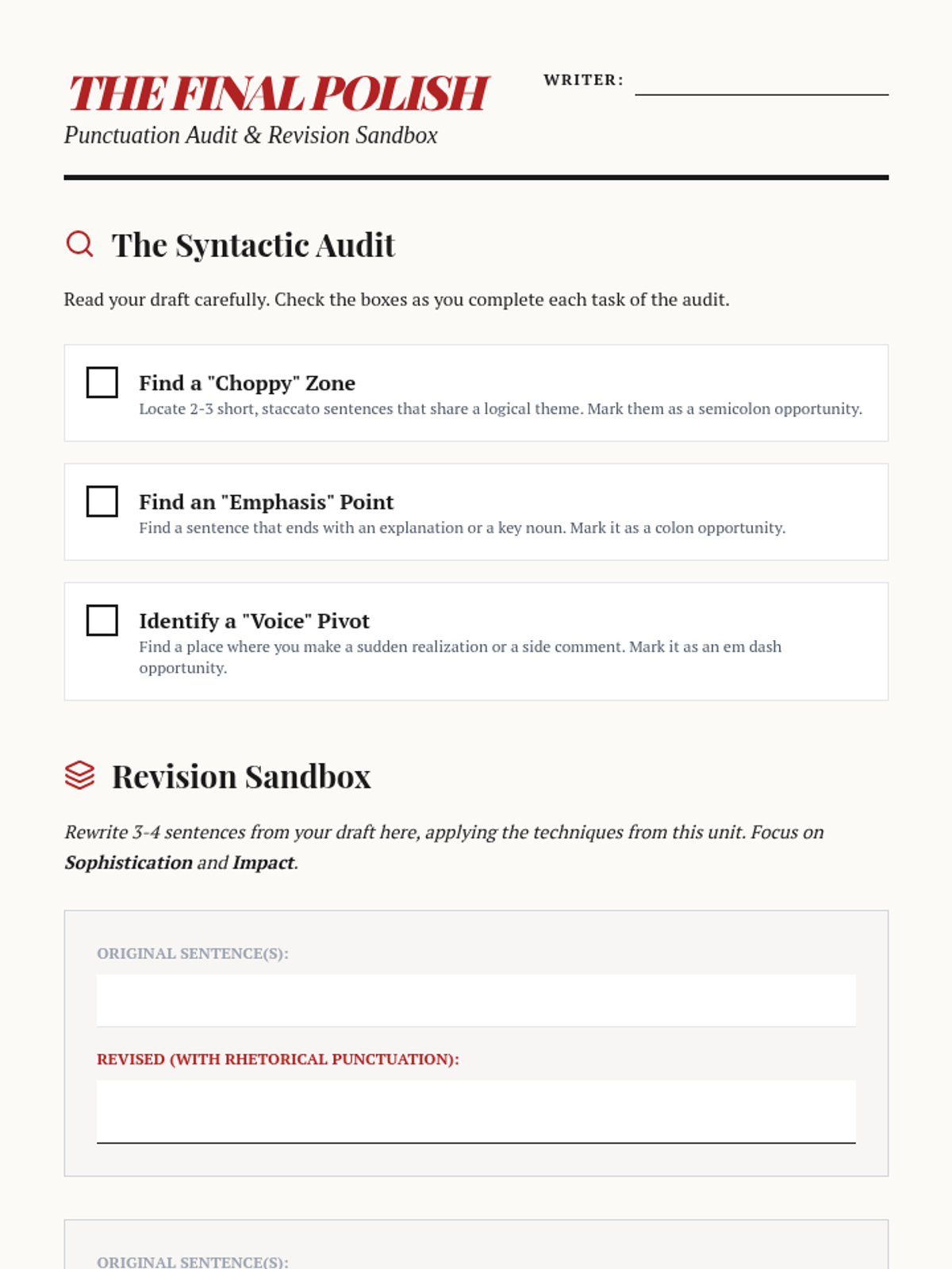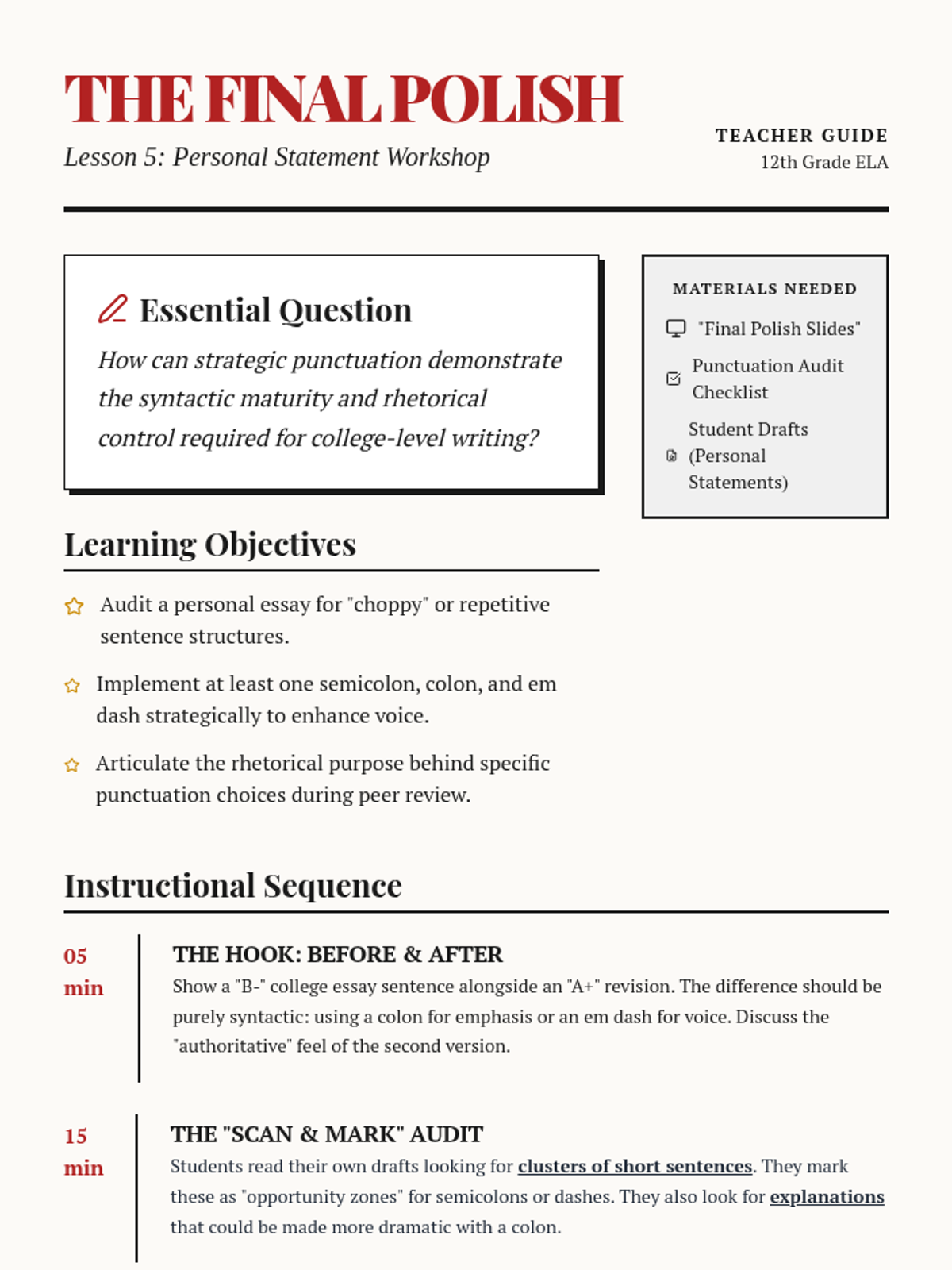 A high-level ELA unit for 12th graders exploring how advanced punctuation (semicolons, colons, and em-dashes) functions rhetorically to control pacing, rhythm, and emphasis in sophisticated writing, culminating in personal statement revision.