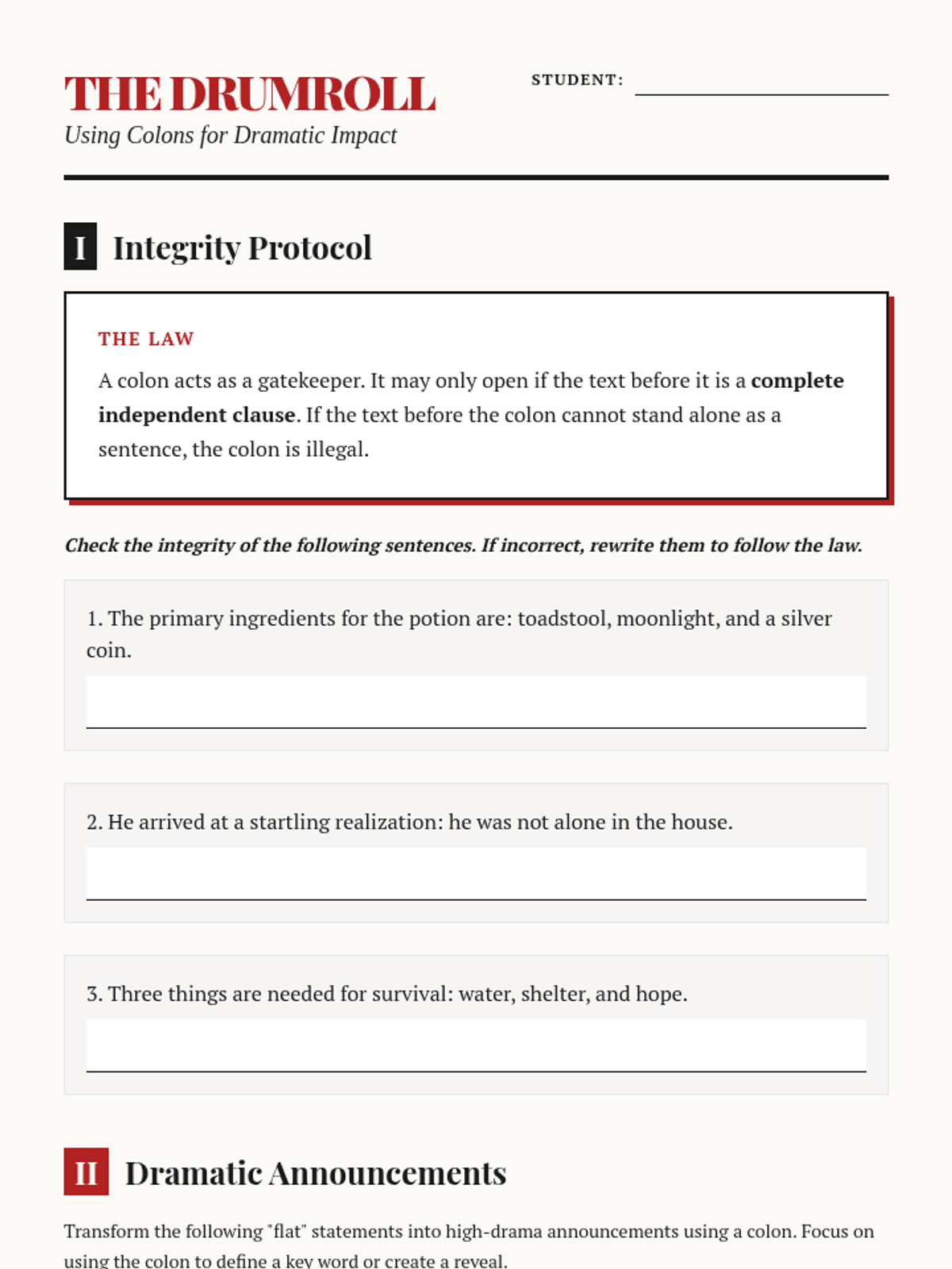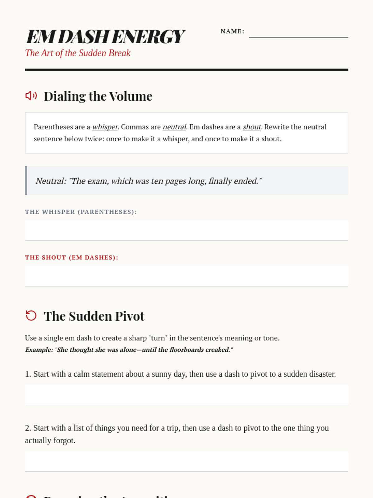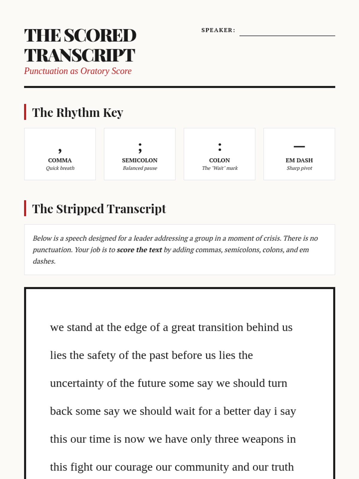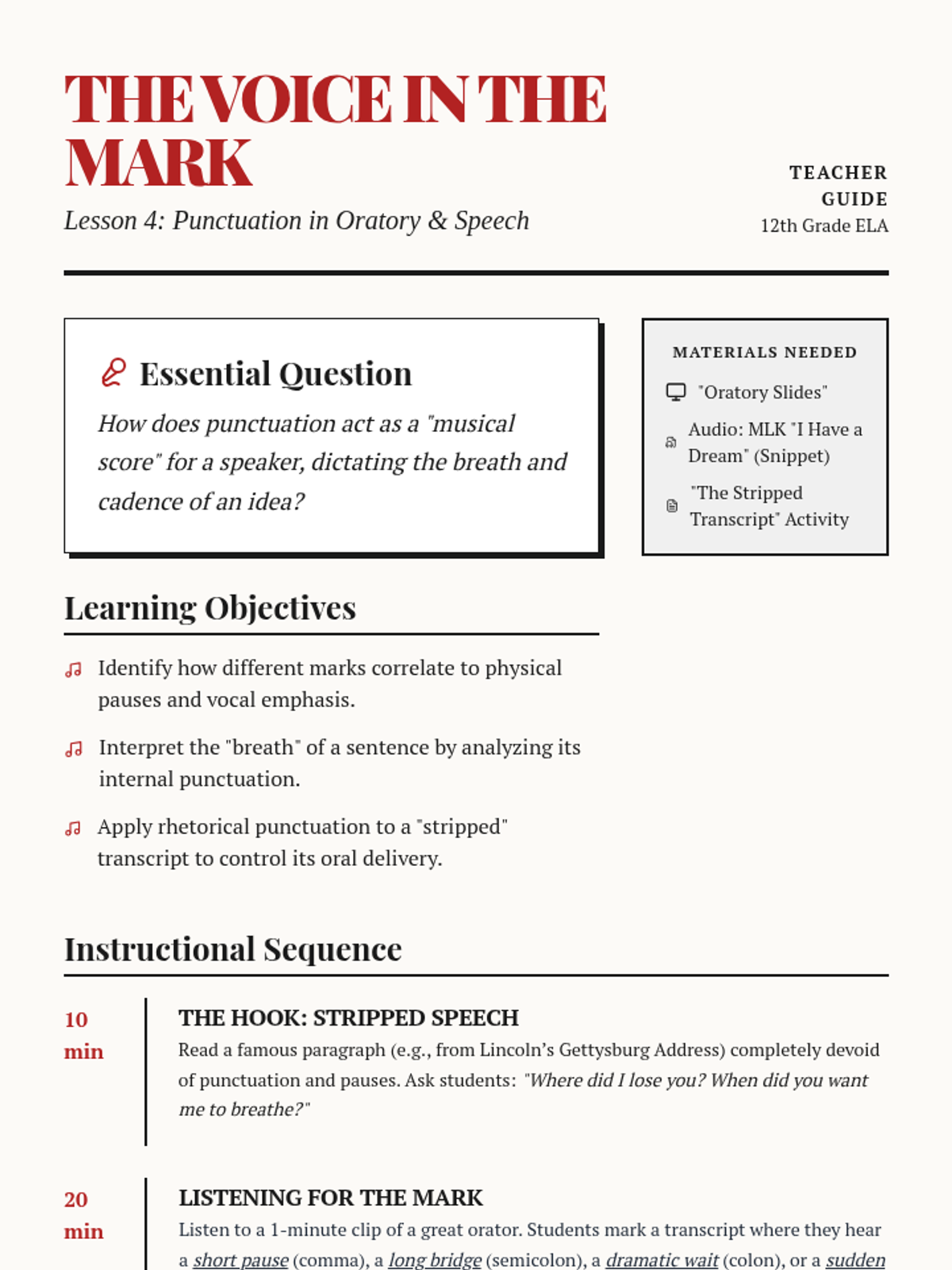 A high-level ELA unit for 12th graders exploring how advanced punctuation (semicolons, colons, and em-dashes) functions rhetorically to control pacing, rhythm, and emphasis in sophisticated writing, culminating in personal statement revision.
