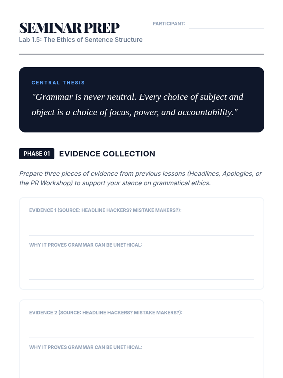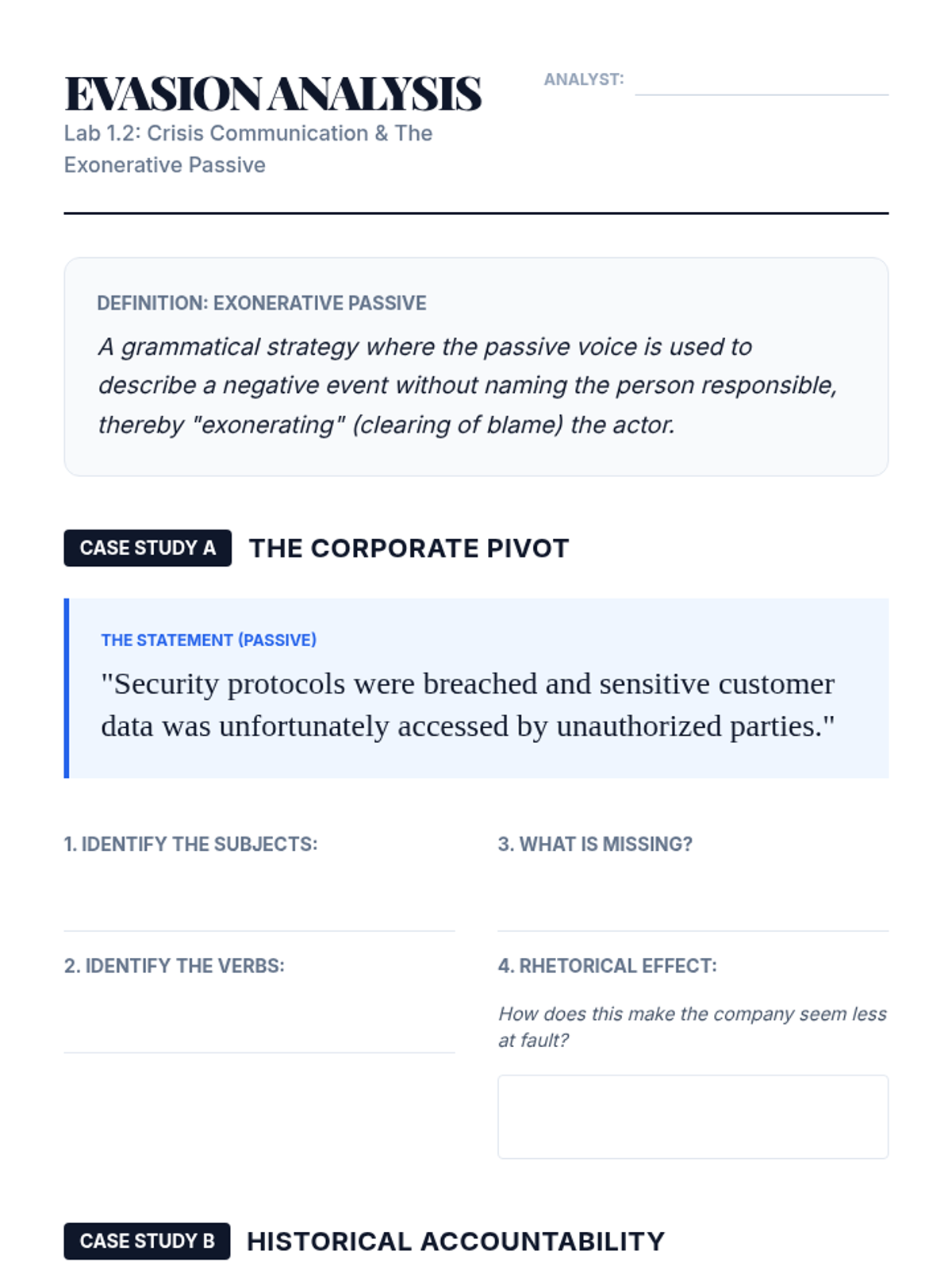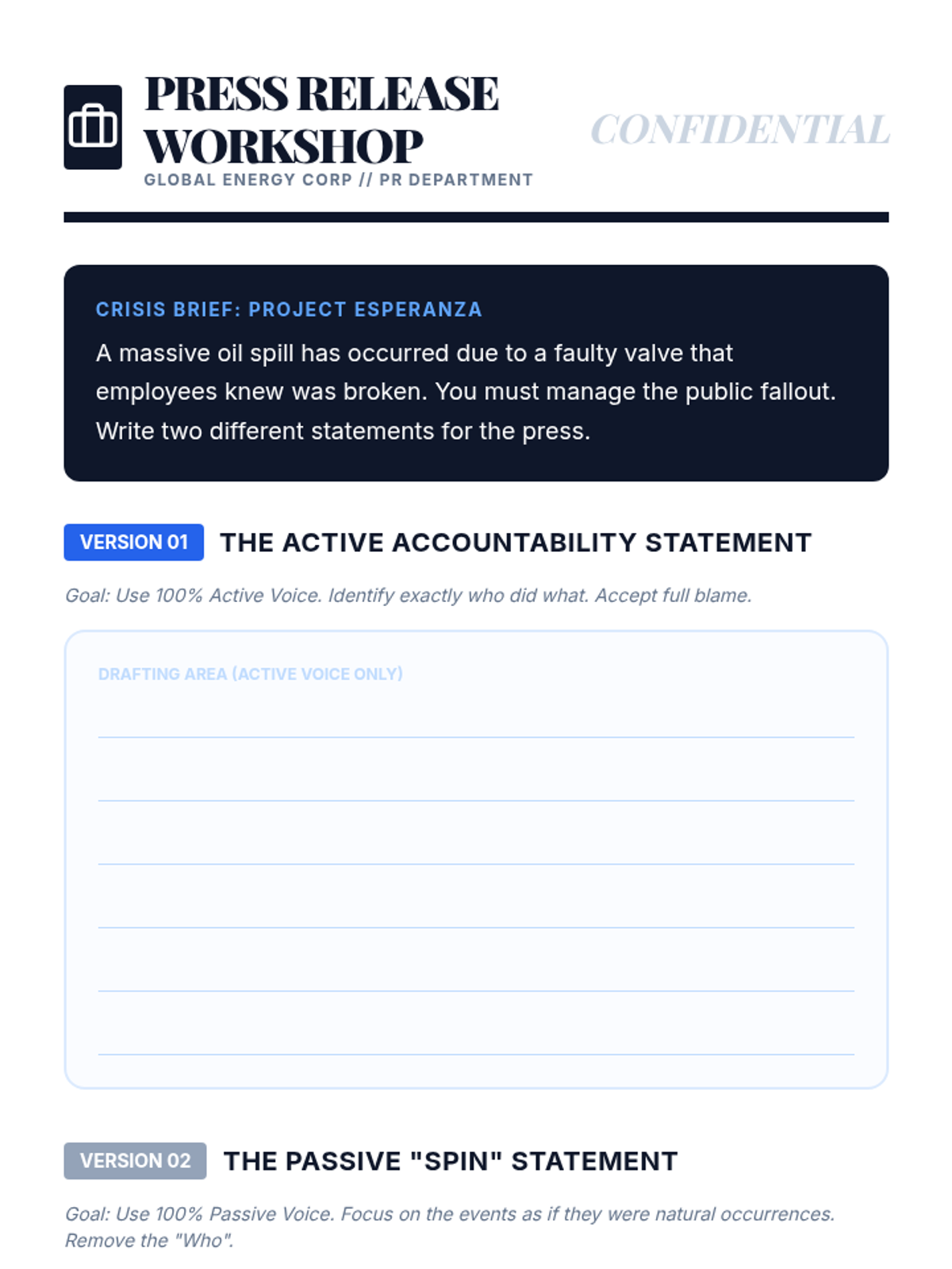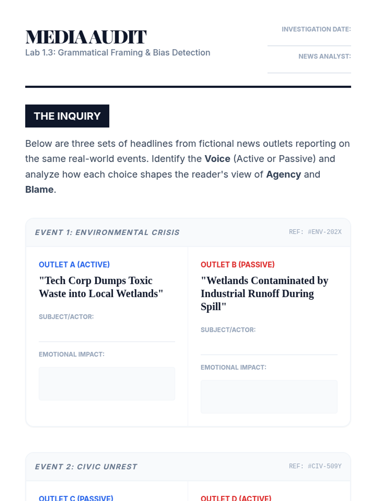 This sequence explores the rhetorical power of active and passive voice in media, politics, and public relations. Students move from basic grammatical mastery to analyzing how sentence structure can obscure agency, deflect responsibility, and shape public perception of truth and bias.