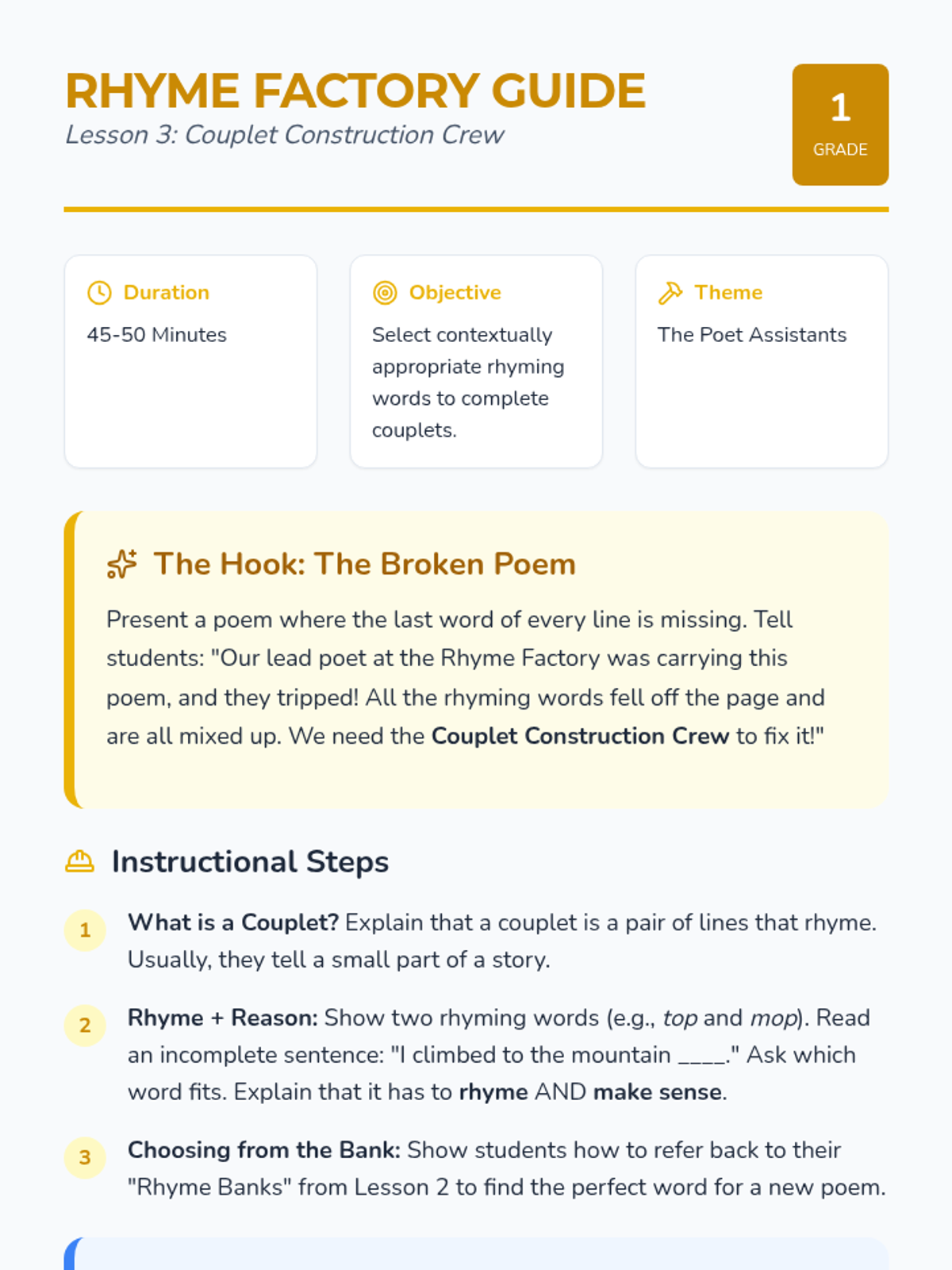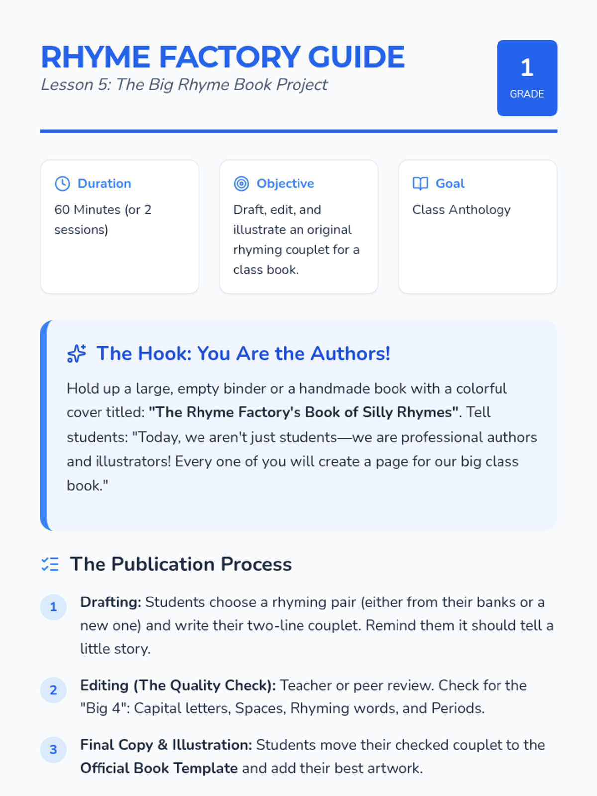 A 1st Grade sequence focused on moving from identifying rhymes to generating original rhyming poetry and sentences for creative expression. Students explore rhythm, build vocabulary, and culminate in a class-wide anthology of silly rhymes.